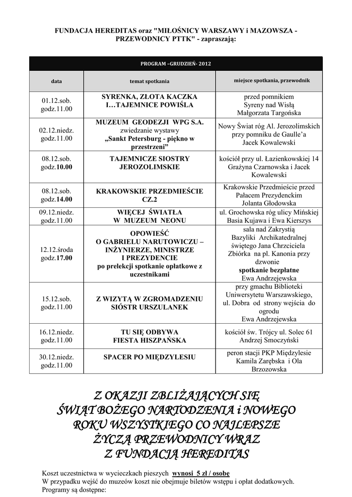 FUNDACJA HEREDITAS oraz "MIŁOŚNICY WARSZAWY i MAZOWSZA PRZEWODNICY PTTK" - zapraszają: PROGRAM –GRUDZIEŃ- 2012 data temat spotkania miejsce spotkania, przewodnik SYRENKA, ZŁOTA KACZKA I…TAJEMNICE POWIŚLA przed pomnikiem Syreny nad Wisłą Małgorzata Targońska 02.12.niedz. godz.11.00 MUZEUM GEODEZJI WPG S.A. zwiedzanie wystawy „Sankt Petersburg - piękno w przestrzeni” Nowy Świat róg Al. Jerozolimskich przy pomniku de Gaulle’a Jacek Kowalewski 08.12.sob. godz.10.00 TAJEMNICZE SIOSTRY JEROZOLIMSKIE kościół przy ul. Łazienkowskiej 14 Grażyna Czarnowska i Jacek Kowalewski 08.12.sob. godz.14.00 KRAKOWSKIE PRZEDMIEŚCIE CZ.2 09.12.niedz. godz.11.00 WIĘCEJ ŚWIATŁA W MUZEUM NEONU 12.12.środa godz.17.00 OPOWIEŚĆ O GABRIELU NARUTOWICZU – INŻYNIERZE, MINISTRZE I PREZYDENCIE po prelekcji spotkanie opłatkowe z uczestnikami 15.12.sob. godz.11.00 Z WIZYTĄ W ZGROMADZENIU SIÓSTR URSZULANEK 16.12.niedz. godz.11.00 TU SIĘ ODBYWA FIESTA HISZPAŃSKA 30.12.niedz. godz.11.00 SPACER PO MIĘDZYLESIU 01.12.sob. godz.11.00 Krakowskie Przedmieście przed Pałacem Prezydenckim Jolanta Głodowska ul. Grochowska róg ulicy Mińskiej Basia Kujawa i Ewa Kierszys sala nad Zakrystią Bazyliki Archikatedralnej świętego Jana Chrzciciela Zbiórka na pl. Kanonia przy dzwonie spotkanie bezpłatne Ewa Andrzejewska przy gmachu Biblioteki Uniwersytetu Warszawskiego, ul. Dobra od strony wejścia do ogrodu Ewa Andrzejewska kościół św. Trójcy ul. Solec 61 Andrzej Smoczyński peron stacji PKP Międzylesie Kamila Zarębska i Ola Brzozowska Z OKAZJI ZBLIŻAJĄCYCH SIĘ ŚWIĄT BOŻEGO NARTODZENIA i NOWEGO ROKU WSZYSTKIEGO CO NAJLEPSZE ŻYCZĄ PRZEWODNICY WRAZ Z FUNDACJĄ HEREDITAS Koszt uczestnictwa w wycieczkach pieszych wynosi 5 zł / osobę W przypadku wejść do muzeów koszt nie obejmuje biletów wstępu i opłat dodatkowych. Programy są dostępne: - w biurze "Fundacji Hereditas" ul. Marszałkowska 4/4, - w PTTK ul. Podwale 23 - I p - http://spacerypowarszawie.republika.pl , spacerypowarszawie.bloog.pl http://spacery-po-warszawie-blog.onet.pl http://fundacja-hereditas.pl - oraz u przewodników podczas wycieczek. KONTAKT: 606-803-280 Osoby zainteresowane otrzymywaniem naszych programów za pośrednictwem internetu, prosimy o przesłanie swoich adresów mailowych do skrzynki [email protected]. www.fundacja-hereditas.pl