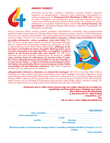 DRODZY CHORZY! Zwracamy się do Was z prośbą o modlitwę w intencji młodych. Jesteśmy wdzięczni za zaangażowanie i wsparcie, które dotychczas odczuwaliśmy w trakcie przygotowań do Światowych Dni Młodzieży w 2016 roku. Dziękujemy Wam za dzielenie się świadectwami życia i cierpienia. Zapewniamy też o codziennej modlitwie polecając Wasze intencje Bogu. We wszystkich naszych działaniach o szczególne wstawiennictwo prosimy św. siostrę Faustynę i św. Jana Pawła II - Apostołów Bożego Miłosierdzia i patronów Światowych Dni Młodzieży w Krakowie. Siostra Faustyna, której rocznicę urodzin niedawno obchodziliśmy, otrzymała misję przypomnienia współczesnemu światu tajemnicy Bożego Miłosierdzia objawionej w życiu, śmierci i zmartwychwstaniu Chrystusa. Św. Faustyna pozostawiła nam swój osobisty duchowy Dzienniczek, odsłaniający największe tajemnice Boga. Przez jej ręce Jezus „podał ludziom naczynie, z którym mają przychodzić po łaski do źródła miłosierdzia - obraz z podpisem: „Jezu ufam Tobie” (Dz. 327). Chrystus złożył wiele obietnic czcicielom miłosierdzia Bożego, których wypełnienie potwierdzają świadectwa spływające do sióstr ze Zgromadzenia Sióstr Matki Bożej Miłosierdzia. „Obiecuję, że dusza, która czcić będzie ten obraz, nie zginie. Obiecuję także, już tu na ziemi, zwycięstwo nad nieprzyjaciółmi, a szczególnie w godzinę śmierci. Ja sam bronić ją będę, jako swej chwały” (Dz. 48). Jezus ofiarował nam także Koronkę, podyktowaną św. Faustynie: „Córko moja, zachęcaj dusze do odmawiania tej koronki, którą Ci podałem. Przez odmawianie tej koronki podoba mi się dać wszystko, o co mnie prosić będą. (…) Gdy tę koronkę przy konającym odmawiać będą, stanę pomiędzy Ojcem a duszą konającą nie jako Sędzia sprawiedliwy, ale jako Zbawiciel miłosierny” (Dz. 1541). Pragniemy zachęcić Was do odmawiania tej modlitwy. „Błogosławieni miłosierni, albowiem oni miłosierdzia dostąpią” (Mt 5,7) to nie tylko hasło ŚDM w Krakowie, ale także zadanie postawione Kościołowi przez Ojca Świętego Franciszka. Ogłoszony przez niego Nadzwyczajny Święty Rok Miłosierdzia rozpocznie się 8 grudnia br. w uroczystość Niepokalanego Poczęcia NMP, a zakończy 20 listopada 2016 roku w uroczystość Jezusa Chrystusa Króla Wszechświata. Papież wzywa nas do szczególnej kontemplacji tej tajemnicy, jako źródła radości, ukojenia i pokoju. Zachęca do wpatrywania się w Jego łaskę by być Miłosiernymi jak Ojciec (Łk 6,36). Zachęcamy aby Ci z Was, którzy jeszcze tego nie zrobili, włączyli się w projekt L4, wypełniając poniższą deklarację i odsyłając ją na adres: Biuro Światowych Dni Młodzieży ul. Kanonicza 18, 31 – 002 Kraków z dopiskiem: „L4” lub: lub na adres e-mail: [email protected] -- - - - - - - - - - - - - - - - - - - - - - - - - - - - - - - - - - - - - - - - - - - - - - - - - - - - - - - - - - - - - - - - - - - - - - - - - - - - - - - DEKLARACJA imię i nazwisko: _ _ _ _ _ _ _ _ _ _ _ _ _ _ _ _ _ _ _ _ _ _ _ _ _ _ _ _ _ _ _ _ _ _ _ _ adres zamieszkania: _ _ _ _ _ _ _ _ _ _ _ _ _ _ _ _ _ _ _ _ _ _ _ _ _ _ _ _ _ _ _ _ _ _ _ _ _ _ _ _ _ e-mail: _ _ _ _ _ _ _ _ _ _ _ _ _ _ _ _ _ _ _ _ _ _ _ _ parafia: _ _ _ _ _ _ _ _ _ _ _ _ _ _ _ _ _ diecezja: _ _ _ _ _ _ __ _ _ _ _ _ _ _ _ _ rok urodzenia: _ _ _ _ _ _ _ _ _ _ _ _ _ _ _ _ _ Wyrażam zgodę na umieszczenie mojego imienia i nazwiska w Księdze Modlitwy Chorych (tak/nie) podpis_ _ _ _ _ _ _ _ _ _ _ _ _ _ _ _ imię i nazwisko CUDOWNE PRZEBUDZENIE Teatr był moją pasją. Jako studentka filologii polskiej Uniwersytetu Jagiellońskiego, specjalność teatrologia, otrzymałam stypendium od rządu amerykańskiego. Przed odlotem do Stanów Zjednoczonych zabrałam z Sanktuarium Miłosierdzia Bożego w Krakowie - Łagiewnikach obrazki Pana Jezusa Miłosiernego z tekstem Koronki do Miłosierdzia Bożego i obrazki św. siostry Faustyny, by rozdać je studentom. Pochłonięta zajęciami na uczelni, nie zaniedbywałam życia religijnego. W każdą niedzielę, a czasem częściej, uczestniczyłam w Eucharystii w katolickim kościele akademickim. Po pierwszym semestrze studiów, 5 lutego 2003 roku, gdy wraz z kolegą i koleżankami jechaliśmy samochodem doszło do wypadku. Uderzył w nas duży samochód. Doznałam bardzo ciężkich obrażeń głowy. Mój stan był tak ciężki, że nie rozpoczęto nawet operacji. Dopiero po przylocie mojej mamy do USA usunięto mi część mózgu odpowiadającą za mowę oraz połowę czaszki. Znajdowałam się wówczas w całkowitej śpiączce, a życie moje podtrzymywał respirator. Mama przed przylotem do USA bardzo długo modliła się przed cudownym obrazem Pana Jezusa Miłosiernego w Łagiewnikach i przy relikwiach św. Siostry Faustyny. Moja babcia, która ma już 90 lat, modliła się na różańcu i odmawiała Koronkę do Miłosierdzia Bożego, którą Pan Jezus podyktował Siostrze Faustynie. Modlili się też za mnie moi przyjaciele w Krakowie i Częstochowie, a także koleżanki i koledzy w Stanach Zjednoczonych. Przez cztery tygodnie pozostawałam w śpiączce. Lekarze nie dawali żadnej nadziei na wybudzenie. Mimo takiej diagnozy moja mama i przyjaciele nie ustawali w modlitwie. Mama umieściła nad moją głową obraz Jezusa Miłosiernego i św. siostry Faustyny, którą błagała o wstawiennictwo. Po miesiącu śpiączki, któregoś dnia wieczorem, gdy jak zwykle na modlitwie czuwała przy mnie mama, nagle się obudziłam. Lekarze nie mogli uwierzyć w to, co się stało. Dla wszystkich, którzy wiedzieli o moim tragicznym wypadku i towarzyszyli mi poprzez modlitwę, był to znak cudownego przebudzenia. Otrzymałam od Pana Boga nie tylko dar samoistnego wybudzenia ze śpiączki, ale także dar mowy i to w dwóch językach, mimo braku tej części mózgu, który za mowę odpowiada. Mogłam powiedzieć: Jezu, dziękuję Ci z całego serca! Przeszłam potem jeszcze sied