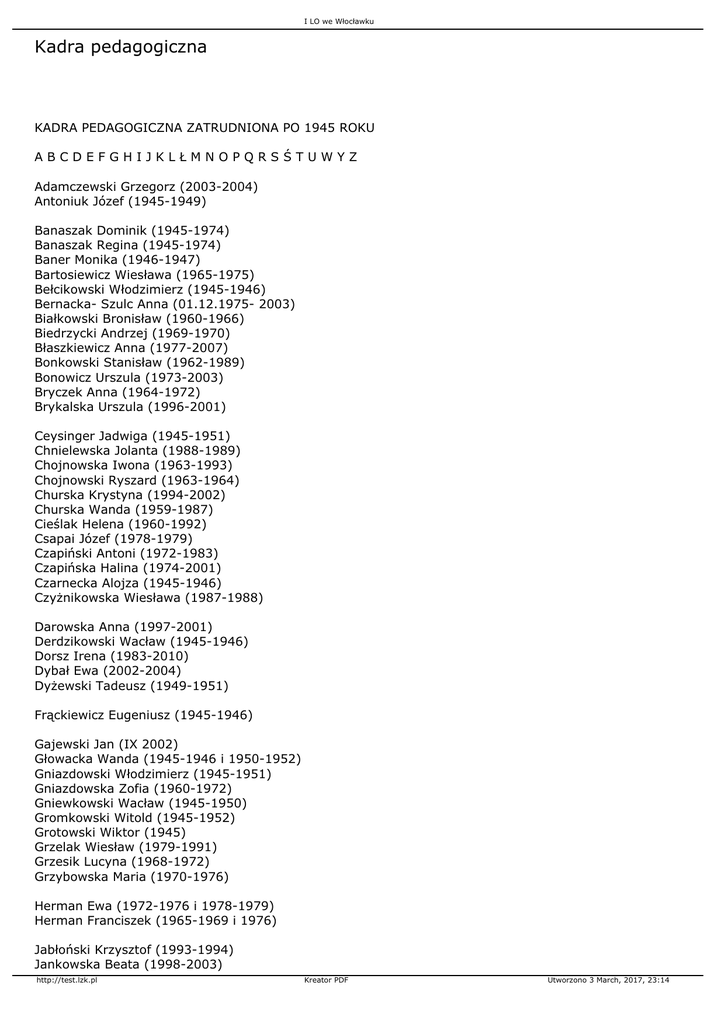 I LO we Włocławku Kadra pedagogiczna KADRA PEDAGOGICZNA ZATRUDNIONA PO 1945 ROKU ABCDEFGHIJKLŁMNOPQRSŚTUWYZ Adamczewski Grzegorz (2003-2004) Antoniuk Józef (1945-1949) Banaszak Dominik (1945-1974) Banaszak Regina (1945-1974) Baner Monika (1946-1947) Bartosiewicz Wiesława (1965-1975) Bełcikowski Włodzimierz (1945-1946) Bernacka- Szulc Anna (01.12.1975- 2003) Białkowski Bronisław (1960-1966) Biedrzycki Andrzej (1969-1970) Błaszkiewicz Anna (1977-2007) Bonkowski Stanisław (1962-1989) Bonowicz Urszula (1973-2003) Bryczek Anna (1964-1972) Brykalska Urszula (1996-2001) Ceysinger Jadwiga (1945-1951) Chnielewska Jolanta (1988-1989) Chojnowska Iwona (1963-1993) Chojnowski Ryszard (1963-1964) Churska Krystyna (1994-2002) Churska Wanda (1959-1987) Cieślak Helena (1960-1992) Csapai Józef (1978-1979) Czapiński Antoni (1972-1983) Czapińska Halina (1974-2001) Czarnecka Alojza (1945-1946) Czyżnikowska Wiesława (1987-1988) Darowska Anna (1997-2001) Derdzikowski Wacław (1945-1946) Dorsz Irena (1983-2010) Dybał Ewa (2002-2004) Dyżewski Tadeusz (1949-1951) Frąckiewicz Eugeniusz (1945-1946) Gajewski Jan (IX 2002) Głowacka Wanda (1945-1946 i 1950-1952) Gniazdowski Włodzimierz (1945-1951) Gniazdowska Zofia (1960-1972) Gniewkowski Wacław (1945-1950) Gromkowski Witold (1945-1952) Grotowski Wiktor (1945) Grzelak Wiesław (1979-1991) Grzesik Lucyna (1968-1972) Grzybowska Maria (1970-1976) Herman Ewa (1972-1976 i 1978-1979) Herman Franciszek (1965-1969 i 1976) Jabłoński Krzysztof (1993-1994) Jankowska Beata (1998-2003) http://test.lzk.pl Kreator PDF Utworzono 3 March, 2017, 23:14 I LO we Włocławku Jankowska Kazimiera (1986-1999) Jarmużek Elżbieta (1975-2005) Jarząbkowska Irena (2003-2004) Jasman Kazimierz (1983-2006) Jaśkiewicz Ryszard (1986-1988) Jóżwiak Zygmunt (1986-1988) Jurzysta Julia (01.11.80-31.08.81) Kalsztejn Anna (1970-1972) Kamiński Lech (1974-1976) Karczewski Michał (1951-1953) Karpik Helena (1964-1970) Kasperkiewicz Kazimierz (1945-1949) Katarzyńska Dorota (1994-2006) Katarzyński Ryszard (1990-2005) Katolik Grażyna (1971-1972) Kaźmierczak Henryka (1973-1978) Kącki Zbigniew (1976-1978) Kasińska Eleonora (1950-1954) Kieloch Tadeusz (1978-2002) Koba Jan (1970-2001) Kosińska Iwona (1987-1999) Kosmalski Stanisław (1950-1951) Kowalewski Edmund (1945-1951) Kowalewski Stanisław (1977-1980) Kraśniak Janina (1954-1975) Krutil Alina (1995-1996) Krzemińska Hanna (1988-1990) Krzywkowski Cyprian (1945-1946) Krysiak Aniela (1960-1972) Krysiak Tadeusz (1950-1974) Kulesza Bogdan (1955-1990) Kuptel Włodzimierz (1964-1968) Kutyło Elżbieta (1946-1973) Latecka Stefania (1980-2003) Leszczyński Tomasz (1989-1993) Lewandowski Józef (1947-1949) Lewandowski Stanisław (1979-1981 i 1989-1990 i 2000-2001) Lewandowski Stefan (1945) Lewicka Elżbieta (1979-1981) Lidwin Ludwik (1945-1961) Loga Stanisław (1954-1957) Łapiński Aleksander (1962-1963) Łukaszewska Krystyna (1974-2006) Majewska Danuta (1954-1992) Malewska Gertruda (1980-1982) Marciniak Kazimierz (1945) Markowski Aleksander (1945) Marszałek Henryka (1974-1975) Michalska Wiesława (1984-1986) Michniewski Julian (1948-1949) Mielczyński Benedykt (1977-1978) Mieszkalska Czesława (1970-1993) Mieszkalska Elżbieta (1987-1991) Mieszkowska Aurelia (2002-2004) Migocka Mirosława (1983-1995) Misztal Jolanta (1994-1998) Modrzejewska Teresa (02.11.1976-2003) Mrożewski Zdzisław (2002-2003) http://test.lzk.pl Kreator PDF Utworzono 3 March, 2017, 23:14 I LO we Włocławku Mrożewski Jerzy (1949-1961) Nawrocki Bogumił (1949-1961) Neugebauer Zygmunt (1951-1955) Niewiadomska Ewa (1986-1992) Niwiński Wiktor (1945) Nowacka Teresa (1991-1992) Nowak Danuta(1983-2008) Nowak Krystyna (1973-1981 i 1985) Nowicka Anna (1947-1948) Nowicki Przemysław (1966-1987) Nuszczyńska Henryka (1969-1991) Nuszkiewicz Anna (1964-1965) Olszanowska Teresa (1968-2002) Osmulski Marek (1972-1982) Pabian Barbara (1988-1990) Pawłowski Jerzy (1980-1990) Pietruszewska Maria (1960-1962) Piotrowski Stanisław (1945) Płoszay Leon (1963-1965) Poszwiński Ludomir (1950-1951) Poźlewicz Kalina (1966-1997) Prokopiak Mieczysław (1950-1955) Puzicka Jadwiga (1983-2008) Rakowski Tadeusz (1962-1972) Reder Mieczysław (1946-1953) Rempel Kazimierz (1948-1973) Ręklewska Grażyna (1977-1979) Rutkowski Włodzimierz (1976-2004) Rybicki Stanisław (1945) Samojło Maria (1974-1986) Sawoni Marianna (1970-1975) Serwatko Jan (1951-1954) Skoczylas Ewa (1984-1985) Skrzypacz Barbara (1979-1980) Skrzypińska Halina (1972-2001) Skubała Marian (1946-1950) Smarzyński Euzebiusz (1971-1976) Smolarczyk Lucjan (1947-1951) Sobczak Stanisław (1945-1950) Sobolewski Jerzy (1973-1974) Sopoćko Irena (1960-1992) Sosińska Dorota (1982-1983) Stanisławski Henryk (1976-1991) Stielow Witold (1961-1962) Strzykowska Anna (1996-2000) Szarmach Józef (1947-1951) Szarferberg Anna (1993-1994) Szczerbiak Apolinaria (1954-1990) Szczerbiak Jan (1970-1975) Szymańska Janina (1974-2008) Śmigielski Marian (1983-1985 i 1987-1988) Święcikoowski Józef (1952-1954) Tomczewska Teresa (1973-1974) Trawińska Jadwiga (1973-1998) Trzebiatowska Maria (1978-1987) http://test.lzk.pl Kreator PDF Utworzono 3 March, 2017, 23:14 I LO we Włocławku Trzeciak Henryk (1968-1975) Twardy Janina (1972-1979, 1993-2001) Tylman Kazimierz (1962-1963) Urbańska Edyta (1975-1978) Urbańska Elzbieta (1975-2002, 2003-2004) Uzłowska Bożena (1975-2001) Wasielewska Halina (1974-1976) Wawrzonkoska Stanisława (1972-2001) Wąsikiewicz Anna (1993-1995) Wesołowska Teresa (1954-1992) Wilczyński Czesław (1957-1960) Wojtasik Marian (1961-1962) Wolińska Krystyna (1961-1965) Wożniak Józef (1951-1969) Wójcik Maria (1973-2004) Wysocki Tadeusz (1962-1963) Zaćmiński Andrzej (1988-1990) Zając Edward (1945-1976) Zawistowska Janina (1945-1947) Zdrojewska Zofia (1946-1949) Zieliński Jerzy (X 2002-2004) Ziembicka Maria (1948-1949) Zientarski Władysław (1945) Zinkiewicz Sławomira (1970-2002) Znajmiecka - Sikora Marta (1994-2000) Zytner H
