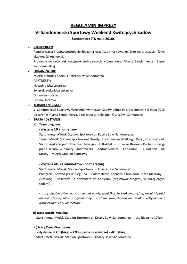 REGULAMIN IMPREZY VI Sandomierski Sportowy Weekend Kwitnących Sadów Sandomierz 7-8 maja 2016r. 1. CEL IMPREZY: Popularyzacja i upowszechnianie biegania oraz jazdy na rowerze, jako najprostszych form aktywności ruchowej. Promocja walorów rekreacyjno-krajobrazowych Królewskiego Miasta Sandomierza i Ziemi Sandomierskiej. 2. ORGANIZATOR: Miejski Ośrodek Sportu i Rekreacji w Sandomierzu PARTNERZY: Naczelna Izba Lekarska Świętokrzyska Izba Lekarska Gmina Samborzec Gmina Obrazów 3. TERMIN I MIEJSCE : VI Sandomierski Sportowy Weekend Kwitnących Sadów odbędzie się w dniach 7-8 maja 2016 na terenie miasta Sandomierza, a także na terenie gmin Obrazów i Samborzec. 4. TRASA I DYSTANSE: a) Trasy biegowe: - dystans 10 kilometrów Start i meta: Miejski Stadion Sportowy ul. Koseły 3a w Sandomierzu, Trasa: Miejski Stadion Sportowy-ul. Koseły-ul. Kazimierza Wielkiego, Park „Piszczele” - ul. Staromiejska-Wąwóz Królowej Jadwigi - ul. Rokitek – ul. Salve Regina - Kurhan – drogi polne sadami w okolicy Sandomierza – Andruszkowice – Kobierniki – ul. Rokitek – ul. Koseły – Miejski Stadion Sportowy - dystans ok. 21 kilometrów (półmaraton) Start i meta: Miejski Stadion Sportowy ul. Koseły 3a w Sandomierzu, Początek i powrót jak w biegu na 10 kilometrów, ponadto z Kobiernik przez Milczany Żurawicę - Milczany - z powrotem do Kobiernik (częściowo drogami, w dużej części sadami). - trasy biegów głównych o zmiennej nawierzchni (kostka brukowa, asfalt, drogi i ścieżki nieutwardzone) ulice z ograniczonym ruchem samochodowym. Punkty odżywiania i odświeżania co 5 kilometrów. b) trasa Nordic Walking: Start i meta: Miejski Stadion Sportowy ul. Koseły 3a w Sandomierzu - trasą biegu na 10 km c ) trasy Cross-Duathlonu: - dystanse: 6 km (bieg) – 22km (jazda na rowerze) – 4km (bieg) Start i meta: Miejski Stadion Sportowy ul. Koseły 3a w Sandomierzu Trasa biegu: Miejski Stadion Sportowy-ul. Koseły - ul. Kazimierza Wielkiego, Park „Piszczele” Strefa zmian: Miejski Stadion Sportowy. Trasa rowerowa: Miejski Stadion Sportowy-ul. Koseły - ul. Kazimierza Wielkiego, Park „Piszczele”- ul. Słoneczna – ul. Staromiejska – ul. Rokitek – Kurhan – ul. Salve Regina – ul. Kręta – ul. Księcia Henryka Sandomierskiego – ul. Rokitek – ul. Staromiejska – ul. Słoneczna – ul. Kazimierza Wielkiego – ul. Koseły – Miejski Stadion Sportowy 5. WARUNKI UCZESTNICTWA: Podczas rejestracji uczestnicy zobowiązani są do złożenia oświadczenia, w którym deklarują świadomośd zagrożeo, mogących pojawid się w trakcie rozgrywania zawodów oraz potwierdzają informację, że ich stan zdrowia pozwala na udział w wybranych przez siebie konkurencjach. W przypadku jakichkolwiek wątpliwości co do stanu zdrowia i związanych z nim ograniczeo, które mogą utrudnid zawodnikowi uczestnictwo w zawodach, jest on zobowiązany we własnym zakresie, zasięgnąd przed startem opinii lekarza. Od osób poniżej 18- go roku życia wymaga będzie pisemna zgoda rodzica/opiekuna . Wszyscy zawodnicy startujący w zawodach muszą przejśd proces weryfikacji w biurze zawodów. Podczas weryfikacji zawodnik musi posiadad dokument tożsamości (dowód osobisty, paszport, prawo jazdy, młodzież – legitymację szkolną) celem kontroli daty urodzenia, która decyduje o przynależności do danej kategorii wiekowej, według przedziału ustalonego przez organizatora. W czasie trwania zawodów uczestnicy powinni stosowad się do poleceo osób odpowiedzialnych za bezpieczeostwo, służb porządkowych i osób działających w imieniu organizatora. Zgłoszenie swojego uczestnictwa jest jednoznaczne z wyrażeniem zgody na przetwarzanie danych osobowych dla potrzeb wewnętrznych organizatora imprezy oraz na wykorzystanie ich wizerunku w materiałach informacyjnych i reklamowych. Zabrania się startu zawodnikom będącym pod wpływem alkoholu, bądź innych środków odurzających. Przekazanie swojego numeru startowego innej osobie skutkowad będzie dyskwalifikacją. Modyfikacja lub skrócenie trasy będzie skutkowad dyskwalifikacją zawodnika. 6. PROGRAM ZAWODÓW: 7 maja (sobota) Sandomierski Bieg Górski Szlakiem Królowej Jadwigi: - godz. 0800- godz. 1100 – czynne biuro zawodów, wydawanie numerów startowych (Biuro zawodów – Miejski Stadion Sportowy ul. Koseły 3a w Sandomierzu) - godz. 0925 – odprawa - godz. 0930 – start Sandomierskiego Biegu Górskiego (styl anglosaski) dystans ok. 20km Przewyższenia (+500m/-500m). Cross-Duathlon: - godz. 1220 – odprawa techniczna, - godz. 1230 – start Cross-Duathlonu Dekoracje zwycięzców - godz. 1500 dekoracje zwycięzców (Bieg Górski, Cross-Duathlon). Miejsce dekoracji: Miejski Stadion Sportowy ul. Koseły 3a w Sandomierzu, 8 maja (niedziela) - godz. 830 - godz. 1030 – czynne biuro zawodów, wydawanie numerów startowych (Biuro zawodów – Miejski Stadion Sportowy ul. Koseły 3a w Sandomierzu) -godz. 1055 – odprawa -godz. 1100 – start biegów głównych: 10 km, półmaraton -godz. 1105 – start nordic walking – 10km Dekoracje zwycięzców -godz. 1400 dekoracje zwycięzców biegów głównych (10km, półmaratonu oraz Nordic Walking). Miejsce dekoracji: Miejski Stadion Sportowy ul. Koseły 3a w Sandomierzu 7. DYSTANSE I KATEGORIE: Biegi na dystansie: 10km, półmaraton: -M20 (1998-1987) -M30 (1986-1977) -M40 (1976 –1967) -M50(1966 – 1957) -M60(1956- 1947) -K20( 1998 – 1981) -K36(1980 - 1967) -K50(1966 – i starsze) Nordic Walking – generalna mężczyzn i generalna kobiet. Bieg Górski: -junior -16-19 r.ż. -senior -20-39 r.ż. -masters- 40-49 r.ż. -weteran - powyżej 50 r.ż. Cross-Duathlon: M1 (18-35 lat) M2 (36-45 lat) M3 (46-55 lat) M4 (pow. 55 lat) K1 (18-40 lat) K2 (pow. 40 lat) 8. ZGŁOSZENIE I OPŁATA STARTOWA: Zgłoszenia zawodników do biegów głównych (10km, półmaraton, bieg górski) oraz Cross-Duathlonu: przyjmowane są drogą elektroniczną, link do zapisów znajduje się na stronie: www.mosir.