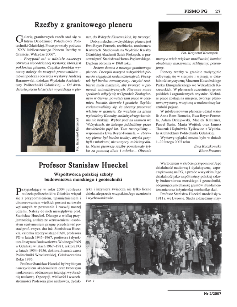 PISMO PG 27 Rzeźby z granitowego pleneru G Fot. Krzysztof Krzempek alerią granitowych rzeźb stał się w lutym Dziedziniec Południowy Poli− techniki Gdańskiej. Prace powstały podczas „XXV Jubileuszowego Pleneru Rzeźby w Granicie. Wdzydze 2006”. – Przypadł mi w udziale zaszczyt otwarcia niecodziennej wystawy, która jest pokłosiem pleneru. Cząstka dorobku wy− stawy należy do naszych pracowników – mówił podczas otwarcia wystawy Andrzej Baranowski, dziekan Wydziału Architek− tury Politechniki Gdańskiej. – Od dwu− dziestu pięciu lat artyści wyjeżdżają w ple− ner, do Wdzydz Kiszewskich, by tworzyć. Dobrym duchem wdzydzkiego pleneru jest Ewa Beyer−Formela, rzeźbiarka, urodzona w Kartuzach. Studiowała na Wydziale Rzeźby Gdańskiej Akademii Sztuk Pięknych, w pra− cowni prof. Stanisława Horno−Popławskiego. Dyplom obroniła w 1960 roku. – Jestem dumna z naszego granitowego pleneru. Początki naszych wdzydzkich ple− nerów sięgają lat siedemdziesiątych. Począ− tek był bardzo romantyczny. Artyści rzeź− biarze mieli marzenie, aby tworzyć w ple− nerach animalistycznych. Pierwsze nasze spotkania odbyły się w Ogrodzie Zoologicz− nym w Oliwie, powstały tam prace w cera− mice, betonie, drewnie i granicie. Szybko zorientowaliśmy się, że chcemy pracować właśnie w granicie. Ze względu na granit wybraliśmy Kaszuby, na których tego kamie− nia nie brakuje. Wybór padł na skansen we Wdzydzach, do którego jeździliśmy przez dwadzieścia pięć lat. Tam tworzyliśmy – wspominała Ewa Beyer−Formela. – Pierw− szy plener był bardzo trudny, artyści przy− byli z młotkami, nie wszyscy mieliśmy dłu− ta. Nasze pierwsze rzeźby powstawały tyl− ko za pomocą dłuta i młotka... Obecnie Profesor Stanisław Hueckel Współtwórca polskiej szkoły budownictwa morskiego i geotechniki P rzypadający w roku 2004 jubileusz stulecia politechniki w Gdańsku wiązał się z przypomnieniem, upamiętnieniem i uhonorowaniem wielkich postaci na trwałe wpisanych w powstanie i rozwój naszej uczelni. Należy do nich niewątpliwie prof. Stanisław Hueckel. Dlatego z wielką przy− jemnością, a także ze wzruszeniem i osobi− stym sentymentem pragnę przedstawić po− stać prof. zwycz. dra inż. Stanisława Huec− kla, członka rzeczywistego PAN, profesora PG w latach 1945–1967, profesora i dyrek− tora Instytutu Budownictwa Wodnego PAN w Gdańsku w latach 1967–1981, rektora PG w latach 1954–1956, doktora honoris causa Politechniki Wrocławskiej, Gdańszczanina Roku 1976. Profesor Stanisław Hueckel był wybitnym nauczycielem akademickim oraz twórczym naukowcem, obdarzonym intuicją i wyobraź− nią naukową. O pozycji, wielkości i wszech− stronności Profesora jako naukowca, dydak− tyka i inżyniera świadczą nie tylko liczne dzieła, ale przede wszystkim Jego uczniowie i wychowankowie. Fot. Krzysztof Krzempek mamy o wiele większe możliwości, kamień obrabiamy maszynami, szlifujemy, poleru− jemy. Plenery rzeźby w granicie tradycyjnie odbywają się w sierpniu i wpisują w dzia− łalność artystyczną Muzeum Kaszubskiego Parku Etnograficznego we Wdzydzach Ki− szewskich. W plenerach uczestniczy grono polskich i zagranicznych artystów. Niektó− re prace zostają na miejscu, tworząc plene− rową wystawę, wtopioną w malowniczy ka− szubski pejzaż. W jubileuszowym plenerze udział wzię− li: Anna Bem−Borucka, Ewa Beyer−Forme− la, Adam Dziejowski, Maciek Klauzner, Paweł Sasin, Maria Wojtiuk oraz Janusz Tkaczuk i Dąbrówka Tyślewicz z Wydzia− łu Architektury Politechniki Gdańskiej. Wystawę oglądać można było w dniach 1–22 lutego 2007 roku. Ewa Kuczkowska Biuro Prasowe Warto zatem w skrócie przypomnieć Jego działalność naukową i dydaktyczną, zapo− czątkowaną na PG, a przede wszystkim Jego działalność jako współtwórcy polskiej szko− ły budownictwa morskiego i geotechniki, obejmującej mechanikę gruntów i fundamen− towania oraz inżynierską mechanikę skał. Profesor Stanisław Hueckel urodził się w 1911 r. we Lwowie. Studia z dziedziny inży− Fot. 1 Nr 2/2007 28 PISMO PG nierii lądowej i wodnej ukończył na Politech− nice Lwowskiej w czerwcu 1935 r. Pracę za− wodową rozpoczął już w lipcu 1935 r. w Urzędzie Morskim w Gdyni. Uczestniczył wówczas w dalszej budowie różnych obiek− tów portu Gdynia oraz budowie nowego portu rybackiego we Władysławowie. W okresie okupacji mieszkał w Krakowie, pracując jako weryfikator obliczeń statycznych w Urzędzie Budowlanym w Krakowie. Po wyzwoleniu spod okupacji hitlerow− skiej wrócił już w czerwcu 1945 r. do Gdań− ska i rozpoczął pracę w Biurze Odbudowy Portów jako naczelnik Wydziału Projektów i Konstrukcji (fot. 1). Równocześnie w paź− dzierniku 1945 r. zaczął wykładać na Wy− dziale Inżynierii Lądowej i Wodnej PG me− chanikę gruntów i fundamentowanie w ra− mach utworzonej tzw. docentury fundamen− towania. Objął wówczas stanowisko adiunk− ta w Katedrze Budownictwa Morskiego i Por− tów, kierowanej przez prof. Witolda Tubie− lewicza. Kierując „docenturą” mechaniki gruntów i fundamentowania, zredagował skrypt wy− kładów prof. Karola Pomianowskiego pt. Fundamentowanie. Wykłady prof. K. Pomia− nowskiego prowadzone były w ramach sze− roko pojętego przedmiotu „budownictwo wodne”, obejmującego również główne ele− menty mechaniki gruntów i fundamentowa− nia. Pierwszy swój wykład rozpoczął prof. Stanisław Hueckel 10 grudnia 1945 r. dla stu− dentów Wydziału Inżynierii Lądowej i Wod− nej. Z chwilą przejścia na emeryturę prof. Karola Pomianowskiego powstaje Katedra Budownictwa Wodnego, gdzie wykładana jest nie tylko mechanika gruntów i fundamen− towania, lecz również hydromechanika, hy− draulika i hydrologia. Kierownictwo Katedry obejmuje prof. Hueckel wraz ze stanowiskiem zastępcy profesora. W wyniku