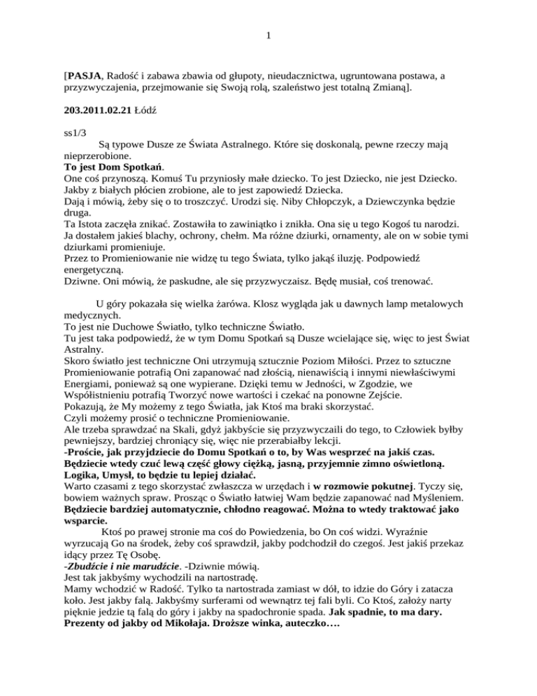 1 [PASJA, Radość i zabawa zbawia od głupoty, nieudacznictwa, ugruntowana postawa, a przyzwyczajenia, przejmowanie się Swoją rolą, szaleństwo jest totalną Zmianą]. 203.2011.02.21 Łódź ss1/3 Są typowe Dusze ze Świata Astralnego. Które się doskonalą, pewne rzeczy mają nieprzerobione. To jest Dom Spotkań. One coś przynoszą. Komuś Tu przyniosły małe dziecko. To jest Dziecko, nie jest Dziecko. Jakby z białych płócien zrobione, ale to jest zapowiedź Dziecka. Dają i mówią, żeby się o to troszczyć. Urodzi się. Niby Chłopczyk, a Dziewczynka będzie druga. Ta Istota zaczęła znikać. Zostawiła to zawiniątko i znikła. Ona się u tego Kogoś tu narodzi. Ja dostałem jakieś blachy, ochrony, chełm. Ma różne dziurki, ornamenty, ale on w sobie tymi dziurkami promieniuje. Przez to Promieniowanie nie widzę tu tego Świata, tylko jakąś iluzję. Podpowiedź energetyczną. Dziwne. Oni mówią, że paskudne, ale się przyzwyczaisz. Będę musiał, coś trenować. U góry pokazała się wielka żarówa. Klosz wygląda jak u dawnych lamp metalowych medycznych. To jest nie Duchowe Światło, tylko techniczne Światło. Tu jest taka podpowiedź, że w tym Domu Spotkań są Dusze wcielające się, więc to jest Świat Astralny. Skoro światło jest techniczne Oni utrzymują sztucznie Poziom Miłości. Przez to sztuczne Promieniowanie potrafią Oni zapanować nad złością, nienawiścią i innymi niewłaściwymi Energiami, ponieważ są one wypierane. Dzięki temu w Jedności, w Zgodzie, we Współistnieniu potrafią Tworzyć nowe wartości i czekać na ponowne Zejście. Pokazują, że My możemy z tego Światła, jak Ktoś ma braki skorzystać. Czyli możemy prosić o techniczne Promieniowanie. Ale trzeba sprawdzać na Skali, gdyż jakbyście się przyzwyczaili do tego, to Człowiek byłby pewniejszy, bardziej chroniący się, więc nie przerabiałby lekcji. -Proście, jak przyjdziecie do Domu Spotkań o to, by Was wesprzeć na jakiś czas. Będziecie wtedy czuć lewą część głowy ciężką, jasną, przyjemnie zimno oświetloną. Logika, Umysł, to będzie tu lepiej działać. Warto czasami z tego skorzystać zwłaszcza w urzędach i w rozmowie pokutnej. Tyczy się, bowiem ważnych spraw. Prosząc o Światło łatwiej Wam będzie zapanować nad Myśleniem. Będziecie bardziej automatycznie, chłodno reagować. Można to wtedy traktować jako wsparcie. Ktoś po prawej stronie ma coś do Powiedzenia, bo On coś widzi. Wyraźnie wyrzucają Go na środek, żeby coś sprawdził, jakby podchodził do czegoś. Jest jakiś przekaz idący przez Tę Osobę. -Zbudźcie i nie marudźcie. -Dziwnie mówią. Jest tak jakbyśmy wychodzili na nartostradę. Mamy wchodzić w Radość. Tylko ta nartostrada zamiast w dół, to idzie do Góry i zatacza koło. Jest jakby falą. Jakbyśmy surferami od wewnątrz tej fali byli. Co Ktoś, założy narty pięknie jedzie tą falą do góry i jakby na spadochronie spada. Jak spadnie, to ma dary. Prezenty od jakby od Mikołaja. Droższe winka, auteczko…. 2 Podpowiedź, że dzięki Radości i czasem dzięki temu oświetleniu będziemy potrafili wpływać na tę Rzeczywistość, osiągać cele. Można to robić. -Módlcie się żeby być w Radości i żeby być Zbawionym od głupoty, nieudacznictwa w cierpieniu. Powiedzieli. Zbawimy się od Wiary w brak własnej Mocy. My nie mamy cierpieć. Mamy nauczyć się Żyć tylko Radością. -Stańcie się Radością. Zapomnieliście, co robią Dzieci. One są Radością, One są w Radości, One widzą Świat. -A My, co widzimy? Tylko pewne sprawy, Nasze sprawy, ograniczenia kłopoty. Dlatego System zamyka Nas w pewnych sprawach. Tworzy takie ograniczenia, żebyśmy drżeli. -Urząd podatkowy, Policja, auto nie tak postawione, a złodzieje, a Dziecko ma to gdzieś. Nie przejmuje się, że coś się stanie, bo i tak to się stanie. To i tak jest. Dziecko Żyje. A My jakbyśmy się sprawdzili na Skali Życia, to byśmy odczytali; -umarły w tylu %-ach. Żyjący w … %. -A dziecko chce się Cały czas bawić, Ono chce cały czas Doświadczać, aż ze zmęczenia śpi. Tak jak Wy. Wy robicie coś fantastycznego, zjeżdżając na nartach. Gdy Żyjemy pasją, Żyjemy Drugim Człowiekiem, to nie ma przeszłości, nie ma przyszłości. Oddajemy się Życiu. Wtedy Świadomość Działa i realizuje Cele. My nie mamy czasu. My musimy się cieszyć Życiem. I Chrystus wtedy w Pełni Działa. Ta Moc. Musimy w to wchodzić, musimy o tym pamiętać. -Słyszę. -Wy nie tylko zapominacie,… ale jakbyśmy w ogóle nie chcieli z wody wypłynąć. -Mówią, że to nie zupełnie są przyzwyczajenia. To jest ugruntowana postawa. Przyzwyczaić się można, ale ugruntowana postawa oznacza, że z czymś się urodziliśmy, że My już tacy przyszliśmy na ten Świat. Jako Dzieci trochę o tym zapomnieliśmy. Ale kiedy się kończy ten okres pierwszego fizycznego wzrostu, wtedy ta skostniała Postawa, to cośmy Tu robili jakby się w Nas budziła. A My mamy się z tego wypierać. Czyli z tej ugruntowanej Postawy czyścić. Pokazują jak wyskakujemy z Siebie i idziemy w siną dal. Nawet Ja krzyczę. -Gdzie idziesz? -Tu są sprawy do załatwienia. -Gdzie Ty idziesz? -Ten Ja Tam, który wyskoczył w ogóle ma to gdzieś. Ja ryb nie łowię, ale Ten idzie łowić ryby i w ogóle Go nie interesuje, czy Tu wszystko padnie, czy też nie. -A to oznaczałoby, że się za bardzo doczesnością, dniem, tą chwilą przejmujemy. To Nas Trzyma. To nie jest cierpienie. To jest przejmowanie się. -Czym? Swoją rolą. Tamten, co poszedł łowić ryby nie przejął się. Wraca i okazuje się, że jak Go tu nie było nic na gorzej się nie zmieniło. A on miał czas i odetchnął. Teraz siada, nogi wyciągnął na biurko zamiast już wejść w to Życie, to czyta sobie gazetę. Zamiast zrobić Skale, zamiast robić coś tam, to nie. I nagle znajdują się rozwiązania. Ktoś zrobił Skale, Ktoś, co innego. Więc Wstał, ziewnął, pojechał, zrob