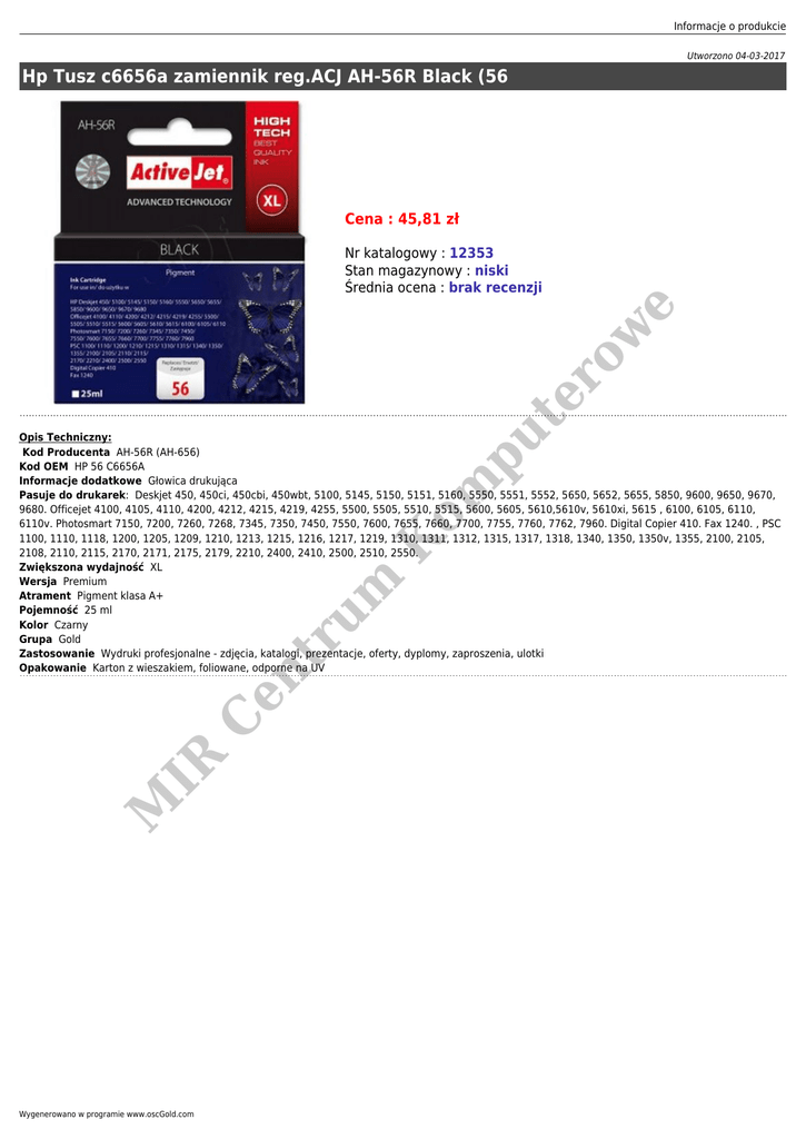 Informacje o produkcie Utworzono 04-03-2017 Hp Tusz c6656a zamiennik reg.ACJ AH-56R Black (56 Cena : 45,81 zł om pu te r ow e Nr katalogowy : 12353 Stan magazynowy : niski Średnia ocena : brak recenzji M IR C en tr um K Opis Techniczny: Kod Producenta AH-56R (AH-656) Kod OEM HP 56 C6656A Informacje dodatkowe Głowica drukująca Pasuje do drukarek: Deskjet 450, 450ci, 450cbi, 450wbt, 5100, 5145, 5150, 5151, 5160, 5550, 5551, 5552, 5650, 5652, 5655, 5850, 9600, 9650, 9670, 9680. Officejet 4100, 4105, 4110, 4200, 4212, 4215, 4219, 4255, 5500, 5505, 5510, 5515, 5600, 5605, 5610,5610v, 5610xi, 5615 , 6100, 6105, 6110, 6110v. Photosmart 7150, 7200, 7260, 7268, 7345, 7350, 7450, 7550, 7600, 7655, 7660, 7700, 7755, 7760, 7762, 7960. Digital Copier 410. Fax 1240. , PSC 1100, 1110, 1118, 1200, 1205, 1209, 1210, 1213, 1215, 1216, 1217, 1219, 1310, 1311, 1312, 1315, 1317, 1318, 1340, 1350, 1350v, 1355, 2100, 2105, 2108, 2110, 2115, 2170, 2171, 2175, 2179, 2210, 2400, 2410, 2500, 2510, 2550. Zwiększona wydajność XL Wersja Premium Atrament Pigment klasa A+ Pojemność 25 ml Kolor Czarny Grupa Gold Zastosowanie Wydruki profesjonalne - zdjęcia, katalogi, prezentacje, oferty, dyplomy, zaproszenia, ulotki Opakowanie Karton z wieszakiem, foliowane, odporne na UV Wygenerowano w programie www.oscGold.com