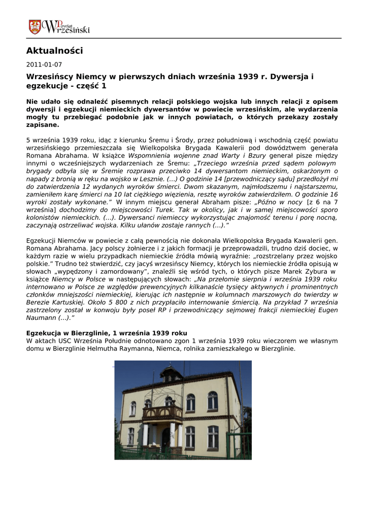 Aktualności 2011-01-07 Wrzesińscy Niemcy w pierwszych dniach września 1939 r. Dywersja i egzekucje - część 1 Nie udało się odnaleźć pisemnych relacji polskiego wojska lub innych relacji z opisem dywersji i egzekucji niemieckich dywersantów w powiecie wrzesińskim, ale wydarzenia mogły tu przebiegać podobnie jak w innych powiatach, o których przekazy zostały zapisane. 5 września 1939 roku, idąc z kierunku Śremu i Środy, przez południową i wschodnią część powiatu wrzesińskiego przemieszczała się Wielkopolska Brygada Kawalerii pod dowództwem generała Romana Abrahama. W książce Wspomnienia wojenne znad Warty i Bzury generał pisze między innymi o wcześniejszych wydarzeniach ze Śremu: „Trzeciego września przed sądem polowym brygady odbyła się w Śremie rozprawa przeciwko 14 dywersantom niemieckim, oskarżonym o napady z bronią w ręku na wojsko w Lesznie. (…) O godzinie 14 [przewodniczący sądu] przedłożył mi do zatwierdzenia 12 wydanych wyroków śmierci. Dwom skazanym, najmłodszemu i najstarszemu, zamieniłem karę śmierci na 10 lat ciężkiego więzienia, resztę wyroków zatwierdziłem. O godzinie 16 wyroki zostały wykonane.” W innym miejscu generał Abraham pisze: „Późno w nocy [z 6 na 7 września] dochodzimy do miejscowości Turek. Tak w okolicy, jak i w samej miejscowości sporo kolonistów niemieckich. (…). Dywersanci niemieccy wykorzystując znajomość terenu i porę nocną, zaczynają ostrzeliwać wojska. Kilku ułanów zostaje rannych (…).” Egzekucji Niemców w powiecie z całą pewnością nie dokonała Wielkopolska Brygada Kawalerii gen. Romana Abrahama. Jacy polscy żołnierze i z jakich formacji je przeprowadzili, trudno dziś dociec, w każdym razie w wielu przypadkach niemieckie źródła mówią wyraźnie: „rozstrzelany przez wojsko polskie.” Trudno też stwierdzić, czy jacyś wrzesińscy Niemcy, których los niemieckie źródła opisują w słowach „wypędzony i zamordowany”, znaleźli się wśród tych, o których pisze Marek Zybura w książce Niemcy w Polsce w następujących słowach: „Na przełomie sierpnia i września 1939 roku internowano w Polsce ze względów prewencyjnych kilkanaście tysięcy aktywnych i prominentnych członków mniejszości niemieckiej, kierując ich następnie w kolumnach marszowych do twierdzy w Berezie Kartuskiej. Około 5 800 z nich przypłaciło internowanie śmiercią. Na przykład 7 września zastrzelony został w konwoju były poseł RP i przewodniczący sejmowej frakcji niemieckiej Eugen Naumann (…).” Egzekucja w Bierzglinie, 1 września 1939 roku W aktach USC Września Południe odnotowano zgon 1 września 1939 roku wieczorem we własnym domu w Bierzglinie Helmutha Raymanna, Niemca, rolnika zamieszkałego w Bierzglinie. Dom w Bierzglinie, w którym mieszkał Raymann (stan obecny) Źródło polskie o okolicznościach jego śmierci pisze: „rozstrzelany przez wojsko polskie”. Warto dodać, że 1 września jakieś jednostki wrzesińskiego 68. pułku piechoty znajdowały się jeszcze w mieście lub jego pobliżu, ale trudno dociec, czy z egzekucją Raymanna miały coś wspólnego. Źródło niemieckie o śmierci Raymanna mówi natomiast: „zamordowany przez Polaków volksdeutsch”. Według szczątkowych dziś przekazów ustnych mieszkańców wsi Bierzglin Raymann został przyłapany przez wojsko polskie na dywersji (wysyłał sygnały z radiostacji albo sygnały świetlne dla niemieckiego lotnictwa) i na mocy wyroku sądu wojskowego zastrzelony we własnym domu (lub w jego pobliżu). Pochodził z niemieckiej rodziny zasiedziałej w Bierzglinie, według późniejszej hitlerowskiej nomenklatury był więc volksdeutschem. To pierwsza w powiecie wrzesińskim ofiara egzekucji wykonywanych na początku września 1939 roku przez wojsko polskie na niemieckich cywilnych dywersantach. Po zajęciu Polski hitlerowcy uznali takich Niemców, w tym Raymanna, za bohaterów. Wrzesińska placówka SA urządziła 9 listopada (dzień partyjnego święta NSDAP i SA) 1939 roku we Wrześni na Rynku wielką manifestację żałobną, której częścią był przemarsz wrzesińskich Niemców do Bierzglina na jego grób. Kamień nagrobny z grobu Raymanna zachował się do dziś na cmentarzu ewangelickim w Bierzglinie (a raczej na tym, co zostało z tego cmentarza). Treść inskrypcji jest następująca: „Helmuth Raymann 10.6.1909-1.9.1939 / Er gab sein Leben für das Vaterland“ (Oddał swoje życie za ojczyznę). Na jego cześć hitlerowcy zmienili nazwę wsi Bierzglin na Raymannsruh, a we Wrześni nazwali jego nazwiskiem ulicę noszącą w okresie II RP nazwę św. Ducha, a obecnie Chopina. Hitlerowska nazwa ulicy brzmiała Helmuth Raymann Strasse. Krzyż na cmentarzu ewangelickim w Bierzglinie (stan obecny) Trzy lata później, 31 lipca 1942 roku Niemiec nazwiskiem Fiedler sporządził dla wrzesińskiej landratury listę niemieckich ofiar egzekucji we wrześniu 1939 roku. Źródła nie podają imienia autora listy, ale jest wielce prawdopodobne, że był to Reinhold Fiedler, wrzesiński Niemiec (według hitlerowskiej nomenklatury volksdeutsch), kierownik niemieckiej firmy Consum we Wrześni (przy ulicy Zamkowej – Schlossstrasse – Harcerskiej), bardzo dobrze znający Niemców z powiatu. Na liście tej Fiedler nie podaje (trudno dociec dlaczego) nazwiska Raymanna. Egzekucja w Sobiesierniach, 5 września 1939 roku 4 października 1939 roku komisaryczny sołtys Sobiesierni (niemiecka nazwa Neu-Tecklenburg) Wilhelm Klute II (z akt wynika, że w miejscowości tej było dwóch Niemców nazwiskiem Wilhelm Klute) zgłosił do USC Września Północ zgony 14 Niemców zamieszkujących tę wieś, rozstrzelanych przez Polaków 5 września 1939 roku o godzinie 18.00 w Sobiesierniach (według ustnych relacji dzisiejszych mieszkańców wsi faktycznie między Sobiesierniami a Grzybowem). Zgony te zostały odnotowane w aktach USC. Zamieszczona poniżej lista nazwisk sporządzona na podstawie 