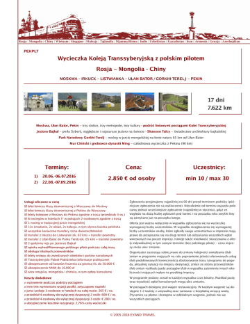 Rosja | Mongolia | Chiny | Wietnam | Singapur | Malezja | Tajlandia | Mjanma/Birma | Indie | Uzbekistan | Kazachstan | Iran | Armenia | Gruzja | Azerbejdżan PEKPLT Wycieczka Koleją Transsyberyjską z polskim pilotem Rosja – Mongolia - Chiny MOSKWA – IRKUCK – LISTWIANKA – UŁAN BATOR / GORKHI-TERELJ – PEKIN 17 dni 7.622 km Moskwa, Ułan Bator, Pekin – trzy stolice, trzy metropolie, trzy kultury · podróż liniowymi pociągami Kolei Transsyberyjskiej Jezioro Bajkał – perła Syberii, najgłębsze i najstarsze jezioro na świecie · Skansen Talcy – świadectwo architektury bajkalskiej Park Narodowy Gorkhi-Terelj – nocleg w jurcie mongolskiej na łonie natury 65 km od Ułan Bator Mur Chiński i grobowce dynastii Ming – całodniowa wycieczka z Pekinu (90 km) Cena: Terminy: 1) 20.06.-06.07.2016 2) 22.08.-07.09.2016 2.850 € od osoby Usługi wliczone w cenę ☑ bilet lotniczy klasy ekonomicznej z Warszawy do Moskwy ☑ bilet lotniczy klasy ekonomicznej z Pekinu do Warszawy ☑ bilety kolejowe z Moskwy do Pekinu zgodnie z trasą (przedziały 4-os.) ☑ 8 noclegów w hotelach 3* w pokojach 2-osobowym zgodnie z trasą ☑ 1 nocleg w tradycyjnej jurcie mongolskiej ☑ 11x śniadanie, 2x obiad, 2x kolacja, w tym słynna kaczka pekińska ☑ wszystkie konieczne transfery (z/na dworzec/lotnisko) ☑ transfer z Irkucka do Listwianki (ok. 65 km) + transfer powrotny ☑ transfer z Ułan Bator do Parku Terelj (ok. 65 km) + transfer powrotny ☑ 2-godzinny rejs po Jeziorze Bajkał ☑ opieka wykwalifikowanego polskiego pilota podczas całej trasy ☑ obsługa lokalnych przewodników ☑ bilety wstępu do zwiedzanych obiektów i parków narodowych ☑ Transsyberyjski Pakiet Podróżnika (informacje praktyczne) ☑ ubezpieczenie od kosztów leczenia za granicą KL do 30.000 € ☑ ubezpieczenie NNW do 16.000 zł ☑ wiza rosyjska, mongolska i chińska, w tym opłaty konsularne Koszty dodatkowe ✗ wyżywienie podczas podróży pociągiem ✗ inne (nie wymienione wyżej) posiłki, zwyczajowe napiwki ✗ jurta i pokoje 1-osobowe w hotelach na całej trasie: 265 € / os. ✗ przedział 4-osobowy do wyłącznej dyspozycji 2 osób: 600 € / os. ✗ przedział 4-osobowy do wyłącznej dyspozycji 3 osób: € 200 / os. ✗ ubezpieczenie kosztów rezygnacji: 2,76% ceny wycieczki Uczestnicy: min 10 / max 30 Zgłoszenia przyjmujemy najpóźniej na 60 dni przed terminem podróży (późniejsze zgłoszenia nie są wykluczone). Niezależnie od terminu wyjazdu polecamy jednak wcześniejsze zgłoszenie (najpóźniej w styczniu), gdyż ze względu na dużą liczbę zgłoszeń pod koniec i na początku roku zwykle listy są zamykane już na początku lutego. Oferta jest ważna wyłącznie w wypadku zgłoszenia się na wycieczkę wymaganej liczby uczestników. W wypadku niezgłoszenia się wymaganej liczby uczestników osoby, które zgłosiły swoje uczestnictwo w imprezie mają prawo do przepisania się na drugi termin lub odzyskania wszystkich wpłat wniesionych na poczet imprezy. Istnieje także możliwość skorzystania z oferty indywidualnej w tym samym terminie (bez polskiego pilota) – cena imprezy może ulec zmianie. Organizator zastrzega sobie prawo do zmiany kolejności zwiedzania i/lub zmian w programie mających na celu poprawienie jakości oferowanych usług i/lub podyktowanych koniecznością dostosowania trasy i programu do pogody, aktualnej sytuacji na miejscu destynacji, zmian ze strony przewoźników i/lub zmian rozkładu jazdy pociągów i/lub w wypadku zaistnienia innych okoliczności mających wpływ na przebieg imprezy. W programie podany został w każdym wypadku czas lokalny. Rozkład jazdy oraz wysokość opłat konsularnych mogą ulec zmianie. W pociągach dostępny jest wagon restauracyjny. W każdym wagonie są dostępne 1-2 toalety z umywalką oraz samowar z bezpłatną wrzącą wodą. Prysznice są płatne i dostępne w oddzielnym wagonie, jednak nie we wszystkich pociągach. © 2005-2016 EYAND TRAVEL Rosja | Mongolia | Chiny | Wietnam | Singapur | Malezja | Tajlandia | Mjanma/Birma | Indie | Uzbekistan | Kazachstan | Iran | Armenia | Gruzja | Azerbejdżan Zapraszamy Państwa na ponad 2-tygodniową wycieczkę liniowymi pociągami Kolei Transsyberyjskiej. Oznacza to 7.622 km ciekawej trasy prowadzącej przez Syberię, wysokogórskie krajobrazy Uralu, liczne syberyjskie metropolie i wioski, następnie przez piękną i ciekawą rosyjską Republikę Buriacji i niemalże niezaludnione mongolskie stepy. Podczas całej trasy towarzyszy Państwu wykwalifikowany polski pilot. W pociągu będzie okazja do zawarcia nowych ciekawych znajomości, zapoznania się z inną kulturą i zrobienia pięknych zdjęć. Na peronach stacji pośrednich będą Państwo mieli okazję spróbowania świeżych regionalnych przysmaków. Podczas podróży przewidziane są postoje w wybranych ciekawych miejscowościach na trasie: Irkucku i Ułan Bator oraz pobyt na łonie natury – nad Jeziorem Bajkał w miejscowości Listwianka i w mongolskim Parku Narodowym Terelj połączony z noclegiem w tradycyjnej jurcie mongolskiej. W Listwiance będzie możliwość skosztowania bajkalskiego specjału – wędzonej ryby omul i skorzystania z tradycyjnej sauny rosyjskiej – banji. W programie przewidziany jest ponadto 2-godzinny rejs po Jeziorze Bajkał oraz całodniowa wycieczka, podczas której zobaczą Państwo jeden z najlepiej zachowanych odcinków słynnego Muru Chińskiego. Moskwa (1) Zbiórka na lotnisku w Warszawie, lot do Moskwy. Transfer z lotniska do hotelu. Zakwaterowanie, kolacja i nocleg w 3* hotelu. (2) Dziś zwiedzą Państwo Kreml, Plac Czerwony i okolice. W programie przewidziany jest także spacer po słynnej historycznej ulicy Arbat znanej z piosenek Bułata Okudżawy, przy której zamieszkiwał także Aleksander Puszkin. Czeka Państwa także wycieczka moskiewskim metrem, podczas której zobaczą Państwo wybrane najciekawsze stacje i przekonają się dlaczego określane są one mianem po