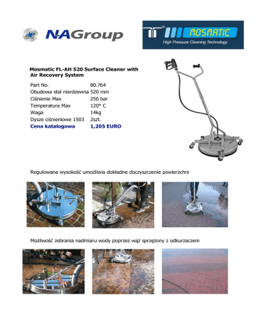 Mosmatic FL-AH 520 Surface Cleaner with Air Recovery System Part No. 80.764 Obudowa stal nierdzewna 520 mm Ci nienie Max 250 bar Temperatura Max 120° C Waga 14kg Dysze ci nieniowe 1503 2szt. Cena katalogowa 1,205 EURO Regulowana wysoko Mo liwo umo liwia dok adne doczyszczenie powierzchni zebrania nadmiaru wody poprzez w sprz ony z odkurzaczem Mosmatic Roof Cleaner DR-520 Part No. 80.651 Wysoko regulowana 195 - 228 mm Szeroko regulowana 550 - 640 mm Obudowa stal nierdzewna 520 mm Ci nienie Max 250 bar Waga 12kg Cena katalogowa 1,138 EURO Regulowana wysoko i szeroko To dzia a na wielu rodzajach konstrukcji dachu dodatkowo zapewnia bezpiecze stwo i stabilno . Wygodne mocowanie linki i przewodu wysokoci nieniowego oraz zawór wysokiego ci nienia, który mo e by zamkni ty podczas przenoszenia urz dzenia. Zapewnia to pe kontrol operatora bez konieczno ci powrotu do jednostki myjki ci nieniowej. Masz pytania odno nie produktów firmy Mosmatic - skontaktuj si z nami. http://www.czysto.net