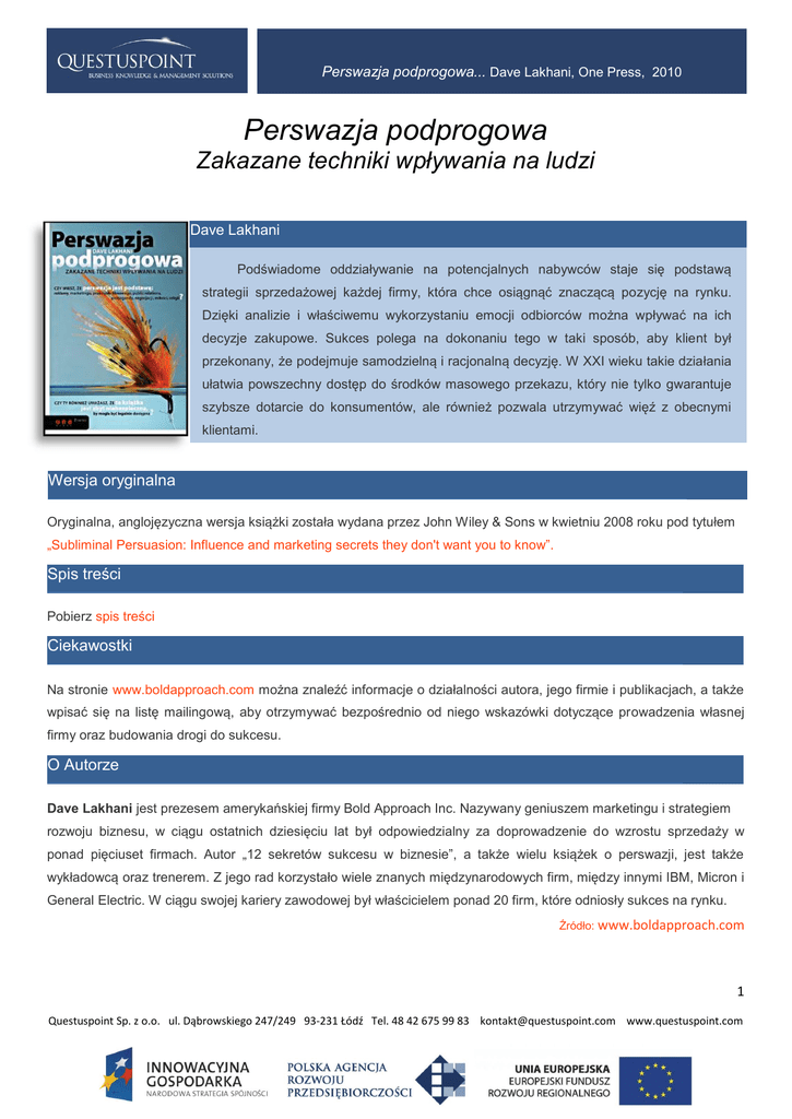 Perswazja podprogowa... Dave Lakhani, One Press, 2010 Perswazja podprogowa Zakazane techniki wpływania na ludzi Dave Lakhani Podświadome oddziaływanie na potencjalnych nabywców staje się podstawą strategii sprzedażowej każdej firmy, która chce osiągnąć znaczącą pozycję na rynku. Dzięki analizie i właściwemu wykorzystaniu emocji odbiorców można wpływać na ich decyzje zakupowe. Sukces polega na dokonaniu tego w taki sposób, aby klient był przekonany, że podejmuje samodzielną i racjonalną decyzję. W XXI wieku takie działania ułatwia powszechny dostęp do środków masowego przekazu, który nie tylko gwarantuje szybsze dotarcie do konsumentów, ale również pozwala utrzymywać więź z obecnymi klientami. Wersja oryginalna Oryginalna, anglojęzyczna wersja książki została wydana przez John Wiley & Sons w kwietniu 2008 roku pod tytułem „Subliminal Persuasion: Influence and marketing secrets they don't want you to know”. Spis treści Pobierz spis treści Ciekawostki Na stronie www.boldapproach.com można znaleźć informacje o działalności autora, jego firmie i publikacjach, a także wpisać się na listę mailingową, aby otrzymywać bezpośrednio od niego wskazówki dotyczące prowadzenia własnej firmy oraz budowania drogi do sukcesu. O Autorze Dave Lakhani jest prezesem amerykańskiej firmy Bold Approach Inc. Nazywany geniuszem marketingu i strategiem rozwoju biznesu, w ciągu ostatnich dziesięciu lat był odpowiedzialny za doprowadzenie do wzrostu sprzedaży w ponad pięciuset firmach. Autor „12 sekretów sukcesu w biznesie”, a także wielu książek o perswazji, jest także wykładowcą oraz trenerem. Z jego rad korzystało wiele znanych międzynarodowych firm, między innymi IBM, Micron i General Electric. W ciągu swojej kariery zawodowej był właścicielem ponad 20 firm, które odniosły sukces na rynku. Źródło: www.boldapproach.com 1 Questuspoint Sp. z o.o. ul. Dąbrowskiego 247/249 93-231 Łódź Tel. 48 42 675 99 83 [email protected] www.questuspoint.com Perswazja podprogowa... Dave Lakhani, One Press, 2010 - 1. Manipulacja, propaganda i edukacja – Działaniami perswazyjnymi bombardowany jest każdy, nie tylko ze strony reklamy i mediów, ale także przez politykę czy religię. I chociaż nie jest łatwo uniknąć tego wpływu, można jednocześnie samemu nauczyć się wywierać go na otoczenie przez poznanie kilku podstawowych pojęć związanych z technikami wpływania na ludzi. Propaganda stosowana (czyli public relations), której narzędziem jest perswazja, ma na celu zwrócić uwagę klienta na produkt lub markę i może stanowić element kształcenia. Jedyną różnicą między propagandą a edukacją jest fakt, że w przypadku edukacji nadawca przekonuje do punktu widzenia, w który sam wierzy. A jeśli w niego nie wierzy, oznacza to, że uprawia propagandę. Niektórzy utożsamiają perswazję z manipulacją. Różnica pomiędzy tymi pojęciami opiera się na kwestiach etycznych. Z tego punktu widzenia manipulacja jest niemoralną formą perswazji i może prowadzić do przykrych konsekwencji dla odbiorcy. Klasycznym przykładem manipulacji jest działalność sekt religijnych, które za wszelką cenę chcą zwerbować do swojej grupy jak najwięcej osób. Perswazja natomiast polega na przekazywaniu swoich przekonań bez negatywnego oddziaływania na innych oraz budowaniu w nich przekonania, że wszelkie podejmowane decyzje są samodzielne i najlepsze. Sukcesem specjalistów z zakresu perswazji jest na przykład rosnąca popularność żywności organicznej. Jedzenie naturalne ma być z założenia zdrowsze od klasycznych produktów i właśnie tak jest postrzegane przez nabywców. Przekonani o znacznej różnicy pomiędzy tymi dwoma rodzajami produktów, konsumenci są skłonni zapłacić więcej, aby uniknąć szkodliwych, chemicznych substancji rzekomo obecnych w „skażonym XXI wiekiem” jedzeniu tradycyjnym. - 2. Racjonalizm kontra emocje – Podstawę efektywnej perswazji stanowi gra emocjami odbiorców. Te, które najczęściej trafiają w czuły punkt, to między innymi: pożądanie, utrata, strach, litość, miłość oraz nienawiść. Kluczem do sukcesu jest wywołanie reakcji, która wzbudzi w odbiorcy potrzebę dokonania zakupu. Przekaz emocjonalny należy skrupulatnie przygotować. Nie sztuką jest bowiem nacechowanie komunikatu emocjami do granic możliwości, lecz umiejętność sprowokowania konkretnej, jednoznacznej i zamierzonej reakcji ze strony odbiorcy. Wymaga to wcześniejszych badań, dzięki którym można określić potrzeby grupy docelowej, na przykład poprzez analizę emocji dominujących na portalach społecznościowych. Pomoże ona zdiagnozować, na które z nich potencjalni klienci są szczególnie wrażliwi. Skuteczne wykorzystanie emocji sprawia, że odbiorcy przestają myśleć racjonalnie i są skłonni do podjęcia decyzji zakupowej, której prawdopodobnie nie podjęliby podczas zimnej kalkulacji. Ponadto, dokonując zakupu pozostają w przekonaniu, że dokonali całkowicie świadomego i umotywowanego wyboru. 2 Questuspoint Sp. z o.o. ul. Dąbrowskiego 247/249 93-231 Łódź Tel. 48 42 675 99 83 [email protected] www.questuspoint.com Perswazja podprogowa... Dave Lakhani, One Press, 2010 Podczas podejmowania decyzji o świadomym angażowaniu emocji należy pamiętać, że podstawą sukcesu jest wybór jednej emocji, którą chcemy „grać” oraz antycypacja reakcji odbiorców na przekaz, która musi bezpośrednio przekładać się na podjęcie decyzji o zakupie. Emocje odbiorców można też wykorzystać w sposób mniej etyczny – poprzez zastosowanie tak zwanego czarnego PRu, którego celem jest eliminacja konkurencji przez wzbudzanie negatywnych odczuć i skojarzeń z nią związanych. - 3. Ewangeliści marki – Emocjonalny komunikat ma znacznie większy zasięg niż informacja neutralna. Wraz z siłą natężenia emocji zwiększa się liczba potencjalnych odbiorców przekazu, po