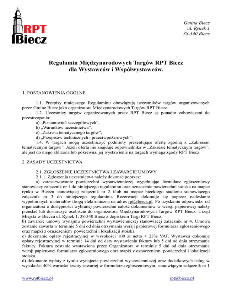 Gmina Biecz ul. Rynek 1 38-340 Biecz Regulamin Międzynarodowych Targów RPT Biecz dla Wystawców i Współwystawców. 1. POSTANOWIENIA OGÓLNE 1.1. Przepisy niniejszego Regulaminu obowiązują uczestników targów organizowanych przez Gminę Biecz jako organizatora Międzynarodowych Targów RPT Biecz. 1.2. Uczestnicy targów organizowanych przez RPT Biecz są ponadto zobowiązani do przestrzegania: a) „Postanowień szczegółowych”, b) „Warunków uczestnictwa”, c) „Zakresu tematycznego targów”, d) „Przepisów technicznych i przeciwpożarowych”. 1.4. W targach mogą uczestniczyć podmioty prezentujące ofertę zgodną z „Zakresem tematycznym targów”. Jeżeli oferta nie znajduje odpowiednika w „Zakresie tematycznym targów”, ale jest do niego zbliżona lub pokrewna, jej wystawienie na targach wymaga zgody RPT Biecz. 2. ZASADY UCZESTNICTWA 2.1. ZGŁOSZENIE UCZESTNICTWA I ZAWARCIE UMOWY 2.1.1. Zgłoszenia uczestnictwa należy dokonać poprzez: a) zarezerwowanie powierzchni wystawienniczej wypełniając formularz zgłoszeniowy stanowiący załącznik nr 1 do niniejszego regulaminu oraz oznaczenie powierzchni stoiska na mapce rynku w Bieczu stanowiącej załącznik nr 2 i/lub na mapce bieckiego stadionu stanowiącego załącznik nr 3 do niniejszego regulaminu. Rezerwacji dokonuje się poprzez nadesłanie wypełnionych materiałów drogą elektroniczną na adres [email protected]. Po uzyskaniu odpowiedzi od organizatora o dostępności wybranej powierzchni całość dokumentów w wersji papierowej należy przesłać lub dostarczyć osobiście do organizatora Międzynarodowych Targów RPT Biecz, Urząd Miejski w Bieczu ul. Rynek 1, 38-340 Biecz z dopiskiem Targi RPT Biecz. b) zawarcie umowy wynajmu powierzchni wystawienniczej stanowiącej załącznik nr 4. Umowa zostanie zawarta w terminie 5 dni od dnia otrzymania wersji papierowej formularza zgłoszeniowego oraz mapki z oznaczeniem powierzchni i lokalizacji stoiska. c) dokonanie opłaty rejestracyjnej w wysokości 100 zł netto + 23% VAT. Wystawca dokonuje opłaty rejestracyjnej w terminie 14 dni od daty wystawienia faktury lub 5 dni od dnia otrzymania faktury. Faktura zostanie wystawiona przez Organizatora w terminie 5 dni od dnia otrzymania wersji papierowej formularza zgłoszeniowego oraz mapki z oznaczeniem powierzchni i lokalizacji stoiska. d) dokonanie wpłaty z tytułu wynajęcia powierzchni wystawienniczej oraz dodatkowych usług w wysokości 40% wartości kwoty zawartej w formularzu zgłoszeniowym, stanowiącym załącznik nr 1 www.rptbiecz.pl [email protected] do niniejszego regulaminu w terminie 14 dni od dnia zawarcia umowy wynajmu powierzchni. W przypadku braku wpłaty zaliczki w podanym terminie rezerwacja powierzchni zostanie anulowana. e) dokonanie dopłaty do całości kwoty zawartej w formularzu zgłoszeniowym i na umowie wynajmu powierzchni. Wpłaty należy dokonać do dnia 15.06.2015 r. f) Wszelkie rozliczenia z zagranicznymi uczestnikami targów RPT dokonywane będą w walucie polskiej. 2.1.2. Zgłoszenia uczestnictwa będą przyjmowane przez organizatora do dnia 30.04.2015 roku określonego jako termin zgłoszeń uczestnictwa. Zgłoszenia uczestnictwa dokonane po tym terminie będą rozpatrywane przez RPT Biecz w miarę dostępności powierzchni wystawienniczej. Szczegółowe informacje są dostępne na formularzach zgłoszeniowych. 2.1.3. Zgłoszenie uczestnictwa jest równoznaczne ze złożeniem formularza zgłoszeniowego stanowiącego zał. nr 1 do regulaminu w targach i wpłatą tytułem opłaty rejestracyjnej w wys. 100 zł. netto oraz uiszczeniem zaliczki w wysokości 40% wartości kwoty zawartej w formularzu zgłoszeniowym. Za datę zgłoszenia uczestnictwa przyjmuje się datę wpływu podpisanej umowy najmu powierzchni do Organizatora RPT Biecz tj: Urząd Miejski w Bieczu, ul. Rynek1, 38-340 Biecz oraz uiszczenie powyższych opłat. 2.1.4. Zamówienie powierzchni wystawienniczej, będące elementem zgłoszenia uczestnictwa w danych targach, polega na wskazaniu rodzaju i wielkości powierzchni wybranej z oferty RPT Biecz przedstawionej na formularzu zgłoszeniowym. 2.1.5. RPT Biecz informuje o przyjęciu zgłoszenia uczestnictwa w targach przesyłając emailem potwierdzenie wielkości, rodzaju przydzielonej powierzchni wystawienniczej oraz jej lokalizację. RPT Biecz zastrzega sobie prawo do rezygnacji z organizacji targów w przypadku nie zebrania dostatecznej liczby wystawców oraz odmowy przyjęcia zgłoszenia uczestnictwa w targach (np. z powodu niezgodności oferty z zakresem tematycznym, wyczerpania możliwości lokalizacyjnych targów). W takim przypadku RPT Biecz dokona zwrotu zaliczki i opłaty rejestracyjnej z tytułu udostępnienia powierzchni wystawienniczej na rachunek bankowy płatnika. Za termin możliwości rezygnacji Organizatora z organizacji targów uznaje się dzień 29.05.2015 r. 2.1.6. RPT Biecz przydziela powierzchnię wystawienniczą uwzględniając warunki lokalizacyjne targów oraz, w miarę możliwości, życzenia zamawiającego. Jeżeli wielkość lub rodzaj powierzchni wystawienniczej potwierdzonej przez organizatora RPT Biecz w potwierdzeniu zgłoszenia uczestnictwa różni się od zamówionej przez zgłaszającego uczestnictwo, umowa jest zawarta na warunkach ustalonych w tym Potwierdzeniu. 2.1.7. RPT Biecz zastrzega sobie prawo zmiany pierwotnie przydzielonej powierzchni wystawienniczej, określonej w zgłoszenia uczestnictwa. Uczestnikowi targów nie przysługuje w takim przypadku prawo do odszkodowania ze strony RPT Biecz. 2.1.8. Wszelkie zmiany zamówienia powierzchni i umowy wynajmu powierzchni wymagają formy pisemnej pod rygorem nieważności. 2.1.9. Podmiot dokonujący zgłoszenia uczestnictwa jest zobowiązany do dokonania opłaty rejestracyjnej, uwzględniającej koszty manipulacyjne związane z rejestracją wystawcy i zamówienia powierzchni oraz dodatkowe świadczenia dla wystawcy. Wysokość opłaty rejestracyjnej i zasady jej płatności są okr
