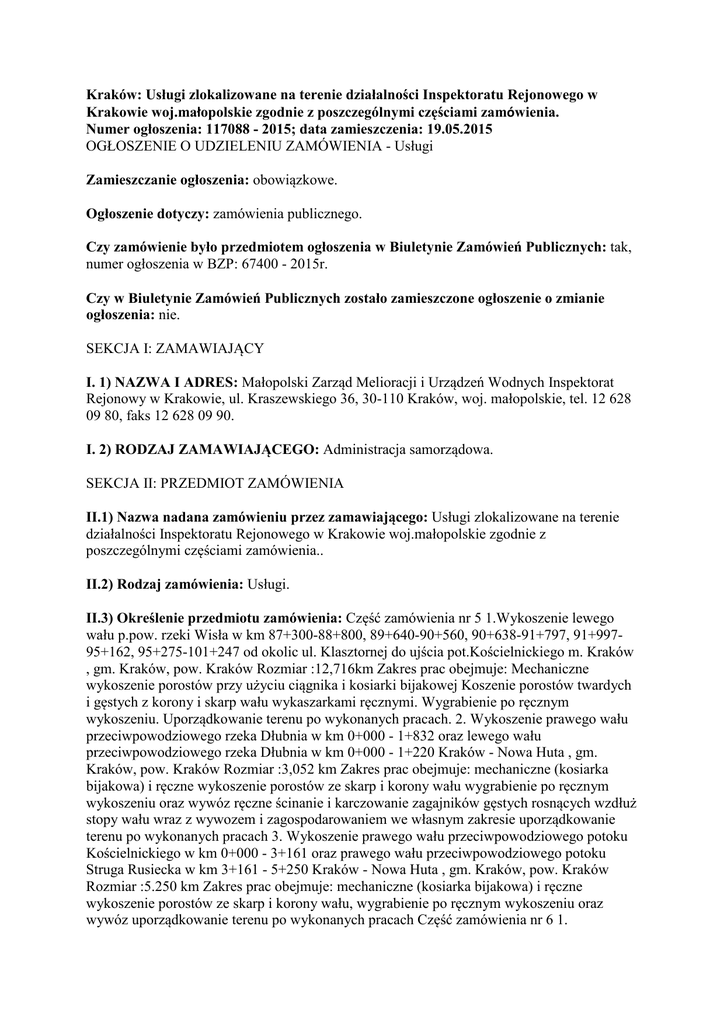 Kraków: Usługi zlokalizowane na terenie działalności Inspektoratu Rejonowego w Krakowie woj.małopolskie zgodnie z poszczególnymi częściami zamówienia. Numer ogłoszenia: 117088 - 2015; data zamieszczenia: 19.05.2015 OGŁOSZENIE O UDZIELENIU ZAMÓWIENIA - Usługi Zamieszczanie ogłoszenia: obowiązkowe. Ogłoszenie dotyczy: zamówienia publicznego. Czy zamówienie było przedmiotem ogłoszenia w Biuletynie Zamówień Publicznych: tak, numer ogłoszenia w BZP: 67400 - 2015r. Czy w Biuletynie Zamówień Publicznych zostało zamieszczone ogłoszenie o zmianie ogłoszenia: nie. SEKCJA I: ZAMAWIAJĄCY I. 1) NAZWA I ADRES: Małopolski Zarząd Melioracji i Urządzeń Wodnych Inspektorat Rejonowy w Krakowie, ul. Kraszewskiego 36, 30-110 Kraków, woj. małopolskie, tel. 12 628 09 80, faks 12 628 09 90. I. 2) RODZAJ ZAMAWIAJĄCEGO: Administracja samorządowa. SEKCJA II: PRZEDMIOT ZAMÓWIENIA II.1) Nazwa nadana zamówieniu przez zamawiającego: Usługi zlokalizowane na terenie działalności Inspektoratu Rejonowego w Krakowie woj.małopolskie zgodnie z poszczególnymi częściami zamówienia.. II.2) Rodzaj zamówienia: Usługi. II.3) Określenie przedmiotu zamówienia: Część zamówienia nr 5 1.Wykoszenie lewego wału p.pow. rzeki Wisła w km 87+300-88+800, 89+640-90+560, 90+638-91+797, 91+99795+162, 95+275-101+247 od okolic ul. Klasztornej do ujścia pot.Kościelnickiego m. Kraków , gm. Kraków, pow. Kraków Rozmiar :12,716km Zakres prac obejmuje: Mechaniczne wykoszenie porostów przy użyciu ciągnika i kosiarki bijakowej Koszenie porostów twardych i gęstych z korony i skarp wału wykaszarkami ręcznymi. Wygrabienie po ręcznym wykoszeniu. Uporządkowanie terenu po wykonanych pracach. 2. Wykoszenie prawego wału przeciwpowodziowego rzeka Dłubnia w km 0+000 - 1+832 oraz lewego wału przeciwpowodziowego rzeka Dłubnia w km 0+000 - 1+220 Kraków - Nowa Huta , gm. Kraków, pow. Kraków Rozmiar :3,052 km Zakres prac obejmuje: mechaniczne (kosiarka bijakowa) i ręczne wykoszenie porostów ze skarp i korony wału wygrabienie po ręcznym wykoszeniu oraz wywóz ręczne ścinanie i karczowanie zagajników gęstych rosnących wzdłuż stopy wału wraz z wywozem i zagospodarowaniem we własnym zakresie uporządkowanie terenu po wykonanych pracach 3. Wykoszenie prawego wału przeciwpowodziowego potoku Kościelnickiego w km 0+000 - 3+161 oraz prawego wału przeciwpowodziowego potoku Struga Rusiecka w km 3+161 - 5+250 Kraków - Nowa Huta , gm. Kraków, pow. Kraków Rozmiar :5.250 km Zakres prac obejmuje: mechaniczne (kosiarka bijakowa) i ręczne wykoszenie porostów ze skarp i korony wału, wygrabienie po ręcznym wykoszeniu oraz wywóz uporządkowanie terenu po wykonanych pracach Część zamówienia nr 6 1. Konserwacja prawego wału rz. Wisły w km 45+750-52+200, 52+260-56+010, 56+12557+490 w m. Jaśkowice, Pozowice, Facimiech, Ochodza, Borek Szlachecki, Kopanka, Skawina, gm. Skawina, pow. krakowski Rozmiar: 11,565 km Zakres prac obejmuje: Należy dokonać wykoszenia skarp i korony wałów kosiarką bijakową (90% zakresu robót) oraz wykoszenia skarp w sposób ręczny na odcinkach gdzie użycie kosiarki bijakowej jest niemożliwe (10% zakresu robót) wraz z wygrabieniem ręcznie skoszonych porostów. 2. Konserwacja prawego i lewego wału rz. Skawinki w km wał prawy - 0+000-2+750, 3+5004+200, 7+300-7+890, 8+523-9+500, 9+657-9+906; wał lewy - 0+000-1+673, 7+550-8+460, 9+027-9+350; w m. Skawina, Radziszów, gm. Skawina Rozmiar: 8.172 km Zakres prac obejmuje: Należy dokonać wykoszenia skarp i korony wałów kosiarką bijakową (90% zakresu robót) oraz wykoszenia skarp w sposób ręczny na odcinkach gdzie użycie kosiarki bijakowej jest niemożliwe (10% zakresu robót) wraz z wygrabieniem ręcznie skoszonych porostów. 3.Konserwacja wału rzeki Sosnówki w km 0+000-2+476 wału prawego oraz w km 0+000-2+475 wału lewego w m. Facimiech, Wielkie Drogi, gm. Skawina, pow. krakowski Rozmiar: 4.951 km Zakres prac obejmuje: Należy dokonać wykoszenia skarp i korony wałów, częściowo międzywala (w sąsiedztwie mostu drogowego - 1,2ha) kosiarką bijakową (90% zakresu) oraz w miejscach gdzie niemożliwa jest praca kosiarki bijakowej ręczne wykoszenie (10%) wraz ze zgrabieniem porostów ze skarp. Część zamówienia nr 7 1. Konserwacja lewego i prawego wału przeciwpowodziowego rzeki Rudawa, prawy wał w km 0+000 - 10+646, lewy wał w km 0+000-9+595, lewy wał w km 0+000-0+920 oraz potoku Olszanickiego, prawy wał w km 0+000-0+160, lewy wał w km 0+000-0+180 m. Kraków, gm. Kraków, m. Rząska, Szczyglice, Zabierzów gm. Zabierzów Rozmiar 21.501 km Zakres prac obejmuje: mechaniczne wykoszenie korony, skarp wału oraz międzywala, porost gęsty twardy, szer. skarpy ponad 2.0m, ręczne wykoszenie z wygrabieniem porostów twardych ze skarp z wywozem 2. Konserwacja lewego i prawego wału przeciwpowodziowego potoku Rudno, prawy wał km 0+000-1+068, lewy wał km 0+000-1+162m, Czernichów, gm.Czernichów, pow.krakowski Zakres prac obejmuje: mechaniczne wykoszenie korony, skarp wału, porost gęsty twardy, szer. skarpy ponad 2.0m 3. Konserwacja lewego i prawego wału przeciwpowodziowego rzeki Sanka, prawy wał km 0+000-4+459, lewy wał km 0+0004+371 oraz lewego i prawego wału p.pow. pot.Brzoskwinka, prawy wał km 0+000-0+330, lewy wał km 0+000-0+330, m. Kryspinów, Liszki, Budzyń, Cholerzyn, gm.Liszki, pow.krakowski, m. Kraków, gm.Kraków Rozmiar: 9.490 km Zakres prac obejmuje: mechaniczne wykoszenie korony, skarp wału, porost gęsty twardy, szer. skarpy ponad 2.0m 4. Konserwacja lewego wału przeciwpowodziowego rzeki Wisła w km 54+630 - 59+500, 60+180 - 62+655, 64+265 - 64+765 m, Jeziorzany, Ściejowice, Piekary, gm. Liszki, m. Kraków,gm. Kraków Rozmiar :7.845 km Zakres prac obejmuje: mechaniczne wykoszenie korony, skarp wału, porost gęsty twardy, szer. skarpy ponad 2.0m 5. Konserwacja bieżąca lewego wału przeciwpowodziowego rzeki Wisły w km 36+300-43+770, 43+890-47+059, 47+131-49+361, 49+3
