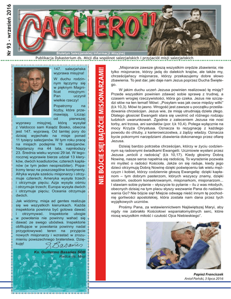 147. salezjańska wyprawa misyjna! W duchu rodzinnym łączymy się w pięknym Magnificat misyjnym: Pan uczynił wielkie rzeczy! Popatrzmy na liczby, które przemawiają. Licząc od pierwszej wyprawy misyjnej, którą wysyłał z Valdocco sam Ksiądz Bosko, obecna jest 147. wyprawą. Od tamtej pory do dzisiaj wyjechało na misje ponad 11 tysięcy salezjanów. W tym roku pracę na misjach podejmie 19 salezjanów. Najstarszy ma 44 lata, najmłodszy 23. Średnia wieku wynosi 29 lat. W tegorocznej wyprawie bierze udział 13 kleryków, dwóch koadiutorów, czterech kapłanów (w tym jeden neoprezbiter). Popatrzmy teraz na poszczególne kontynenty. Afryka wysyła sześciu misjonarzy i otrzymuje czterech; Ameryka wysyła trzech i otrzymuje pięciu; Azja wysyła ośmiu i otrzymuje trzech; Europa wysyła dwóch i otrzymuje pięciu; Oceania otrzymuje dwóch. Jak widzimy, misja ad gentes realizuje się we wszystkich kierunkach. Każda inspektoria powinna być gotowa dawać i otrzymywać. Inspektorie ubogie w powołania nie powinny wahać się dawać ze swego ubóstwa. Inspektorie obfitujące w powołania powinny nadal przygotowywać teren na przyjęcie nowych misjonarzy i wzrastać w zrozumieniu powszechnego braterstwa. Dziękuję! NIE BÓJCIE SIĘ! BĄDŹCIE MISJONARZAMI! Nr 93 - wrzesień 2016 Biuletyn Salezjanskiej Informacji Misyjnej Publikacja Dykasterium ds. Misji dla wspólnot salezjańskich i przyjaciół misji salezjańskich „Misjonarze zawsze głoszą wszystkim orędzie zbawienia; nie tylko misjonarze, którzy jadą do dalekich krajów, ale także my, chrześcijańscy misjonarze, którzy przekazujemy dobre słowo zbawienia. To jest dar, jaki daje nam Jezus poprzez Ducha Świętego. W jakim duchu uczeń Jezusa powinien realizować tę misję? Przede wszystkim powinien zdawać sobie sprawę z trudnej, a czasem wrogiej rzeczywistości, która go czeka. Jezus nie szczędzi słów na ten temat! Mówi: „Posyłam was jak owce między wilki” (Łk 10,3). Mówi to jasno. Wrogość jest zawsze u początku prześladowania chrześcijan. Jezus wie, że misję utrudniają dzieła złego. Dlatego głosiciel Ewangelii stara się uwolnić od różnego rodzaju ludzkich uwarunkowań. Zgodnie z zaleceniem Jezusa nie nosi torby, ani trzosa, ani sandałów (por. Łk 10,4). Polega wyłącznie na mocy Krzyża Chrystusa. Oznacza to rezygnację z każdego powodu do chluby, z karierowiczostwa, z żądzy władzy. Oznacza bycie pokornymi narzędziami zbawienia dokonanego przez ofiarę Jezusa. Dzisiaj bardzo potrzeba chrześcijan, którzy w życiu codziennym są radosnymi świadkami Ewangelii. Uczniowie wysłani przez Jezusa „wrócili z radością” (Łk 10,17). Kiedy głosimy Dobrą Nowinę, nasze serce napełnia się radością. To wyrażenie pozwala mi myśleć o radości Kościoła. Jakże on się raduje, kiedy jego dzieci otrzymują Dobrą Nowinę dzięki poświęceniu tak wielu mężczyzn i kobiet, którzy codziennie głoszą Ewangelię: dzięki kapłanom – tym dobrym pasterzom, których wszyscy znamy, dzięki siostrom, osobom konsekrowanym, misjonarkom, misjonarzom... I stawiam sobie pytanie – słyszycie to pytanie – ilu z was młodych, obecnych dzisiaj na tym placu słyszy wezwanie Pana do naśladowania Go? Nie bójcie się! Miejcie odwagę nieść innym tę pochodnię gorliwości apostolskiej, która została nam dana przez tych wyjątkowych uczniów. Prośmy Pana, za wstawiennictwem Najświętszej Maryi, aby nigdy nie zabrakło Kościołowi wspaniałomyślnych serc, które niosą wszystkim miłość i czułość Ojca Niebieskiego”. Ks. Guillermo Basańes SDB Radca ds. Misji Papież Franciszek Anioł Pański, 3 lipca 2016 UCZESTNICY 147. SALEZJAŃSKIEJ WYPRAWY MISYJNEJ Imię i nazwisko Inspektoria pochodzenia Przeznaczenie 1. Ks. Fidelius Marie ADJANOHOUN AFO Peru (PER) 2. Ko. Jose Maria CASTILLO VERGARA FIN Brazylia (BMA) 3. Kl. Nicholas CHIBUEZE AFW Taiwan (CIN) 4. Kl. Paulraj CHINNAPPAN INM Paragwaj (PAR) 5. Ks. Gabriel CRUZ MEM Pakistan (FIS) 6. Kl. Jose Wilker FRANÇA DA SILVA BRE Bułgaria (CEP) 7. Kl. Cirilo Patricio DE DEUS ITM Belgia (BEN) 8. Ks. Mario DOS SANTOS ITM 9. Kl. Juliao DOS SANTOS ITM 10. Ks. Sławomir DRAPIEWSKI PLO Mongolia (VIE) Papua Nowa Gwinea (PGS) Brazylia (BMA) 11. Kl. Emmanuel ILODIGWE AFW Węgry (UNG) 12. Kl. Ilunga Martin Pacifique KALWIBA AFC Tunezja (ISI) 13. AFC MDG Bułgaria (CEP) 15. Kl. Jean-Paul MUTOMBO Kl. Harinala Hugue Romel RANDRIAMALALATIANA Kl. Augusto RODRIGUES DE SOUZA BMA Mozambik (MOZ) 16. Kl. Vincent Vinh Hien TRAN VIE Projekt Europa 17. Kl. Joseph Phuc Huu DANG VIE Nigeria (AFW) 18. Kl. Paul Ky Quan Dai TRAN VIE 19. Ko. Reto WANNER GER Nigeria (AFW) Papua Nowa Gwinea (PGS) 14. Paragwaj (PAR) Świadectwo salezjańskiej świętości misyjnej Ks. Pierluigi Cameroni, Postulator Generalny ds. Kanonizacyjnych Rodziny Salezjańskiej Sługa Boży, ksiądz Carlo Braga (1889-1971), misjonarz w Chinach i na Filipinach, pisał w 1964 roku: „Powinienem mieć świętość konieczną do reprezentowania miłosierdzia, dobroci, cierpliwości Boskiego Zbawiciela. Powinienem poświęcać się aż do śmierci dla tych, których Bóg mi powierza! Doskonale rozumiem, że aby zbawić, ocalić, ratować, budować, potrzeba krwi i całkowitego poświęcenia samego siebie. Proszę mi pomóc w tej posłudze, aby owocna była zbawcza ofiara Najświętszej Krwi Jezusa. W pojedynkę nie dam rady, jestem tylko kroplą zagubioną w oceanie. Potrzebuję wsparcia heroicznych i wspaniałomyślnych dusz”. Salezjańska Intencja Misyjna Aby 147. salezjańska wyprawa misyjna ożywiła ducha misyjnego i entuzjazm powołaniowy w całym Zgromadzeniu Salezjańskim. W historii naszego Zgromadzenia wyprawy misyjne ad gentes, ad exteros i ad vitam były konkretnym wyrazem misyjnego wymiaru charyzmatu Księdza Bosko. Módlmy się, aby ta wyprawa misyjna ożywiła zapał apostolski i radość ewangelizowania w salezjanach i rozbudziła nowe powołania salezjańskie.