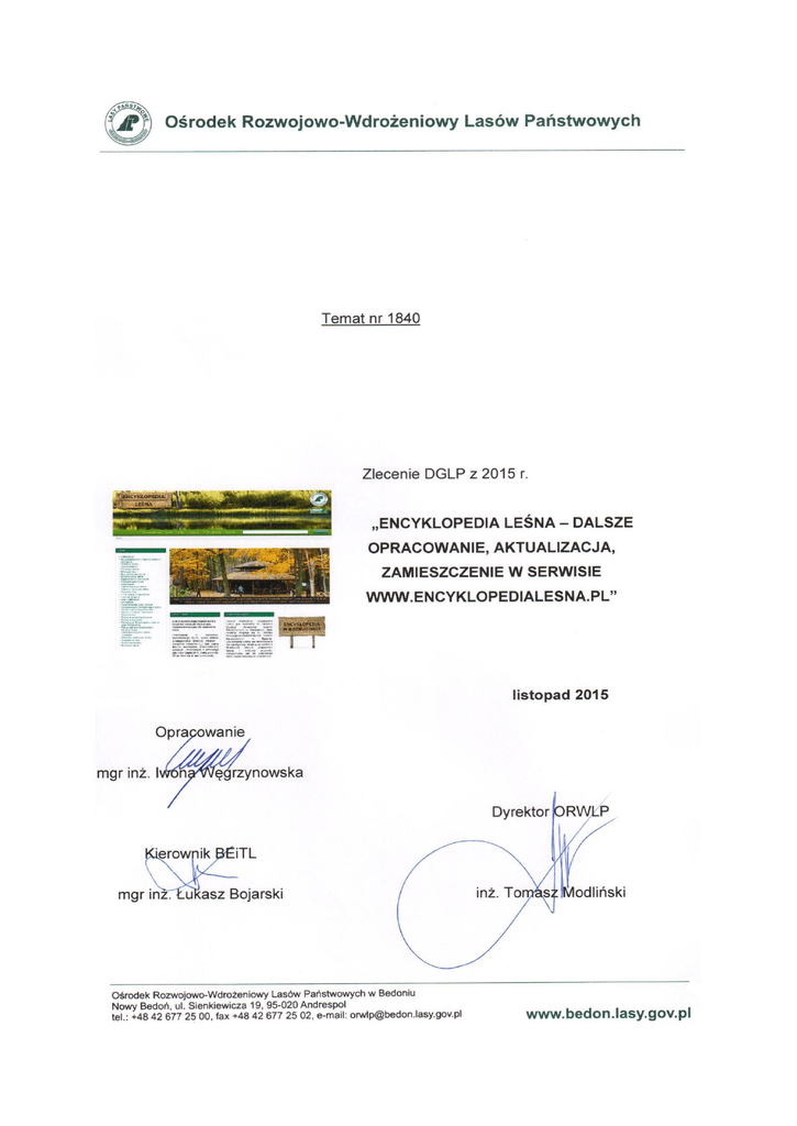 Spis treści Wstęp…………….. ..................................................................................................... 3 1. Encyklopedia leśna w latach 2006 – 2008 oraz w latach 2012 - 2014................... 3 2. Prace nad encyklopedią w roku 2015 .................................................................... 7 3. Statystyka encyklopedii leśnej ............................................................................... 8 4. Wnioski ................................................................................................................ 12 2 Wstęp Encyklopedia leśna, to portal który został stworzony dla rozpropagowania i zgłębiania wiedzy o lesie, ochronie środowiska, polityce i historii leśnictwa, gospodarce leśnej oraz innych dziedzinach z nią związanych. Grupą docelową jest szerokie grono odbiorców, nie tylko leśników, ale przede wszystkim osób, które chcą wiedzieć więcej o lesie oraz zgłębić wiedzę w tej dziedzinie. Prace nad encyklopedią trwają z przerwami od 2006 roku. Pierwszy etap obejmował lata 2006 – 2008, w tym okresie częściowo opracowano hasła z 27 działów. Planowane było sukcesywne uzupełnianie ich oraz rozbudowywanie o dodatkowe elementy. Wznowienie prac nastąpiło w roku 2012, i od tego roku opracowanych zostało ok 9 000 haseł z 26 działów, hasła te były opracowywane kompleksowo, tj. zawierały dużą ilość dodatkowych elementów takich jak: zdjęcia, rysunki, tabele, mapy, krótkie filmy tematyczne, publikacje oraz strony www powiązane tematycznie. Hasła zamieszczone w encyklopedii leśnej pogrupowane są w 33 działach, które obejmują wszystkie dziedziny dotyczące lasu i gospodarki leśnej. Niektóre z działów podzielone są jeszcze na poddziały (jest ich 40), aby potencjalny użytkownik strony nie miał problemu z odnalezieniem konkretnego tematu, który go interesuje. 1. Encyklopedia leśna w latach 2006 – 2008 oraz w latach 2012 – 2014. W pierwszym etapie prac nad encyklopedią (lata 2006 – 2008) powstała koncepcja wizualizacji encyklopedii w tym również podział tematyczny na działy. Podczas pierwszych lat pracy nad encyklopedią powstało 4 500 haseł z 27 działów. W ostatnich latach (2012 i 2014) prace skupiono na tych działach, które nie były opracowywane wcześniej lub opracowane były w niewielkim stopniu. W ciągu tych lat autorzy opracowali ok 9 000 haseł z 26. Szczegółowy ich podział obrazuje tabela nr 1. Autorami opracowanych haseł byli uznani specjaliści z poszczególnych dziedzin nauk leśnych. Zespół redakcyjny kładł nacisk, aby nowe hasła opracowywane były jak najbardziej kompleksowo, tj. oprócz definicji obejmowały też pozostałe elementy: zdjęcia, rysunki, tabele, mapy, powiązane tematycznie publikacje i strony www. 3 Tabela nr 1. Zestawienie haseł opracowanych w latach 2006 – 2014. Lp. Dział Ilość haseł (definicji) 1 Arborystyka 388 2 BHP w Leśnictwie 188 3 Botanika leśna 545 4 Dendrometria 198 5 Edukacja leśna 61 6 Ekologia lasu 419 7 Ekonomika w leśnictwie 102 8 Entomologia leśna 401 9 Ergonomia w leśnictwie 613 10 Fitopatologia leśna 260 11 Geomatyka 855 12 Glebozawstwo leśne 1022 13 Historia i tradycja leśna 103 14 Hodowla lasu 819 15 Informatyka w leśnictwie 168 16 Inżynieria leśna 993 4 Uwagi – pozostałe elementy 96 – zdjęć 21 – rysunków 36 – tabel 172 – publikacje 179 – strony www 2 – zdjęcia 10 – rysunków 6 – tabel 13 – publikacji 42 – strony www 236 zdjęć 187 publikacji 9 – zdjęć 1 – rysunek 28 – publikacji 1 – strona www 9 – zdjęć 13 – stron www 14 – tabel 22 – rysunki 375 – publikacji 18 – publikacji 114 – zdjęć 23 – rysunki 60 filmów 44 publikacje 44 strony www 40 zdjęcia 31 – zdjęć 17 – tabel 30 – map 19 – rysunków 246 – stron www 472 – zdjęć 1 – rysunek 28 – publikacji 1 – strona www 52 – zdjęcia 1 – rysunek 48 – publikacji 13 – strony www 28 – zdjęć 204 – publikacje 15 – zdjęć 6 – tabel 84 – rysunki 5 – filmów 81 – publikacji 105 – stron www 149 – zdjęć 29 – tabel 182 – rysunki Lp. Dział Ilość haseł (definicji) 17 Lasy i leśnictwo 94 18 Łowiectwo 818 19 Mechanizacja prac leśnych 700 20 Meteorologia i klimatologia leśna 332 21 22 Nauka o produkcyjności lasu Nauka o surowcu drzewnym 28 378 23 Ochrona lasu 283 24 Ochrona przeciwpożarowa 42 25 Ochrona przyrody 483 26 PGL LP Prawo ochrony środowiska i polityka leśna 63 27 Uwagi – pozostałe elementy 866 – publikacji 750 – stron www 254 – zdjęcia 72 – rysunki 642 – publikacji 215 – stron www 700 – zdjęć 12 – tabel 13 – rysunków 676 – filmy 678 – publikacji 646 – stron www 6 – zdjęć 9 – tabel 19 – rysunków 4 – publikacje 3 – strony www 104 – zdjęcia 11 – tabel 22 – rysunki 2 – mapy 254 – publikacje 35 – stron www 18 – zdjęć 9 – rysunków 33 – publikacje 7 – stron www 232– zdjęć 2 – mapy 7 – tabel 87 – publikacji 137 – stron www 188 28 Siedliskoznawstwo leśne 426 29 Turystyka 178 30 Uboczne użytkowanie lasu 141 31 Urządzanie lasu 395 5 164 – zdjęcia 39 – tabel 25 – rysunków 246 – map 130 – stron www 345 – publikacji Tabele i mapy do 17 haseł 35 – zdjęć 1 – rysunek 138 – publikacji 68 – stron www 20 – map 49 – tabel 6 – rysunków 13 – publikacje Lp. Dział Ilość haseł (definicji) 32 Użytkowanie lasu 648 33 Zoologia leśna 1228 Uwagi – pozostałe elementy 11 – stron www 80 zdjęć 185 – zdjęć 259 – tabel 662 – rysunki 399 – map 1113 – publikacje 838 – stron www Autorami opracowanych haseł byli uznani specjaliści z poszczególnych dziedzin nauk leśnych: prof. dr hab. inż. Anna Barszcz – uboczne użytkowanie lasu prof. dr hab. Stanisław Brożek – gleboznawstwo leśne prof. dr hab. Władysław Chałupka – historia i tradycja leśna prof. dr hab. Albert Dudek – dendrometria pr