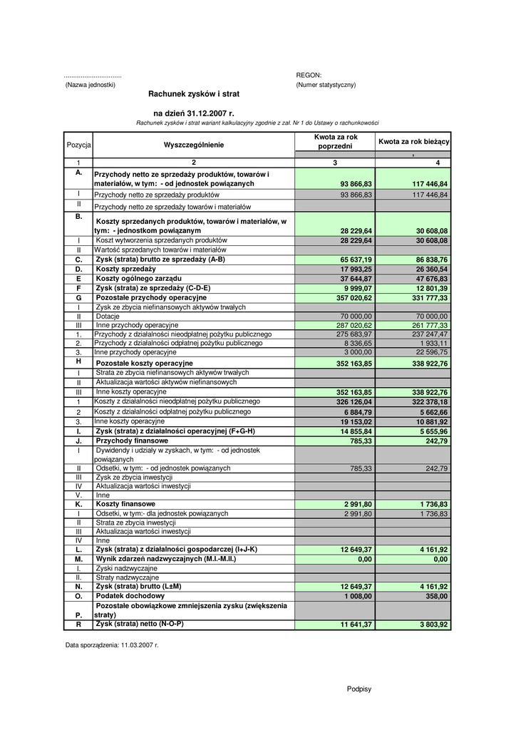 .............................................. (Nazwa jednostki) REGON: (Numer statystyczny) Rachunek zysków i strat na dzień 31.12.2007 r. Rachunek zysków i strat wariant kalkulacyjny zgodnie z zał. Nr 1 do Ustawy o rachunkowości Pozycja Wyszczególnienie Kwota za rok poprzedni 1 A. 2 3 Kwota za rok bieżący , I II B. I II C. D. E F G I II III 1. 2. 3. H I II III 1 2 3. I. J. I II III IV V. K. I II III IV L. M. I. II. N. O. P. R 4 Przychody netto ze sprzedaży produktów, towarów i materiałów, w tym: - od jednostek powiązanych 93 866,83 117 446,84 Przychody netto ze sprzedaży produktów 93 866,83 117 446,84 28 229,64 28 229,64 30 608,08 30 608,08 65 637,19 17 993,25 37 644,87 9 999,07 357 020,62 86 838,76 26 360,54 47 676,83 12 801,39 331 777,33 70 000,00 287 020,62 275 683,97 8 336,65 3 000,00 70 000,00 261 777,33 237 247,47 1 933,11 22 596,75 352 163,85 338 922,76 352 163,85 326 126,04 6 884,79 19 153,02 14 855,84 785,33 338 922,76 322 378,18 5 662,66 10 881,92 5 655,96 242,79 785,33 242,79 2 991,80 2 991,80 1 736,83 1 736,83 12 649,37 0,00 4 161,92 0,00 12 649,37 1 008,00 4 161,92 358,00 11 641,37 3 803,92 Przychody netto ze sprzedaży towarów i materiałów Koszty sprzedanych produktów, towarów i materiałów, w tym: - jednostkom powiązanym Koszt wytworzenia sprzedanych produktów Wartość sprzedanych towarów i materiałów Zysk (strata) brutto ze sprzedaży (A-B) Koszty sprzedaży Koszty ogólnego zarządu Zysk (strata) ze sprzedaży (C-D-E) Pozostałe przychody operacyjne Zysk ze zbycia niefinansowych aktywów trwałych Dotacje Inne przychody operacyjne Przychody z działalności nieodpłatnej pożytku publicznego Przychody z działalności odpłatnej pożytku publicznego Inne przychody operacyjne Pozostałe koszty operacyjne Strata ze zbycia niefinansowych aktywów trwałych Aktualizacja wartości aktywów niefinansowych Inne koszty operacyjne Koszty z działalności nieodpłatnej pożytku publicznego Koszty z działalności odpłatnej pożytku publicznego Inne koszty operacyjne Zysk (strata) z działalności operacyjnej (F+G-H) Przychody finansowe Dywidendy i udziały w zyskach, w tym: - od jednostek powiązanych Odsetki, w tym: - od jednostek powiązanych Zysk ze zbycia inwestycji Aktualizacja wartości inwestycji Inne Koszty finansowe Odsetki, w tym:- dla jednostek powiązanych Strata ze zbycia inwestycji Aktualizacja wartości inwestycji Inne Zysk (strata) z działalności gospodarczej (I+J-K) Wynik zdarzeń nadzwyczajnych (M.I.-M.II.) Zyski nadzwyczajne Straty nadzwyczajne Zysk (strata) brutto (L±M) Podatek dochodowy Pozostałe obowiązkowe zmniejszenia zysku (zwiększenia straty) Zysk (strata) netto (N-O-P) Data sporządzenia: 11.03.2007 r. Podpisy