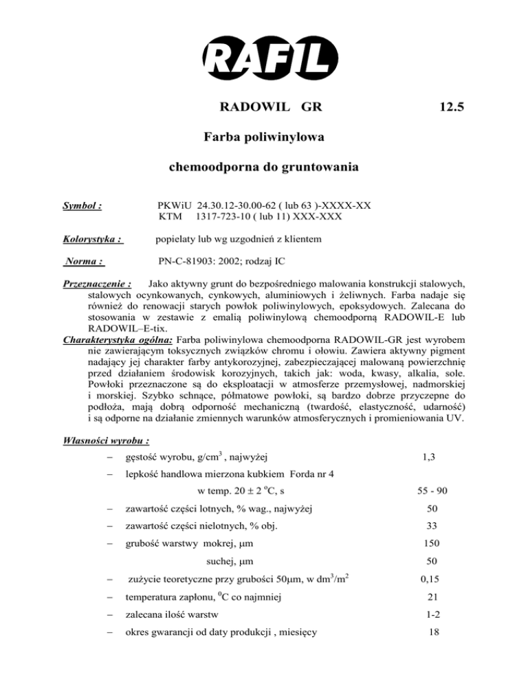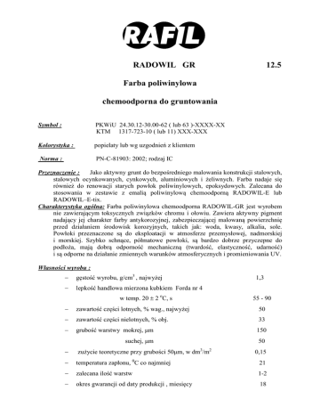RADOWIL GR 12.5 Farba poliwinylowa chemoodporna do gruntowania Symbol : PKWiU 24.30.12-30.00-62 ( lub 63 )-XXXX-XX KTM 1317-723-10 ( lub 11) XXX-XXX Kolorystyka : popielaty lub wg uzgodnień z klientem orma : PN-C-81903: 2002; rodzaj IC Przeznaczenie : Jako aktywny grunt do bezpośredniego malowania konstrukcji stalowych, stalowych ocynkowanych, cynkowych, aluminiowych i żeliwnych. Farba nadaje się również do renowacji starych powłok poliwinylowych, epoksydowych. Zalecana do stosowania w zestawie z emalią poliwinylową chemoodporną RADOWIL-E lub RADOWIL–E-tix. Charakterystyka ogólna: Farba poliwinylowa chemoodporna RADOWIL-GR jest wyrobem nie zawierającym toksycznych związków chromu i ołowiu. Zawiera aktywny pigment nadający jej charakter farby antykorozyjnej, zabezpieczającej malowaną powierzchnię przed działaniem środowisk korozyjnych, takich jak: woda, kwasy, alkalia, sole. Powłoki przeznaczone są do eksploatacji w atmosferze przemysłowej, nadmorskiej i morskiej. Szybko schnące, półmatowe powłoki, są bardzo dobrze przyczepne do podłoża, mają dobrą odporność mechaniczną (twardość, elastyczność, udarność) i są odporne na działanie zmiennych warunków atmosferycznych i promieniowania UV. 㨬 Własności wyrobu : − gęstość wyrobu, g/cm3 , najwyżej − lepkość handlowa mierzona kubkiem Forda nr 4 w temp. 20 ± 2 oC, s 1,3 55 - 90 − zawartość części lotnych, % wag., najwyżej 50 − zawartość części nielotnych, % obj. 33 − grubość warstwy mokrej, µm 150 suchej, µm 50 − zużycie teoretyczne przy grubości 50µm, w dm3/m2 − temperatura zapłonu, 0C co najmniej 21 − zalecana ilość warstw 1-2 − okres gwarancji od daty produkcji , miesięcy 18 0,15 Պ RADOWIL GR Farba poliwinylowa chemoodporna do gruntowania Stosowanie 1. Podłoże : Powierzchnie stalowe odtłuścić i oczyścić do stopnia St 2 lub St 3 wg PN-ISO 8501-1:1996. Możliwe jest w tym celu zastosowanie metod: szlifowania, szczotkowania, dłutowania lub skrobania. Powierzchnie ocynkowane, które spełniają wymagania PN-EN-22063:1996 lub ISO 1461:1973, powinny być suche i odtłuszczone. Wszystkie ewentualne produkty korozji należy dokładnie usunąć. W przypadku występowania ,,białej rdzy" zaleca się zmycie wodą pod wysokim ciśnieniem, usunięcie zanieczyszczeń przy pomocy szczotek nylonowych lub syntetycznych włóknin zawierających ścierniwo i nasyconych 5% roztworem amoniaku. Przy renowacji: stare, spękane, słabo przylegające powłoki należy starannie usunąć, miejsca zardzewiałe dokładnie przeszlifować, odpylić, a następnie zagruntować farbą do gruntowania RADOWIL GR. Stare dobrze przyczepne powłoki zmatowić papierem ściernym i odpylić. 2. Metoda nakładania : Natrysk hydrodynamiczny, pneumatyczny, pędzel. atrysk pneumatyczny: lepkość robocza 30 s (kubek Forda nr 4, temp. 20 ± 2 oC), atrysk hydrodynamiczny: średnica dyszy 0,28 - 0,38 mm (0,011 - 0,015") ciśnienie na dyszy 120 - 200 barów 3. Przygotowanie farby: Przed przystąpieniem do malowania farbę należy dokładnie wymieszać w opakowaniu. Rozcieńczalnik : do wyrobów poliwinylowych PKWiU 24.30.22-73.00-74-0001-XX KTM 1318-157-35010-0XX Rozcieńczalnik do mycia aparatury : jak wyżej 4. Warunki malowania : temperatura podłoża nie niższa niż 5 oC i nie wyższa niż 35 oC, i o 3 oC wyższa od temperatury punktu rosy, − wilgotność względna powietrza najwyżej 80 %, − dobra wentylacja. − temperatura otoczenia nie niższa niż 5 oC i nie wyższa niż 35 oC. − 㨴 5. Czas schnięcia : w temp. 20 ± 2 oC i wilgotności względnej powietrza 55 ± 5 % stopień 1 - 0,5 h; stopień 3 - 3 h 6. Czas do nakładania kolejnej warstwy : w temp. 20 ± 2 oC min. - 1 h 7. Czas całkowitego wyschnięcia powłoki : w temp. 20 ± 2 oC min. - 48 h Czasy te mogą ulec zmianie wraz ze zmianą temperatury, wilgotności powietrza, warunków wentylacji, ilości warstw i grubości powłoki. 8. astępne wymalowania : emalie poliwinylowe RADOWIL-E, RADOWIL-E TIX, farby poliwinylowe nawierzchniowe RADACH lub emalie ftalowe produkcji RAFIL SA. Warunki BHP i P.Poż.: Ze względu na lotne i palne składniki wyrobu należy przestrzegać zasad i przepisów BHP i p. poż. zawartych w Karcie Charakterystyki Preparatu Niebezpiecznego. Przechowywanie, transport: Wyrób należy przechowywać zgodnie z PN-C-81400: 1989 w oryginalnych, szczelnie zamkniętych opakowaniach, w pomieszczeniach zadaszonych, z dala od źródeł ognia i iskrzenia, w pomieszczeniach zamkniętych intensywnie wietrzonych, w temperaturze (-20)÷30°C. Transport zgodnie z w/w normą w opakowaniach producenta, w warunkach zabezpieczających przed uszkodzeniami mechanicznymi oraz zgodnie z obowiązującymi przepisami transportowymi. Informacje dodatkowe : RADOWIL-GR posiada Atest Higieniczny PZH oraz Opinię Techniczną Instytutu Elektrotechniki we Wrocławiu nr 504-5690-26-ZM/MK-47/97. Podane informacje i zalecenia wynikają z badań laboratoryjnych i praktyki aplikacyjnej. W przypadku specjalnych zastosowań służymy dodatkowymi informacjami. RADOMSKA FABRYKA FARB I LAKIERÓW RAFIL SA 26-600 Radom, ul. Czarna 29, tel: centrala (048) 36 71 900, marketing (048) 36 71 991 fax: (048) 36 71 990, e-mail: [email protected] 09.2005