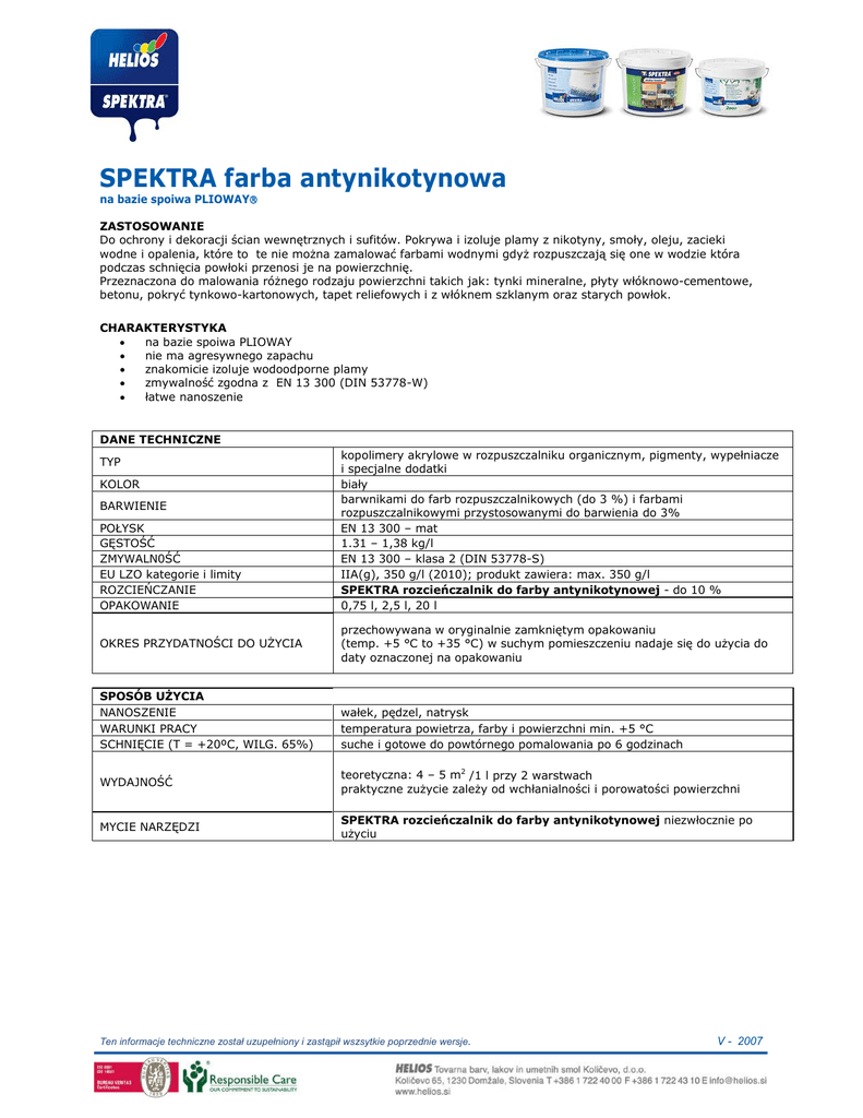 SPEKTRA farba antynikotynowa na bazie spoiwa PLIOWAY ZASTOSOWANIE Do ochrony i dekoracji ścian wewnętrznych i sufitów. Pokrywa i izoluje plamy z nikotyny, smoły, oleju, zacieki wodne i opalenia, które to te nie można zamalować farbami wodnymi gdyż rozpuszczają się one w wodzie która podczas schnięcia powłoki przenosi je na powierzchnię. Przeznaczona do malowania różnego rodzaju powierzchni takich jak: tynki mineralne, płyty włóknowo-cementowe, betonu, pokryć tynkowo-kartonowych, tapet reliefowych i z włóknem szklanym oraz starych powłok. CHARAKTERYSTYKA • na bazie spoiwa PLIOWAY • nie ma agresywnego zapachu • znakomicie izoluje wodoodporne plamy • zmywalność zgodna z EN 13 300 (DIN 53778-W) • łatwe nanoszenie DANE TECHNICZNE TYP KOLOR BARWIENIE POŁYSK GĘSTOŚĆ ZMYWALN0ŚĆ EU LZO kategorie i limity ROZCIEŃCZANIE OPAKOWANIE OKRES PRZYDATNOŚCI DO UŻYCIA SPOSÓB UŻYCIA NANOSZENIE WARUNKI PRACY SCHNIĘCIE (T = +20ºC, WILG. 65%) kopolimery akrylowe w rozpuszczalniku organicznym, pigmenty, wypełniacze i specjalne dodatki biały barwnikami do farb rozpuszczalnikowych (do 3 %) i farbami rozpuszczalnikowymi przystosowanymi do barwienia do 3% EN 13 300 – mat 1.31 – 1,38 kg/l EN 13 300 – klasa 2 (DIN 53778-S) IIA(g), 350 g/l (2010); produkt zawiera: max. 350 g/l SPEKTRA rozcieńczalnik do farby antynikotynowej - do 10 % 0,75 l, 2,5 l, 20 l przechowywana w oryginalnie zamkniętym opakowaniu (temp. +5 °C to +35 °C) w suchym pomieszczeniu nadaje się do użycia do daty oznaczonej na opakowaniu wałek, pędzel, natrysk temperatura powietrza, farby i powierzchni min. +5 °C suche i gotowe do powtórnego pomalowania po 6 godzinach WYDAJNOŚĆ teoretyczna: 4 – 5 m2 /1 l przy 2 warstwach praktyczne zużycie zależy od wchłanialności i porowatości powierzchni MYCIE NARZĘDZI SPEKTRA rozcieńczalnik do farby antynikotynowej niezwłocznie po użyciu Ten informacje techniczne został uzupełniony i zastąpił wszsytkie poprzednie wersje. V - 2007 PRZYGOTOWANIE POWIERZCHNI Powierzchnia powinna być wolna od pyłu oraz innych zabrudzeń. Należy usunąć łuszczące się wymalowania. Pęknięcia powierzchni powinny być uzupełnione odpowiednim materiałem mineralnym. Przed pomalowaniem powierzchnia powinna być sucha i utwardzona. Na powierzchnie zaatakowane przez pleśń zastosować SPEKTRA środek z biocydem SANITOL. Po wyschnięciu usunąć pleśń mechanicznie. Na wodoodporne plamy zastosować jako farbę nawierzchniową SPEKTRA farba antydrobnoustrojowa, która także zabezpiecza przed wzrostem mikroorganizmów. Jeżeli powierzchnia jest tylko zaatakowana przez mikroorganizmy i nie występują na niej wodoodporne plamy można przed pomalowaniem zastosować SPEKTRA środek z biocydem SANITOL ze SPEKTRA farba do kuchni i łazienek lub jakąkolwiek wewnętrzną farbę wodorozcieńczalną do której dodano SPEKTRA środek przeciwko pleśni. Czyste powierzchnie bez pęknięć, wymalowane gładkimi błyszczącymi lub pół błyszczącymi emaliami lub farbami dyspersyjnymi przeszlifować papierem ściernym (nr 150). SYSTEM POWŁOK POWIERZCHNIA Nowe niemalowane powierzchnie - tynki wapienno cementowe - tynk- płyty kartonowe - beton i inne materiały nie porowate Pomalowane farbami dyspersyjnymi - kilka warstw przepuszczalnej, nie zmywalne farby - gładkie, błyszczące farby zmywalne PRZYGOTOWANIE POWIERZCHNI SZPACHLOWANIE FARBA NAWIERZCHNIOWA 2x SPEKTRA szpachla wewnętrzna (jeśli potrzeba) 2x SPEKTRA farba antynikotynowa Oczyścić, naprawić zniszczone miejsca 2x SPEKTRA szpachla wewnętrzna (jeśli potrzeba) Oczyścić, wypolerować UWAGI • Farbę dokładnie wymieszać przed użyciem, rozcieńczać zależnie od metody aplikacji: jeżeli rozcieńczy się farbę większą ilością rozcieńczalnika niż jest zalecana krycie farby odpowiednio spadnie. • Czas schnięcia wydłuża się w niskich temperaturach i dużej wilgotności powietrza jak również od przepuszczalności powierzchni. Czas schnięcia wydłuża się na powierzchniach mniej przepuszczalnych. Ten informacje techniczne został uzupełniony i zastąpił wszsytkie poprzednie wersje. V - 2007