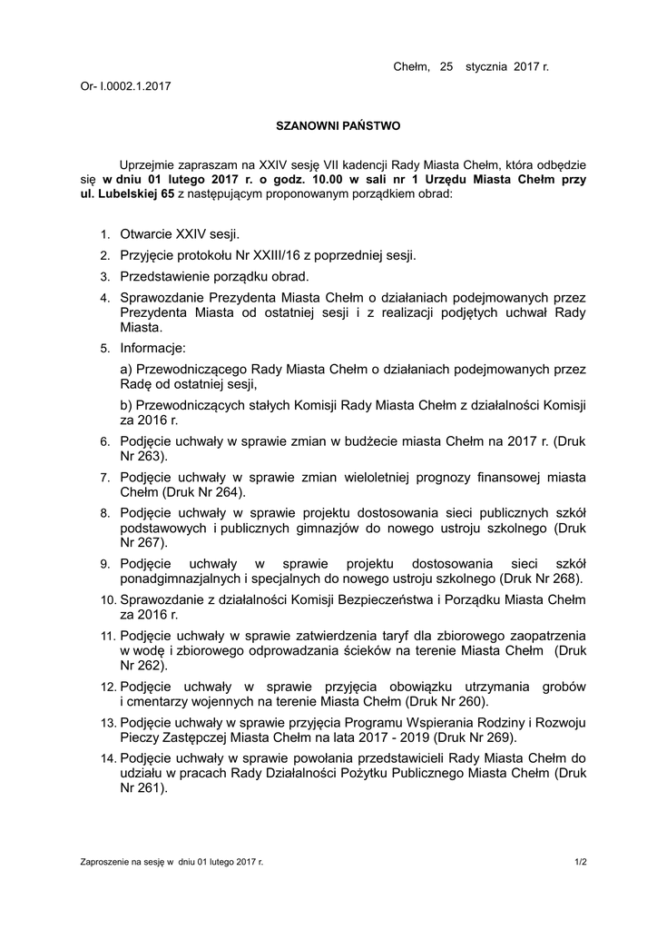 Chełm, 25 stycznia 2017 r. Or- I.0002.1.2017 SZANOWNI PAŃSTWO Uprzejmie zapraszam na XXIV sesję VII kadencji Rady Miasta Chełm, która odbędzie się w dniu 01 lutego 2017 r. o godz. 10.00 w sali nr 1 Urzędu Miasta Chełm przy ul. Lubelskiej 65 z następującym proponowanym porządkiem obrad: 1. Otwarcie XXIV sesji. 2. Przyjęcie protokołu Nr XXIII/16 z poprzedniej sesji. 3. Przedstawienie porządku obrad. 4. Sprawozdanie Prezydenta Miasta Chełm o działaniach podejmowanych przez Prezydenta Miasta od ostatniej sesji i z realizacji podjętych uchwał Rady Miasta. 5. Informacje: a) Przewodniczącego Rady Miasta Chełm o działaniach podejmowanych przez Radę od ostatniej sesji, b) Przewodniczących stałych Komisji Rady Miasta Chełm z działalności Komisji za 2016 r. 6. Podjęcie uchwały w sprawie zmian w budżecie miasta Chełm na 2017 r. (Druk Nr 263). 7. Podjęcie uchwały w sprawie zmian wieloletniej prognozy finansowej miasta Chełm (Druk Nr 264). 8. Podjęcie uchwały w sprawie projektu dostosowania sieci publicznych szkół podstawowych i publicznych gimnazjów do nowego ustroju szkolnego (Druk Nr 267). 9. Podjęcie uchwały w sprawie projektu dostosowania sieci szkół ponadgimnazjalnych i specjalnych do nowego ustroju szkolnego (Druk Nr 268). 10. Sprawozdanie z działalności Komisji Bezpieczeństwa i Porządku Miasta Chełm za 2016 r. 11. Podjęcie uchwały w sprawie zatwierdzenia taryf dla zbiorowego zaopatrzenia w wodę i zbiorowego odprowadzania ścieków na terenie Miasta Chełm (Druk Nr 262). 12. Podjęcie uchwały w sprawie przyjęcia obowiązku utrzymania grobów i cmentarzy wojennych na terenie Miasta Chełm (Druk Nr 260). 13. Podjęcie uchwały w sprawie przyjęcia Programu Wspierania Rodziny i Rozwoju Pieczy Zastępczej Miasta Chełm na lata 2017 - 2019 (Druk Nr 269). 14. Podjęcie uchwały w sprawie powołania przedstawicieli Rady Miasta Chełm do udziału w pracach Rady Działalności Pożytku Publicznego Miasta Chełm (Druk Nr 261). Zaproszenie na sesję w dniu 01 lutego 2017 r. 1/2 15. Podjęcie uchwały w sprawie powołania Rady Społecznej Miejskiego Samodzielnego Publicznego Zakładu Opieki Zdrowotnej w Chełmie (Druk Nr 265). 16. Podjęcie uchwały w sprawie uchwalenia ramowego planu pracy Rady Miasta Chełm na 2017 r.(Druk Nr 266). 17. Interpelacje i zapytania. 18. Udzielenie odpowiedzi na zgłoszone interpelacje i zapytania. 19. Zamknięcie obrad. Przewodniczący Rady Miasta Chełm /-/Zygmunt Gardziński Zaproszenie na sesję w dniu 01 lutego 2017 r. 2/2