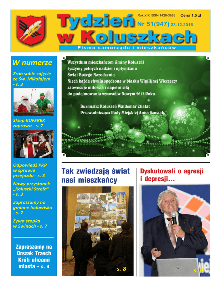 Rok XIX ISSN 1428-3883 Cena 1,5 zł Nr 51(947) 23.12.2016 W numerze Zrób sobie zdjęcie ze Św. Mikołajem - s. 3 Sklep KUFEREK zaprasza - s. 7 Odpowiedź PKP w sprawie przejazdu - s. 3 Nowy przystanek „Koluszki Strefa” - s. 3 Tak zwiedzają świat nasi mieszkańcy Dyskutowali o agresji i depresji… Zapraszamy na gminne lodowisko - s. 7 Żywa szopka w Świnach - s. 7 Zapraszamy na Orszak Trzech Króli ulicami miasta - s. 4 s. 8 s. 6 2 Tydzień w Koluszkach nr 51 Policja – 997, 44 714 69 77 Straż Pożarna – 998, 44 714 08 90 OSP Koluszki – 44 714 58 27 Pogotowie Ratunkowe – 999 URZĄD MIEJSKI Sekretariat – 44 725 67 00 Redakcja TwK – 44 725 67 18 USC – 44 725 67 60 Biblioteka Miejska – 44 714 58 38 MOK, Kino Odeon – 44 714 58 80 Wykaz opłat w 2016 roku Opłata za podatek od nieruchomości, rolny, leśny: - do 15 marca - I rata - do 15 maja - II rata - do 15 września - III rata - do 15 listopada - IV rata Opłata za podatek od środków transportowych: - do 15 lutego – I rata - do 15 września - II rata BIURO INŻYNIERA GMINY – 44 725 67 68 KPGK sp. z o.o. – 44 714 58 45 ZUK – 44 714 04 95 MGOPS – 44 714 58 25 Pogot. Energetyczne – 991 – 468-30-15-31 Pog. Kanalizacyjne – 44 714 58 79 507 078 873 Pogotowie Gazowe – 992 Ujęcie wody i pog. wod. – 44 714 58 24 605 370 020 Oczyszcz. ścieków – 44 714 58 79 507 078 873 Opłata za posiadanie zezwoleń na sprzedaż alkoholu: SŁUŻBA ZDROWIA NZOZ Zdrowie – 44 714 08 00 NZOZ Eskulap – 44 714 50 00 NZOZ Med-Kol (POZ) – 44 714 22 22 – 44 714 67 57 Med-Kol (poradnie specj.) – 44 714 55 00 Laboratorium Analityk – 44 714 57 57 Poradnia Stomatologiczno-Protetyczna ul. Staszica 34 – 44 714 44 98 Punkt Selektywnej Zbiórki Odpadów Komunalnych Apteki: ul. Żwirki 2 ul. Sikorskiego 6 ul. Głowackiego 20 ul. Korczaka 5 ul. 11 Listopada 33 ul. Przejazd 6 ul. 3 Maja 8 ul. 3 Maja 19G ul. Brzezińska 54 Gałków – 44 714 16 01 – 44 714 16 43 – 44 714 02 86 – 44 714 24 58 – 44 714 03 63 – 44 714 24 44 – 44 714 07 88 – 44 714 02 73 – 44 714 00 77 – 605 509 502 Taxi Biuro numerów Informacja PKP KSM Spółdz. Odlewnik Urząd Pracy – 44 714 58 42 – 118 913 – 19 757 – 44 714 10 41 – 44 714 19 98 – 44 714 13 54 Ośrodek Psychoedukacji i Psychoterapii ul. Staszica 34 – 44 714 67 67 wt. 13.00-20.00, czw. 15.00-19.30, pt. 14.00 – 20.00, sob. 8.30-11.00 Abstynenckie Stowarzyszenie Klub Wzajemnej Pomocy „Ostoja”, ul. Staszica 34 44 714-23-40 (pn-pt 17.00-20.00) Punkt Konsultacyjny Pomocy Rodzinie ul. Staszica 34 – 44 714-58-69 (pn.: 17.15-20.00 i śr. 17.15-20.30) Grupa AA „Iskierka”, Koluszki ul. Mickiewicza 40, 501 648 560 - do 30 września – III rata Opłata za wywóz odpadów komunalnych: - do 10 marca – I rata - do 10 maja - II rata - do 10 lipca - III rata - do 10 września - IV rata - do 10 listopada - V rata przy ulicy Reymonta w Koluszkach jest czynny w dniach: • wtorek w godz. 12.00 – 17.00 • czwartek w godz. 7.00 – 12.00 • sobota w godz. 10.00 – 15.00 Biuro Inżyniera Gminy przyjmuje zgłoszenia dotyczące: awarii sieci infrastruktury miejskiej (wodociągi, kanalizacja, ciepłownictwo, energetyka, gazociągi); l zimowego odśnieżania dróg; l uszkodzeń dróg i infrastruktury drogowej (znaki, przepusty); l uszkodzonych studzienek kanalizacyjnych; l nielegalnie prowadzonych robót w pasie drogowym; l uszkodzonych latarni oświetlenia ulicznego; l czystości w mieście i gminie; l przepełnień pojemników na odpady; l przepełnionych ulicznych koszy na śmieci; l zniszczeń i nieporządku wokół pojemników do selektywnej zbiórki odpadów; l zaśmiecenia terenów; l dzikich wysypisk śmieci; l padłych zwierząt; l inne związane z bieżącą obsługą mieszkań-ców w zakresie gospodarki komunalnej. l 44 725 67 68 telefon czynny 24h KOLUSZKI ZAWSZE W CENTRUM 23.12.2016 r. Działania Straży Pożarnej 14.12. w Koluszkach na boisku KKS strażacy zabezpieczali lądowisko dla helikoptera Lotniczego Pogotowia Ratunkowego. Załoga LPR została zadysponowana ze względu na brak wolnego Zespołu Ratownictwa Medycznego. Zastęp z JRG Koluszki dostarczył załogę LPR do miejsca zgłoszenia, a następnie wraz z osobą poszkodowaną został przetransportował do helikoptera. W działaniach udział brały trzy zastępy z JRG Koluszki. W nocy 17.12. w Koluszkach przy ul. Budowlanych doszło do pożaru trzech samochodów osobowych- Daewoo Nubira, Fiat Seicento, Kia Picanto. Na miejsce zdarzenia zadysponowane zostały dwa zastępy Gaśnicze z JRG Koluszki. Przypuszczalną przyczyną pożaru było podpalenie. 17.12. do Stanowiska Kierowania wpłynęło zgłoszenie o pożarze kontenera na śmieci. Strażacy podali jeden prąd wody na palące się śmieci. W działaniach udział brał jeden zastęp z JRG Koluszki. Kolejny numer gazety Tydzień w Koluszkach ukaże się 5 stycznia. 23.12. – ul. Sikorskiego 6A 24.12. – ul. 3 Maja 8 25.12. – ul. 3 Maja 19G 26.12. – ul. Brzezińska 54 27.12. – ul. Przejazd 6 28.12. – ul. 11 Listopada 33 29.12. – ul. Żwirki 2 30.12. – ul. Głowackiego 20 31.12. – ul. Korczaka 5 1.01. – ul. Sikorskiego 6A 2.01. – ul. 3 Maja 8 3.01. – ul. 3 Maja 19G 4.01. – ul. Brzezińska 54 Tydzień w Koluszkach nr 51 23.12.2016 r. Zrób sobie zdjęcie ze Św. Mikołajem 3 Odpowiedź kolei w sprawie przejazdu w Gałkowie Zgodnie z zapowiedzią elfa Antosia do naszego grodu w przeddzień świąt Bożego Narodzenia w wigilię 24.12. br. przybędzie swoją zaczarowaną bryczką św. Mikołaj. Czerwonemu brodatemu gościowi towarzyszyć będą wyznaczone przez Elfa Antosia, Mikołaje i śnieżynki. Wszystkie chętne dzieci wraz z rodzicami, zapraszamy na wtorkowy rynek w godz. 11.30-13.00, gdzie będzie można przejechać się bryczką, zrobić sobie pamiątkowe fotki, oraz otrzymać „świątecznego zaczarowanego cukierka”. Na parkingu spłonęły trzy samochody Przedstawiciele PKP Polskie Linie Kolejowe S.A. udzie