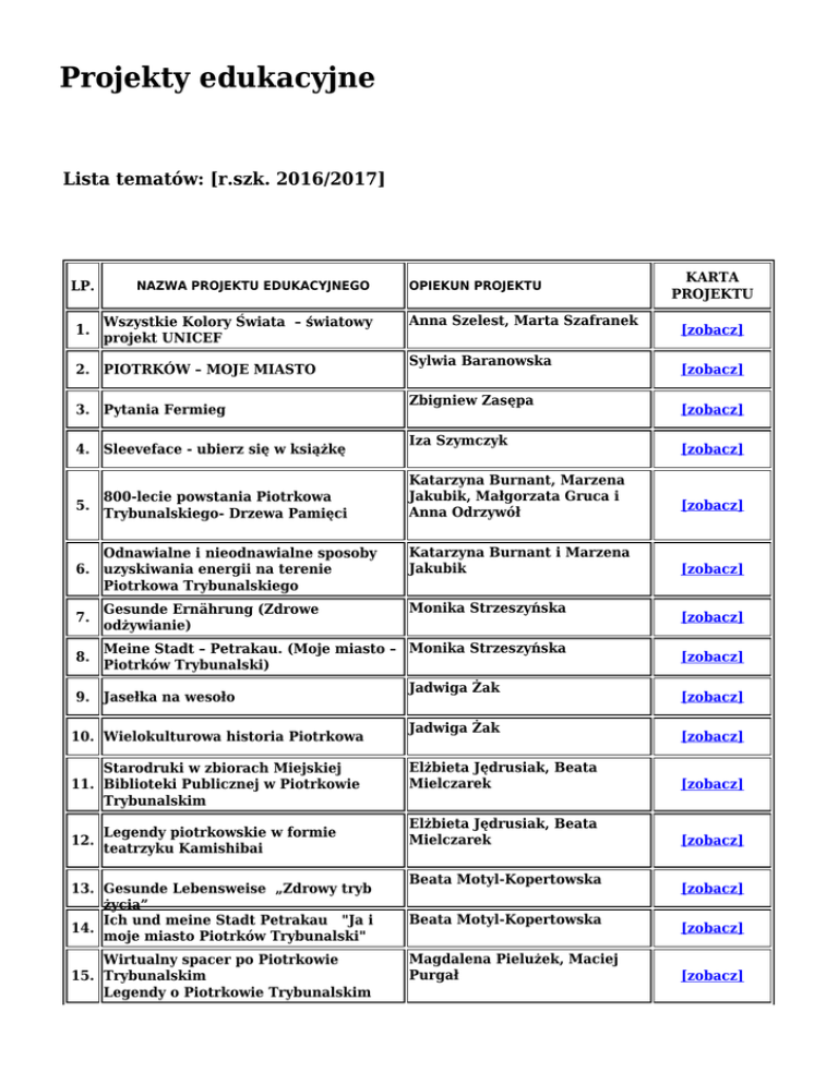 Projekty edukacyjne Lista tematów: [r.szk. 2016/2017] LP. 1. NAZWA PROJEKTU EDUKACYJNEGO Wszystkie Kolory Świata – światowy projekt UNICEF 2. PIOTRKÓW – MOJE MIASTO 3. Pytania Fermieg 4. Sleeveface - ubierz się w książkę 800-lecie powstania Piotrkowa 5. Trybunalskiego- Drzewa Pamięci Odnawialne i nieodnawialne sposoby 6. uzyskiwania energii na terenie Piotrkowa Trybunalskiego OPIEKUN PROJEKTU Anna Szelest, Marta Szafranek Sylwia Baranowska Zbigniew Zasępa Iza Szymczyk Katarzyna Burnant, Marzena Jakubik, Małgorzata Gruca i Anna Odrzywół Katarzyna Burnant i Marzena Jakubik Monika Strzeszyńska 7. Gesunde Ernährung (Zdrowe odżywianie) 8. Meine Stadt – Petrakau. (Moje miasto – Monika Strzeszyńska Piotrków Trybunalski) 9. Jasełka na wesoło 10. Wielokulturowa historia Piotrkowa Starodruki w zbiorach Miejskiej 11. Biblioteki Publicznej w Piotrkowie Trybunalskim Legendy piotrkowskie w formie 12. teatrzyku Kamishibai 13. Gesunde Lebensweise „Zdrowy tryb życia” Ich und meine Stadt Petrakau "Ja i 14. moje miasto Piotrków Trybunalski" Wirtualny spacer po Piotrkowie 15. Trybunalskim Legendy o Piotrkowie Trybunalskim Jadwiga Żak Jadwiga Żak KARTA PROJEKTU [zobacz] [zobacz] [zobacz] [zobacz] [zobacz] [zobacz] [zobacz] [zobacz] [zobacz] [zobacz] Elżbieta Jędrusiak, Beata Mielczarek [zobacz] Elżbieta Jędrusiak, Beata Mielczarek [zobacz] Beata Motyl-Kopertowska Beata Motyl-Kopertowska Magdalena Pielużek, Maciej Purgał [zobacz] [zobacz] [zobacz] LP. NAZWA PROJEKTU EDUKACYJNEGO OPIEKUN PROJEKTU Emilia Szadkowska, Julita PIOTRKÓW TRYBUNALSKI – MY HOME Kostrzewa, Anna Grzesik, 16. Aleksandra Rajkowska TOWN 17. Elektronika w służbie nauki i wiedzy-egzaminator elektroniczny 18. Spacer po Układzie Słonecznym 19. Thanksgiving in the USA. ( Święto Dziękczynienia w USA.) 20. Śladami Pitagorasa Leszek Barycki Danuta Burzyńska - Szmigiel Emilia Szadkowska, Julita Kostrzewa Agata Paul [ Zapoznaj się z REGULAMINEM PROJEKTU EDUKACYJNEGO ] [ Pobierz KARTĘ PROJEKTU EDUKACYJNEGO ] [ Pobierz KARTĘ PRACY ZESPOŁU ] [ Pobierz DEKLARACJĘ UCZESTNICTWA ] [ Pobierz DEKLARACJĘ RODZICÓW ] [ Pobierz KARTĘ OCENY PROJEKTU ] KARTA PROJEKTU [zobacz] [zobacz] [zobacz] [zobacz] [zobacz]