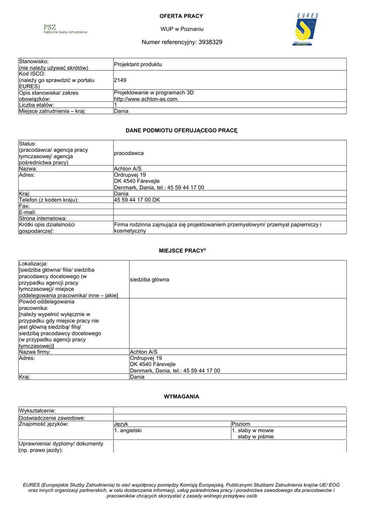 OFERTA PRACY WUP w Poznaniu Numer referencyjny: 3938329 Stanowisko: (nie należy używać skrótów) Kod ISCO: (należy go sprawdzić w portalu EURES) Opis stanowiska/ zakres obowiązków: Liczba etatów: Miejsce zatrudnienia – kraj: Projektant produktu 2149 Projektowanie w programach 3D http://www.achton-as.com. 1 Dania DANE PODMIOTU OFERUJĄCEGO PRACĘ Status: (pracodawca/ agencja pracy tymczasowej/ agencja pośrednictwa pracy) Nazwa: Adres: Kraj: Telefon (z kodem kraju): Fax: E-mail: Strona internetowa: Krótki opis działalności gospodarczeji: pracodawca Achton A/S Ordrupvej 19 DK 4540 Fårevejle Denmark, Dania, tel.: 45 59 44 17 00 Dania 45 59 44 17 00 DK Firma rodzinna zajmująca się projektowaniem przemysłowym/ przemysł papierniczy i kosmetyczny MIEJSCE PRACYii Lokalizacja: [siedziba główna/ filia/ siedziba pracodawcy docelowego (w przypadku agencji pracy tymczasowej)/ miejsce oddelegowania pracownika/ inne – jakie] Powód oddelegowania pracownika: [należy wypełnić wyłącznie w przypadku gdy miejsce pracy nie jest główną siedzibą/ filią/ siedzibą pracodawcy docelowego (w przypadku agencji pracy tymczasowej)] Nazwa firmy: Adres: Kraj: siedziba główna Achton A/S Ordrupvej 19 DK 4540 Fårevejle Denmark, Dania, tel.: 45 59 44 17 00 Dania WYMAGANIA Wykształcenie: Doświadczenie zawodowe: Znajomość języków: Język 1. angielski Poziom 1. słaby w mowie słaby w piśmie Uprawnienia/ dyplomy/ dokumenty (np. prawo jazdy): EURES (Europejskie Służby Zatrudnienia) to sieć współpracy pomiędzy Komisją Europejską, Publicznymi Służbami Zatrudnienia krajów UE/ EOG oraz innych organizacji partnerskich, w celu dostarczania informacji, usług pośrednictwa pracy i poradnictwa zawodowego dla pracodawców i pracowników chcących skorzystać z zasady wolnego przepływu osób Inne istotne wymagania: Doświadczenie w projektowaniu i konstruowaniu w 3D Znajomość programu SOLIDWORKS mile widziana Wymagane prawo jazdy kat. B Wymagana solidność i dokładność. WYNAGRODZENIE I WARUNKI ZATRUDNIENIA Wysokość pensji brutto: Wysokość pensji netto: Waluta, w jakiej wypłacana jest pensja: Rodzaj stawki wynagrodzenia: (godzinowa/ tygodniowa/ miesięczna/ roczna/ inna) Premie: Dodatkowe świadczenia (zakwaterowanie, wyżywienie, koszty związane ze zmianą miejsca zamieszkania, koszty podróży itp.): Nazwa firmy, z którą zostanie podpisana umowa: Rodzaj umowy: (umowa o pracę, umowa zlecenia, wolontariat, praktyka zawodowa/ staż, praca zdalna, agencja pracy tymczasowej, inne): Wymiar czasu pracy (praca na pełen etat/ część etatu): Czas trwania umowy: (nieokreślony/ określony) 3.500,00 Liczba godzin tygodniowo: Zmiany i praca w dni wolne: Data rozpoczęcia: Inne informacje: 37,00 Brak 2015-06-01 Brak Euro Czasowy ze stawką miesięczną Pracodawca pomoaga w znalezieniu zakwaterowania. Wynagrodzenie zależy od kwalifikacji i doświadczenia. Achton A/S umowa o pracę Praca stała nieokreślony Data wygaśnięcia umowy (w przypadku umowy na czas określony): SPOSÓB SKŁADANIA WNIOSKU Wymagane dokumenty (list motywacyjny, CV itp.): Język, w którym muszą być sporządzone przedkładane dokumenty: Do kogo należy wysłać dokumenty: (do pracodawcy/ doradcy EURES) Gdzie należy wysłać dokumenty: (adres, adres e-mail, nr faksu z kodem kraju itp.) Dane teleadresowe doradcy EURES lub przedstawiciela pracodawcy: (nazwisko, adres, telefon, fax, e-mail itp.) CV w języku angielskim angielski do doradcy EURES z WUP mailowo - w tytule maila proszę podać kraj oraz numer ref. EURES [email protected] DODATKOWE INFORMACJE Oferta ważna do 24.05.2015 WAŻNOŚĆ 2015-05-05 Data publikacji: Termin przedkładania podań o pracę / 2015-05-24 zakończenia ważności oferty: Uprzejmie informujemy, że skontaktujemy się wyłącznie z wybranymi kandydatami. UWAGA: 1. Umowa z zagranicznym pracodawcą jest zawierana, co do zasady, zgodnie z prawem kraju zatrudnienia. Oznacza to, że wszystkie roszczenia odnośnie warunków, które obejmuje umowa, można kierować wyłącznie do odpowiedniego sądu w kraju zatrudnienia. Publiczne służby zatrudnienia (EURES) nie mogą pośredniczyć ani reprezentować pracownika w sądzie kraju zatrudnienia w przypadku sporu z pracodawcą. EURES (Europejskie Służby Zatrudnienia) to sieć współpracy pomiędzy Komisją Europejską, Publicznymi Służbami Zatrudnienia krajów UE/ EOG oraz innych organizacji partnerskich, w celu dostarczania informacji, usług pośrednictwa pracy i poradnictwa zawodowego dla pracodawców i pracowników chcących skorzystać z zasady wolnego przepływu osób 2. Publiczne służby zatrudnienia (EURES) dokładają wszelkich starań, aby zapewnić rzetelność i wiarygodność ofert pracy zgłoszonych w lokalnym urzędzie pracy. Należy wyjaśnić, że oferta pracy została zgłoszona przez stronę trzecią i EURES nie odpowiada za ewentualne rozbieżności między warunkami pracy określonymi w ofercie pracy i warunkami oferowanymi przez potencjalnego pracodawcę. 3. Publiczne służby zatrudnienia (EURES) informują, że będą zbierać, przetwarzać i przekazywać potencjalnym pracodawcom zgodnie z przepisami dotyczącymi ochrony danych osobowych wszystkie dane osobowe dostarczone przez osoby poszukujące pracy. i Informacje o firmie, takie jak: status prawny, sektor, typ działalności, rodzaj produktów lub świadczonych usług, data rozpoczęcia działalności gospodarczej, liczba pracowników itp. ii Miejsce, w którym będzie wykonywana praca. Należy wypełnić w przypadku gdy: 1) miejsce wykonywania pracy jest inne niż siedziba podmiotu oferującego pracę, 2) pracę oferuje agencja pośrednictwa pracy/ agencja pracy tymczasowej. EURES (Europejskie Służby Zatrudnienia) to sieć współpracy pomiędzy Komisją Europejską, Publicznymi Służbami Zatrudnienia krajów UE/ EOG oraz innych organizacji partnerskich, w celu dostarczania informacji, usług pośrednictwa pracy i poradnictwa zawodowego dla pracodawc