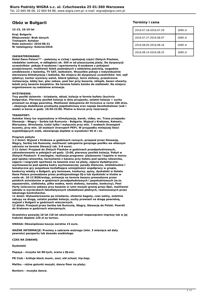 Biuro Podróży WIGRA s.c. ul. Człuchowska 25 01-360 Warszawa Tel. 22 665 06 06, 22 664 94 86, www.wigra.com.pl, e-mail: [email protected] Obóz w Bułgarii 12-15, 16-19 lat Kraj: Bułgaria Miejscowość: Brak danych Transport: Autokar Data ważności: 2016-08-31 Nr katalogowy: Kolonie/2016 Terminy i cena 2016.07.18-2016.07.29 1690 zł 2016.07.27-2016.08.07 1690 zł 2016.08.05-2016.08.16 1690 zł 2016.08.14-2016.08.25 1690 zł ZAKWATEROWANIE: Hotel Dana Palace*** - położony w cichej i spokojnej części Złotych Piasków, niedaleko centrum, w odległości ok. 500 m od piaszczystej plaży. Do dyspozycji uczestników- pokoje 4-osobowe i apartamenty 6-osobowe z pokojami przejściowymi, możliwość łóżek podwójnych z oddzielną pościelą, wygodnie umeblowane z łazienką, TV SAT, balkonem. Wszystkie pokoje z indywidualnie sterowaną klimatyzacją i lodówką. Na miejscu do dyspozycji uczestników- hol, sejf (płatny), kantor wymiany walut, bilard (płatny), tenis stołowy, przestronna restauracja, lobby bar, plac zabaw, pool bar przy basenie, sklepik, basen otwarty, leżaki przy basenie bezpłatne. Na terenie hotelu boisko do siatkówki. Na miejscu organizowane są codzienne animacje. WYŻYWIENIE: Trzy posiłki dziennie - śniadanie, obiad, kolacja w formie bufetu (kuchnia bułgarska). Pierwszy posiłek kolacja w dniu przyjazdu, ostatni kolacja + suchy prowiant na drogę powrotną. Możliwość dokupienia All Inclusive w cenie 100 zł/os. - obejmuje dodatkowo przekąskę popołudniową oraz napoje bezalkoholowe (sok i woda) w barze w godz. 10:30-22:00. Płatne w biurze przy rezerwacji. TRANSPORT: Autokar klasy lux wyposażony w klimatyzację, barek, video, wc. Trasa przejazduSłowacja – Węgry – Serbia lub Rumunia – Bułgaria. Wyjazd z Krakowa, Katowic, Warszawy, Wrocławia, Łodzi tylko i wyłącznie przy min. 7 osobach (transport busem), przy min. 10 osobach (transport PKP). W przypadku mniejszej ilości wyjeżdżających osób, obowiązuje dopłata w wysokości 50 zł / os. Program pobytu 1-2 dzień: Wyjazd z Krakowa w godzinach rannych, przejazd przez Słowację, Węgry, Serbię lub Rumunię, możliwość zakupienia gorącego posiłku we własnym zakresie na terenie Słowacji (ok. 5-8 euro). 2-11 dzień: Przyjazd do Złotych Piasków w godzinach przedpołudniowych, zakwaterowanie w pokojach od godz. 15:00, pierwszy posiłek kolacja. Pobyt w Złotych Piaskach- 9 noclegów, realizacja programu- plażowanie i kąpiele w morzu pod opieką ratownika, korzystanie z basenu przy hotelu pod opieką ratownika, zajęcia i rozgrywki sportowe na basenie oraz na plaży, zajęcia dydaktycznowychowawcze pod opieką kadry wychowawczej- parady kłamców, intelektualne i tematyczne gry zespołowe kształtujące umiejętności współpracy w grupie, konkursy wiedzy o Bułgarii, gry terenowe, konkursy, quizy, dyskoteki w Hotelu Dana Palace prowadzone przez profesjonalnego DJ-a lub dyskoteki w klubie w cenie ok. 10-12 BGN/wstęp, animacje na terenie basenu prowadzone przez polskich animatorów w godzinach przedpołudniowych i popołudniowych (m.in. aquaaerobic, siatkówka, piłka wodna, tenis stołowy, karaoke, konkursy), Pool Party (wieczorna zabawa przy basenie w rytm muzyki granej przez DJa), możliwość udziału w wycieczkach fakultatywnych (dodatkowo płatnych, realizowanych przez lokalnego kontrahenta). 11 dzień: Wykwaterowanie po śniadaniu, złożenie bagaży, czas wolny, ostatnie zakupy na drogę, ostatni posiłek kolacja, suchy prowiant na drogę powrotną, wyjazd z Bułgarii w godzinach wieczornych. 12 dzień: Przejazd przez Serbię lub Rumunię, Węgry, Słowację do Polski. Powrót do Krakowa w godzinach wieczornych. Uczestnicy powyżej 18 lat (18 lat ukończone przed rozpoczęciem imprezy lub w jej trakcie) dopłata 120 zł za turnus. UWAGA: Obowiązkowa kaucja zwrotna 15 euro. WAŻNE INFORMACJE: Prosimy o zabranie ważnego (min. 3 miesiące od daty powrotu) paszportu lub dowodu osobistego. CZAS NA ZABAWĘ: Dyskoteki Papaya – muzyka lat 80-tych, scena z DJ-em; PR Club – króluje black music, soul, old school, hip-hop; Malibu – różne gatunki muzyki, dance floor na plaży; Bonkers – muzyka dance. 1/2 Biuro Podróży WIGRA s.c. ul. Człuchowska 25 01-360 Warszawa Tel. 22 665 06 06, 22 664 94 86, www.wigra.com.pl, e-mail: [email protected] WYCIECZKI FAKULTATYNWE: Nesseber (z obiadem) – jego historyczna część została wpisana na listę światowego dziedzictwa kulturowego UNESCO. Wąskie uliczki miasta, pozostałości po murach obronnych z IV i V wieku, drewniane domki stanowią największą atrakcję turystyczną półwyspu. Cena ok. 27 euro + własne wydatki. Bałczyk i Półwysep Kaliakra – Bałczyk - malownicza nadmorska miejscowość, nazywana białym miastem ze względu na kolor kamienia z którego budowano domy. Największą atrakcją jest ogród botaniczny z dawną letnią rezydencją rumuńskiej królowej Marii. Kaliakra, skalisty półwysep wychodzący daleko w morze, malowniczy rezerwat przyrody i dawna twierdza. Cena ok. 20 euro, z obiadem ok. 28 euro + własne wydatki. Istambuł (1 dzień z obiadem) – największe miasto Turcji, przedzielone cieśniną Bosfor na dwie części- europejską oraz azjatycką. W programie zwiedzanie m.in. Błękitnego Meczetu oraz Hipodromu. Obiad. Odjazd autokarem ze Złotych Piasków wieczorem, nocny przejazd do Istambułu. Wyjazd w drogę powrotną w późnych godzinach wieczornych. Obowiązkowo paszport. Cena ok. 70 euro + 25 euro wiza turecka (fakultatywnie- rejs statkiem po Bosforze ok. 25 euro, zwiedzanie Hagii Sophii 28 euro, zwiedzanie pałacu sułtańskiego Topkapi 27 euro) + własne wydatki. Aquapolis – park wodny z licznymi zjeżdżalniami i basenami. Cena ok. 18 euro + własne wydatki. Warna z Delfinarium – trzecie co do wielkości miasto Bułgarii z rzymskimi ruinami, bizantyjskimi fortyfikacjami oraz zabytkami architektury tureckiej. Wizyta w Delfinarium połączona z akrobatycznym pokazem delfinów. Cena o