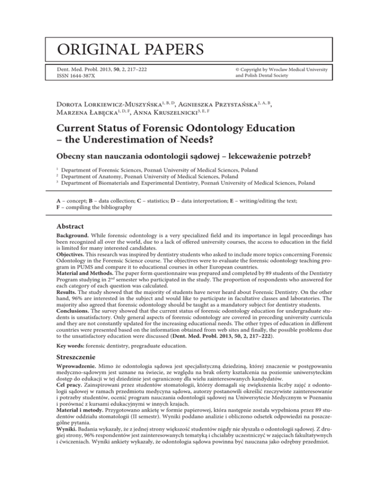 Original papers Dent. Med. Probl. 2013, 50, 2, 217–222 ISSN 1644-387X © Copyright by Wroclaw Medical University and Polish Dental Society Dorota Lorkiewicz-Muszyńska1, B, D, Agnieszka Przystańska2, A, B, Marzena Łabęcka1, D, F, Anna Kruszelnicki3, E, F Current Status of Forensic Odontology Education – the Underestimation of Needs? Obecny stan nauczania odontologii sądowej – lekceważenie potrzeb? Department of Forensic Sciences, Poznań University of Medical Sciences, Poland Department of Anatomy, Poznań University of Medical Sciences, Poland 3 Department of Biomaterials and Experimental Dentistry, Poznań University of Medical Sciences, Poland 1 2 A – concept; B – data collection; C – statistics; D – data interpretation; E – writing/editing the text; F – compiling the bibliography Abstract Background. While forensic odontology is a very specialized field and its importance in legal proceedings has been recognized all over the world, due to a lack of offered university courses, the access to education in the field is limited for many interested candidates. Objectives. This research was inspired by dentistry students who asked to include more topics concerning Forensic Odontology in the Forensic Science course. The objectives were to evaluate the forensic odontology teaching program in PUMS and compare it to educational courses in other European countries. Material and Methods. The paper form questionnaire was prepared and completed by 89 students of the Dentistry Program studying in 2nd semester who participated in the study. The proportion of respondents who answered for each category of each question was calculated. Results. The study showed that the majority of students have never heard about Forensic Dentistry. On the other hand, 96% are interested in the subject and would like to participate in facultative classes and laboratories. The majority also agreed that forensic odontology should be taught as a mandatory subject for dentistry students. Conclusions. The survey showed that the current status of forensic odontology education for undergraduate students is unsatisfactory. Only general aspects of forensic odontology are covered in preceding university curricula and they are not constantly updated for the increasing educational needs. The other types of education in different countries were presented based on the information obtained from web sites and finally, the possible problems due to the unsatisfactory education were discussed (Dent. Med. Probl. 2013, 50, 2, 217–222). Key words: forensic dentistry, pregraduate education. Streszczenie Wprowadzenie. Mimo że odontologia sądowa jest specjalistyczną dziedziną, której znaczenie w postępowaniu medyczno-sądowym jest uznane na świecie, ze względu na brak oferty kształcenia na poziomie uniwersyteckim dostęp do edukacji w tej dziedzinie jest ograniczony dla wielu zainteresowanych kandydatów. Cel pracy. Zainspirowani przez studentów stomatologii, którzy domagali się zwiększenia liczby zajęć z odontologii sądowej w ramach przedmiotu medycyna sądowa, autorzy postanowili określić rzeczywiste zainteresowanie i potrzeby studentów, ocenić program nauczania odontologii sądowej na Uniwersytecie Medycznym w Poznaniu i porównać z kursami edukacyjnymi w innych krajach. Materiał i metody. Przygotowano ankietę w formie papierowej, która następnie została wypełniona przez 89 studentów oddziału stomatologii (II semestr). Wyniki poddano analizie i obliczono odsetek odpowiedzi na poszczególne pytania. Wyniki. Badania wykazały, że z jednej strony większość studentów nigdy nie słyszała o odontologii sądowej. Z drugiej strony, 96% respondentów jest zainteresowanych tematyką i chciałaby uczestniczyć w zajęciach fakultatywnych i ćwiczeniach. Wyniki ankiety wykazały, że odontologia sądowa powinna być nauczana jako odrębny przedmiot. 218 D. Lorkiewicz-Muszyńska et al. Wnioski. Analiza programu nauczania wykazała, że obecny stan edukacji studentów w tej dziedzinie jest niezadowalający. Programy nauczania obejmują jedynie ogólne aspekty odontologii sądowej i nie odpowiadają obecnym, rosnącym potrzebom edukacyjnym. Przedstawiono również rozwiązania stosowane w edukacji odontologii sądowej w innych państwach oraz wskazano możliwości rozszerzenia oferty edukacyjnej (Dent. Med. Probl. 2013, 50, 2, 217–222). Key words: odontologia sądowa, nauczanie przeddyplomowe. Odontology per se deals with the scientific and practical investigation of teeth, their structure, development and function. Its incorporation into forensic medicine includes the examination and evaluation of dental evidence for its presentation in the interest of justice. The most common role of the forensic odontologist is the identification of deceased individuals and human remains based on the recognition of the unique features present in dental structures. The work of a forensic odontologist also includes assisting at the scene of mass disasters, age estimations and bite marks analysis. The forensic odontologist is usually a member of the investigating team [1], the composition of which varies, depending on the nature of the case. During any disaster, the role of the forensic odontologist in victim identification is the confirmation of the identity of a deceased person by matching post mortem data with ante-mortem dental records of the missing person. This process is simple in concept, but it is complex in execution and requires the skills and expertise of fully trained forensic odontologists [2]. The skills held by experienced specialists place them in a unique position within the investigation team. The odontologists have general medical and anthropological knowledge in the recognition of body parts, as well as specialized dental anatomical skills. Their ability to recognize omission or misinterpretation of information in any of the phases of the process will ensure that errors are not compounded [3]