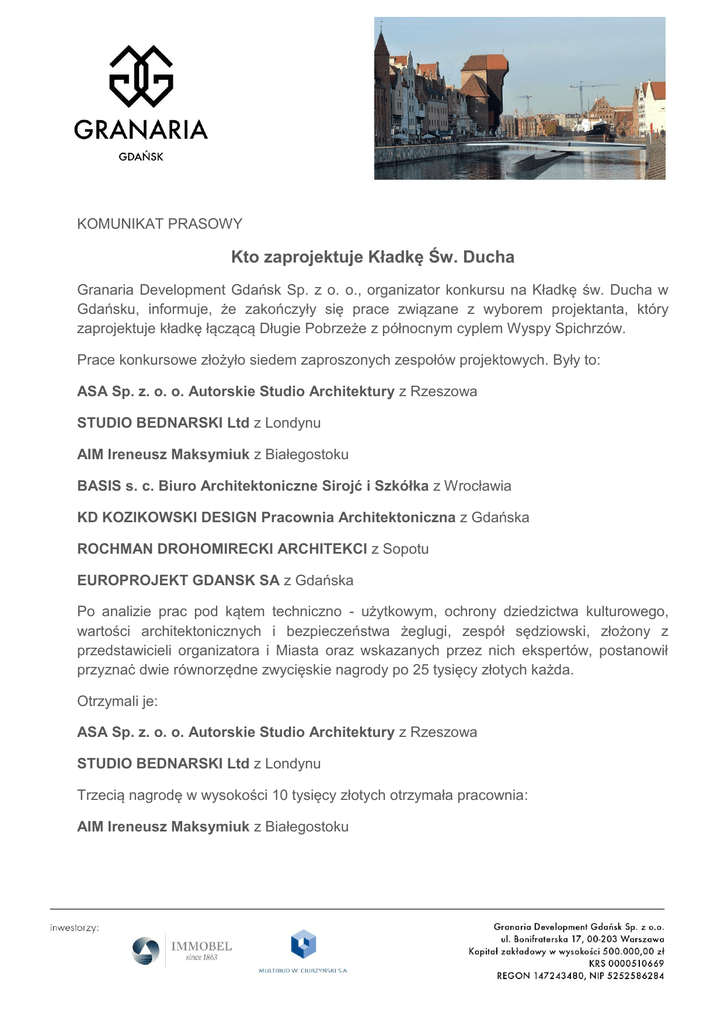 KOMUNIKAT PRASOWY Kto zaprojektuje Kładkę Św. Ducha Granaria Development Gdańsk Sp. z o. o., organizator konkursu na Kładkę św. Ducha w Gdańsku, informuje, że zakończyły się prace związane z wyborem projektanta, który zaprojektuje kładkę łączącą Długie Pobrzeże z północnym cyplem Wyspy Spichrzów. Prace konkursowe złożyło siedem zaproszonych zespołów projektowych. Były to: ASA Sp. z. o. o. Autorskie Studio Architektury z Rzeszowa STUDIO BEDNARSKI Ltd z Londynu AIM Ireneusz Maksymiuk z Białegostoku BASIS s. c. Biuro Architektoniczne Sirojć i Szkółka z Wrocławia KD KOZIKOWSKI DESIGN Pracownia Architektoniczna z Gdańska ROCHMAN DROHOMIRECKI ARCHITEKCI z Sopotu EUROPROJEKT GDANSK SA z Gdańska Po analizie prac pod kątem techniczno - użytkowym, ochrony dziedzictwa kulturowego, wartości architektonicznych i bezpieczeństwa żeglugi, zespół sędziowski, złożony z przedstawicieli organizatora i Miasta oraz wskazanych przez nich ekspertów, postanowił przyznać dwie równorzędne zwycięskie nagrody po 25 tysięcy złotych każda. Otrzymali je: ASA Sp. z. o. o. Autorskie Studio Architektury z Rzeszowa STUDIO BEDNARSKI Ltd z Londynu Trzecią nagrodę w wysokości 10 tysięcy złotych otrzymała pracownia: AIM Ireneusz Maksymiuk z Białegostoku W ostatnich dniach grudnia 2015 r. konsorcjum Immobel & Multibud wraz z przedstawicielami Miasta, wszechstronnie analizując wyniki konkursu, wybrało projekt autorstwa Studio Bednarski Ltd. z Londynu. Rozstrzygnięcie to otwiera drogę do realizacji jednego z celów publicznych w ramach partnerstwa publiczno - prywatnego, zawiązanego między Miastem Gdańsk, a konsorcjum Immobel & Multibud, powołanego do zagospodarowania północnego cypla Wyspy Spichrzów. W skład sądu konkursowego wchodzili: 1. Wiesław Bielawski - Zastępca Prezydenta Miasta Gdańska ds. polityki przestrzennej 2. Dariusz Chmielewski - Pomorski Wojewódzki Konserwator Zabytków 3. Bartłomiej Hofman - Prezes Zarządu Immobel Poland 4. Wojciech Ciurzyński - Prezes Zarządu Multibud 5. Andrzej Duch - Dyrektor Wydziału Urbanistyki i Architektury UMG 6. prof. Marcin Gawlicki - Instytut Architektury Krajobrazu, KUL 7. Wojciech Grabianowski - RKW Rhode Kellermann Wawrowsky 8. Jacek Kosmólski - Urząd Morski w Gdyni 9. Jacek Skrzyński - Dyrektor Techniczny Multibud 10. Bartłomiej Polnik - Kierownik projektu Immobel Poland 11. prof. Antoni Taraszkiewicz - dziekan Wydziału Architektury Politechniki Gdańskiej 12. prof. Edmund Wittbrodt - Politechnika Gdańska Zakończenie całości prac związanych z Kładką Św. Ducha nastąpi w 2019 r. * * * IMMOBEL od ponad 150 lat jest jednym z ważniejszych graczy na rynku deweloperskim w Belgii. Aktywnie działa także w Wielkim Księstwie Luksemburga. Obecnie rozwija działalność w Polsce. Realizuje projekty biurowe oraz mieszkaniowe. IMMOBEL jest notowany na Euronext w Brukseli. W portfolio Spółki znajdują się obecnie m. in. tak znane projekty jak: warszawski CEDET, CBD One, a także tereny inwestycyjne pod zabudowę mieszkaniowa oraz biurową, zlokalizowane w Warszawie i w Gdańsku. MULTIBUD jest grupą firm w branży usług inwestycyjno - budowlanych od kilkunastu lat. Zaangażowany jest kapitałowo w projekty deweloperskie realizowane z partnerami w Warszawie: we Włochach, na Ochocie, Mokotowie oraz Żoliborzu. Łączna wartość tych projektów przekracza 50 mln PLN. Grupa dysponuje portfelem znacznych projektów deweloperskich pozyskanych do realizacji w silnych konfiguracjach partnerskich oraz w interesujących lokalizacjach w Polsce. Więcej informacji: Jan Kurbiel: [email protected] Tel: 606 666 400 Anna Fijałkowska: [email protected] Tel: 605 110 463