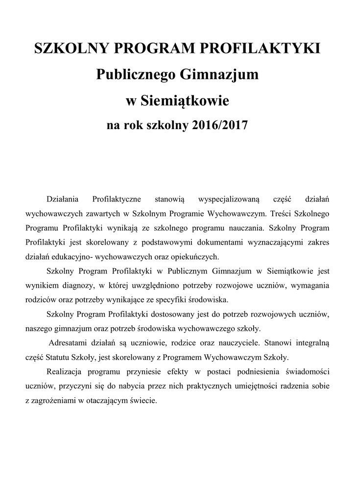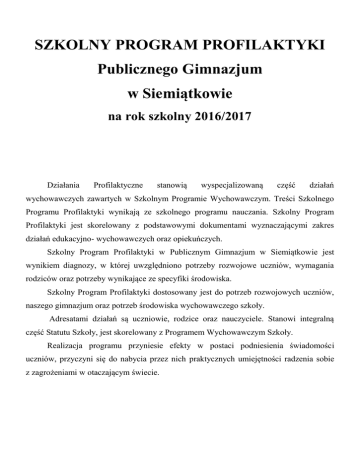 SZKOLNY PROGRAM PROFILAKTYKI Publicznego Gimnazjum w Siemiątkowie na rok szkolny 2016/2017 Działania Profilaktyczne stanowią wyspecjalizowaną część działań wychowawczych zawartych w Szkolnym Programie Wychowawczym. Treści Szkolnego Programu Profilaktyki wynikają ze szkolnego programu nauczania. Szkolny Program Profilaktyki jest skorelowany z podstawowymi dokumentami wyznaczającymi zakres działań edukacyjno- wychowawczych oraz opiekuńczych. Szkolny Program Profilaktyki w Publicznym Gimnazjum w Siemiątkowie jest wynikiem diagnozy, w której uwzględniono potrzeby rozwojowe uczniów, wymagania rodziców oraz potrzeby wynikające ze specyfiki środowiska. Szkolny Program Profilaktyki dostosowany jest do potrzeb rozwojowych uczniów, naszego gimnazjum oraz potrzeb środowiska wychowawczego szkoły. Adresatami działań są uczniowie, rodzice oraz nauczyciele. Stanowi integralną część Statutu Szkoły, jest skorelowany z Programem Wychowawczym Szkoły. Realizacja programu przyniesie efekty w postaci podniesienia świadomości uczniów, przyczyni się do nabycia przez nich praktycznych umiejętności radzenia sobie z zagrożeniami w otaczającym świecie. Szkolny Program Profilaktyki uwzględnia potrzeby: KADRY SZKOŁY podnoszenie kwalifikacji zawodowych pracowników, dbanie o prawidłowy obieg informacji, planowanie i sprawna organizacja, czuwanie nad spójnością oddziaływań profilaktycznych i wychowawczych wszystkich pracowników, poznawanie aktualnych przepisów prawnych dotyczących odpowiedzialności nieletnich za czyny karalne. RODZICÓW udział w realizacji programu, pedagogizacja, dążenie do wspólnych celów, wspólne realizowanie zadań. WYCHOWAWCÓW integracja zespołu klasowego, dbałość o poczucie bezpieczeństwa i akceptacji ucznia w klasie, współpraca z rodzicami, wyposażenie uczniów w umiejętności radzenia sobie w trudnych sytuacjach. UCZNIÓW bezpieczeństwa i akceptacji, wykształcenia umiejętności i zachowań umożliwiających zdrowy tryb życia, dostarczenia podstawowych wiadomości o substancjach uzależniających, nabycia umiejętności funkcjonowania w grupie oraz aktywnego spędzania czasu wolnego. ŚRODOWISKA LOKALNEGO diagnozowanie potrzeb, pomoc w oddziaływaniach profilaktycznych i wychowawczych. . DZIAŁ I. PODSTAWY PRAWNE PROGRAMU PROFILAKTYKI W SZKOLE Szkoły i placówki opiekuńczo – wychowawcze, wspierając rozwój dzieci i młodzieży, mają za zadanie ochronę zdrowia i stworzenie warunków do zdobycia wiedzy i umiejętności służących do przeciwdziałania wszystkiemu, co zagraża zdrowiu i bezpieczeństwu. Podstawy prawne do włączenia zagadnień profilaktyki w wychowanie dają szkołom również następujące rozporządzenia i ustawy: 1. Konstytucja Rzeczpospolitej Polskiej. 2. Konwencja o prawach dziecka uchwalona przez Zgromadzenie Ogólne Narodów Zjednoczonych z 20 listopada 1989r. ratyfikowana przez Polskę 30 kwietnia 1991r. Art. 27.1 „Państwa – strony uznają prawo każdego dziecka do poziomu życia odpowiadającego jego rozwojowi fizycznemu, psychicznemu, duchowemu, moralnemu i społecznemu”. 3. Ustawa z dnia 26 października 1982 r. o wychowaniu w trzeźwości i przeciwdziałaniu alkoholizmowi. 4. Ustawa o postępowaniu w sprawach nieletnich (tekst jednolity) z dnia 26 października 1982r. 5. Ustawa z dnia 7 września 1991 r. o systemie oświaty. 6. Ustawa o ochronie zdrowia psychicznego z dnia 19 sierpnia 1994 r. podaje w rozdziale 1, art.1.1: „ochronę zdrowia psychicznego zapewniają organy administracji rządowej i samorządowej oraz instytucje do tego powołane”. 7. Ustawa z dnia 9 listopada 1995r o ochronie zdrowia przed następstwami używania tytoniu i wyrobów tytoniowych. 8. Ustawa z dnia 24 kwietnia 1997 r. o przeciwdziałaniu narkomanii. 9. Ustawa z dnia 29 lipca 2005 r. o przeciwdziałaniu przemocy w szkole. 10. .Ustawa z 29 lipca 2005 r. o przeciwdziałaniu przemocy w rodzinie. 11. Rozporządzenie MENiS z 31 stycznia 2002 r. – wprowadza zapis o podejmowaniu przez rady pedagogiczne uchwał o wprowadzeniu programu profilaktyki spójnego z programem wychowawczym. 12. .Rozporządzenie Ministra Edukacji Narodowej i Sportu z dnia 7 stycznia 2003r. w sprawie zasad udzielania i organizacji pomocy psychologiczno- pedagogicznej w publicznych przedszkolach, szkołach i placówkach (Dz.U.03.11.114 z dnia 2003.01.29 z póż. zm.). 13. Rozporządzenie Ministra Zdrowia z dnia 25 czerwca 2003 r. w sprawie zakresu i organizacji profilaktycznej opieki zdrowotnej nad dziećmi i młodzieżą. 14. .Rozporządzenie MEN z 23 grudnia 2008 r. w sprawie podstawy programowej wychowania przedszkolnego oraz kształcenia ogólnego w poszczególnych typach szkół. 15. Rozporządzenie MEN z dnia 17 listopada 2010 r. w sprawie zasad udzielania i organizacji pomocy psychologiczno- pedagogicznej w publicznych przedszkolach, szkołach i placówkach. 16. Rozporządzenie Rady Ministrów z dnia 13.09.2011 r. w sprawie przeciwdziałania przemocy w rodzinie. 17. Rozporządzenie MEN z dnia 18 sierpnia 2015 r. w sprawie zakresu i form prowadzenia w szkołach i placówkach systemu oświaty działalności wychowawczej, edukacyjnej, informacyjnej i profilaktycznej w celu przeciwdziałania narkomanii (Dz. U. poz. 1249). 18. Ustawa z dnia 28 listopada 2014 roku o zmianie ustawy o bezpieczeństwie żywności i żywienia (Dz. U. z 2015 r. poz.35). 19. Statut Zespołu Szkół w Siemiątkowie. Wewnątrzszkolny System Oceniania. 20. Program Wychowawczy Publicznego Gimnazjum w Siemiątkowie DZIAŁ II. PROFILAKTYKA W SZKOLE – ZAGADNIENIA OGÓLNE Profilaktyka służy: likwidacji przyczyn niekorzystnych zjawisk (eliminowanie czynników ryzyka i przeciwdziałanie im), promowaniu zdrowia, rozwijaniu potencjalnych możliwości uczniów. Program profilaktyki: realizuje tylko profilaktykę pierwszorzędową i drugorzędową, uzupełnia program wychowawczy szkoły, odpowiada na realne problemy oraz zagrożenia pojawiające się w szkole i w 