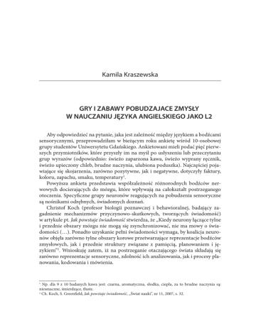 Kamila Kraszewska GRY I ZABAWY POBUDZAJACE ZMYSŁY W NAUCZANIU JĘZYKA ANGIELSKIEGO JAKO L2 Aby odpowiedzieć na pytanie, jaka jest zależność między językiem a bodźcami sensorycznymi, przeprowadziłam w bieżącym roku ankietę wśród 10-osobowej grupy studentów Uniwersytetu Gdańskiego. Ankietowani mieli podać pięć pierwszych przymiotników, które przyszły im na myśl po usłyszeniu lub przeczytaniu grup wyrazów (odpowiednio: świeżo zaparzona kawa, świeżo wyprany ręcznik, świeżo upieczony chleb, brudne naczynia, ulubiona poduszka). Najczęściej pojawiające się skojarzenia, zarówno pozytywne, jak i negatywne, dotyczyły faktury, koloru, zapachu, smaku, temperatury1. Powyższa ankieta przedstawia współzależność różnorodnych bodźców nerwowych docierających do mózgu, które wpływają na całokształt postrzeganego otoczenia. Specyficzne grupy neuronów reagujących na pobudzenia sensoryczne są nośnikami odrębnych, świadomych doznań. Christof Koch (profesor biologii poznawczej i behawioralnej, badający zagadnienie mechanizmów przyczynowo-skutkowych, tworzących świadomość) w artykule pt. Jak powstaje świadomość stwierdza, że „Kiedy neurony łączące tylne i przednie obszary mózgu nie mogą się zsynchronizować, nie ma mowy o świadomości (…). Ponadto uzyskanie pełni świadomości wymaga, by koalicja neuronów objęła zarówno tylne obszary korowe przetwarzające reprezentacje bodźców zmysłowych, jak i przednie struktury związane z pamięcią, planowaniem i językiem”2. Wnioskuję zatem, iż na postrzeganie otaczającego świata składają się zarówno reprezentacje sensoryczne, zdolność ich analizowania, jak i procesy planowania, kodowania i mówienia. 1 Np. dla 9 z 10 badanych kawa jest: czarna, aromatyczna, słodka, ciepła, za to brudne naczynia są: niesmaczne, śmierdzące, tłuste. 2 Ch. Koch, S. Greenfield, Jak powstaje świadomość, „Świat nauki”, nr 11, 2007, s. 32. 74 Kamila Kraszewska Jeden przedmiot może być reprezentowany na wiele sposobów – jako obraz wzrokowy, jako zespół wyrazów i związanych z nimi dźwięków, a nawet wrażenie dotykowe lub zapachowe3 Skrajnym przypadkiem takiej silnej korelacji pomiędzy neuroprzekaźnikami odpowiedzialnymi za odbieranie i przetwarzanie informacji z receptorów zmysłów jest zjawisko synestezji, kiedy to osoba postrzegająca dany przedmiot jest w stanie jednocześnie słyszeć go, widzieć oraz czuć jego smak4. Tym oto sposobem synestetycy słyszą liczbę pięć lub czują smak koloru czerwonego, co jest bardzo bliskie dziecięcemu sposobowi odbierania świata. Różnica polega na tym, że dzieci myślą w taki sposób, jak synestetycy czują. Jednym z nurtujących pytań w procesie poznawczym dziecka bywa „ciekawe, jak smakuje czerwony trójkąt?”. I jeśli nic nie stanie na przeszkodzie, czerwony trójkąt wędruje do ust malca. Jest to dowodem na to, że podczas odkrywania świata w dzieciństwie ważną rolę odgrywa łączenie zmysłów. Informacja o tym że trójkąt jest czerwony, nie zaspokaja ciekawości dziecka, nie daje mu pełnych danych na temat oglądanego przedmiotu. Anthony Marshon, badacz z New York University, sugeruje, iż „można postrzegać układ sensoryczny w kontekście małego naukowca, który generuje hipotezy na temat otaczającego świata. Skąd dochodzi głos, jakiego koloru jest dany przedmiot – to pytania, na które mózg znajduje odpowiedzi korzystając z impulsów, które bezpośrednio do niego docierają oraz wcześniej ukształtowanych schematów” [często zakodowanych w genach i dziedziczonych – przyp. K.K.]5. Przykładem ujawniającym istnienie takich wzorców w mózgu są iluzje optyczne. Ludzki mózg, próbując zapobiec błędnemu odczytaniu docierającej do niego informacji wzrokowej, uzupełnia brakujące elementy odbieranego obrazu za pomocą schematów zakodowanych w przeszłości. F. Crick, Ch. Koch, Problem Świadomości, „Świat Nauki”, wyd. specjalne, Warszawa 2003, s. 12. S. Ramachandran, M. Hubbard, Brzmienie barw, smak kształtów, „Świat Nauki”, wyd. specjalne, 2007, s. 81. 5 H. Huges, Seeing, heating and smelling the Word – New findings help scientists make sens of our senses, Medical Institute’s Report, 1995, s. 5. 3 4 Gry i zabawy pobudzające zmysły ... 75 Proces ten jest nieświadomy i automatyczny. Wystarczy spojrzeć na trójkąt Gaetano Kamizsa, aby podświadomie dostrzec biały trójkąt, który znika wraz z usunięciem czarnych kształtów z obrazu. Dzieje się tak dlatego, że mózg automatycznie wypełnia brakujące linie, odtwarzając pełny obraz wcześniej widziany i zakodowany6. Natomiast Vilayanur S. Ramachandran i Edward M. Hubbard od kilku lat wspólnie prowadzą badania nad zjawiskiem synestezji i zależności zachodzącej między zmysłami a świadomością. Twierdzą oni, że gdybyśmy zapytali, która z przedstawionych powyżej figur to „Buba”, a która „Kiki”, 98% osób skojarzyłoby lewy kształt z pierwszym z tych słów7. Aby przekonać się o tym osobiście, poprosiłam dziesięcioro uprzednio ankietowanych studentów UG, aby narysowali figury przedstawiające „Bubę” oraz „Kiki”. Stworzone obrazki niewiele różniły się od tych zaprezentowanych powyżej. Prawdopodobnie dzieje się tak dlatego, że zdolność mózgu do wyodrębniania wspólnej abstrakcyjnej cechy – w tym przypadku tego, co łączy postrzępiony kształt i twardo brzmiące słowo – mogła utorować drogę do powstania umiejętności posługiwania się przenośnią, a być może również wspólnego słownictwa8. Nie jest jednak tak, że bezustannie odbieramy wszelkie impulsy sensoryczne i reagujemy na nie. We wszystkich zmysłach, łącznie z dotykiem, zachodzi zjawisko adaptacji. Np. tuż po założeniu butów na nogi czujemy je, ale już po chwili to czucie znika. Możemy je odzyskać, gdy poruszamy palcami u nóg9. Statyczne obiekty znikają z pola widzenia i 