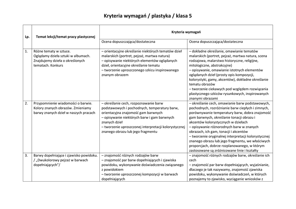 Kryteria wymagań / plastyka / klasa 5 Kryteria wymagań Lp. Temat lekcji/temat pracy plastycznej Ocena dopuszczająca/dostateczna Ocena dopuszczająca/dostateczna – dokładne określanie, omawianie tematów malarskich (portret, pejzaż, martwa natura, scena rodzajowa, malarstwo historyczne, religijne, mitologiczne, abstrakcyjne) – opisywanie, omawianie istotnych elementów oglądanych dzieł (prosty opis kompozycji, kolorystyki, gamy, akcentów), dokładne określanie tematu obrazów – tworzenie ciekawych pod względem rozwiązania plastycznego szkiców rysunkowych, inspirowanych znanymi obrazami – określanie cech, omawianie barw podstawowych, pochodnych, rozróżnianie barw ciepłych i zimnych, porównywanie temperatury barw, dobra znajomość gam barwnych, określanie tonacji obrazu i akcentów kolorystycznych w dziełach – opisywanie różnorodnych barw w znanych obrazach, ich gam, tonacji i akcentów – tworzenie oryginalnej interpretacji kolorystycznej znanego obrazu lub jego fragmentu, we właściwych proporcjach, dobrze rozplanowanego, w którym zastosowane są zróżnicowane linie i kształty – znajomość różnych rodzajów barw, określanie ich cech – znajomość par barw dopełniających, wyjaśnianie, dlaczego je tak nazywamy, znajomość zjawiska powidoku, wykonywanie doświadczeń, w których poznajemy to zjawisko, wyciąganie wniosków z 1. Różne tematy w sztuce. Oglądamy dzieła sztuki w albumach. Znajdujemy dzieła o określonych tematach. Konkurs – orientacyjne określanie niektórych tematów dzieł malarskich (portret, pejzaż, martwa natura) – opisywanie niektórych elementów oglądanych dzieł, orientacyjne określanie tematu – tworzenie uproszczonego szkicu inspirowanego znanym obrazem 2. Przypomnienie wiadomości o barwie. Kolory znanych obrazów. Zmieniamy barwy znanych dzieł w naszych pracach – określanie cech, rozpoznawanie barw podstawowych i pochodnych, temperatury barw, orientacyjna znajomość gam barwnych – opisywanie niektórych barw i gam barwnych znanych dzieł – tworzenie uproszczonej interpretacji kolorystycznej znanego obrazu lub jego fragmentu 3. Barwy dopełniające i zjawisko powidoku. – znajomość różnych rodzajów barw / „Dwukolorowy pejzaż w barwach – znajomość par barw dopełniających i zjawiska dopełniających”/ powidoku, wykonywanie doświadczenia związanego z powidokiem – tworzenie uproszczonej kompozycji w barwach dopełniających 4. Barwy czyste i złamane. / „Motyl na ziemi”, „Motyl na skałach” – znajomość modelu koła barw, rozróżnianie barw czystych i złamanych, określanie sposobu tworzenia ich poprzez mieszanie – wyodrębnianie niektórych rodzajów barw w wybranych obrazach – tworzenie prostej kompozycji, w której zastosowane są barwy czyste i złamane – wykorzystywanie techniki kolażu w pracy plastycznej 5. Zimne grzeje, a gorące chłodzi, czyli o względności barw. Utrwalenie wiadomości o barwie. / „Parasole, które chłodzą na plaży”, „Parasole, które ogrzewają w deszczu” lub „Ciepło lub zimno w tej samej kurtce” – określanie temperatury barw, porównywanie temperatury barw ciepłych i zimnych, – określanie względności odbioru temperatury barwy w zależności od temperatury barw otaczających – zauważanie względności barw w niektórych obrazach – orientacyjne zastosowanie zasady względności barw w prostej kompozycji plastycznej na zadany temat – łączenie elementów kilku technik w wykonywanej pracy plastycznej doświadczenia – wskazywanie barw dopełniających w dziełach malarskich – tworzenie oryginalnej kompozycji w barwach dopełniających – dobra znajomość modelu koła barw, określanie grup, rodzajów barw zawartych w kole barw i sposobu tworzenia barw złamanych spoza koła barw, umiejętność celowego łączenia, mieszania barw w celu uzyskania barw pochodnych i złamanych – określanie barw, kolorystyki obrazów (wskazywanie barw czystych, złamanych, podstawowych i pochodnych , ciepłych i zimnych) – tworzenie oryginalnej kompozycji, w której w celowy, przemyślany sposób zastosowane są barwy czyste i złamane – przemyślane posługiwanie się różnymi możliwościami, jakie daje technika kolażu – określanie temperatury barw, porównywanie temperatury barw ciepłych i zimnych, porównywanie temperatury kilku barw ciepłych i zimnych między sobą – określanie względności odbioru temperatury barwy w zależności od temperatury barw otaczających, rozpoznawanie zmiany temperatury barwy pod wpływem barw otaczających wobrazach i własnych pracach plastycznych, zauważanie związku względności barw z odbiorem nastroju kompozycji – przemyślane stosowanie zasady względności w różnych, samodzielnie tworzonych kompozycjach na zadany temat 6. Przypomnienie wiadomości o kompozycji. Różne rodzaje kompozycji z tych samych przedmiotów. „Ściana w pokoju” – znajomość cech kompozycji spełniającej zasadę równowagi, kompozycji symetrycznej i rytmicznej – rozpoznawanie niektórych kompozycji spełniających zasadę równowagi, symetrycznych, rytmicznych w znanych dziełach sztuki – tworzenia prostych kompozycji ze zbliżonych elementów, spełniających zasadę równowagi, symetrycznych, rytmicznych – posługiwanie się techniką wycinanki w pracy plastycznej 7 Kompozycja otwarta i zamknięta. / „Rozsypane owoce i warzywa, kosz z owocami i warzywami” lub „Rozsypane zakupy, kosz z zakupami” – znajomość cech kompozycji otwartej i zamkniętej – rozpoznawanie kompozycji otwartej i zamkniętej w niektórych dziełach malarskich – tworzenie, układanie prostej kompozycji otwartej i zamkniętej ze wskazanych elementów – komponowanie prostych prac plastycznych: kompozycji otwartej i kompozycji zamkniętej – posługiwanie się techniką akwareli uzupełnionej rysunkiem pastelami olejnymi 8 Bezruch i ruch, czyli statyka i dynamika. / „Dyskoteka, t