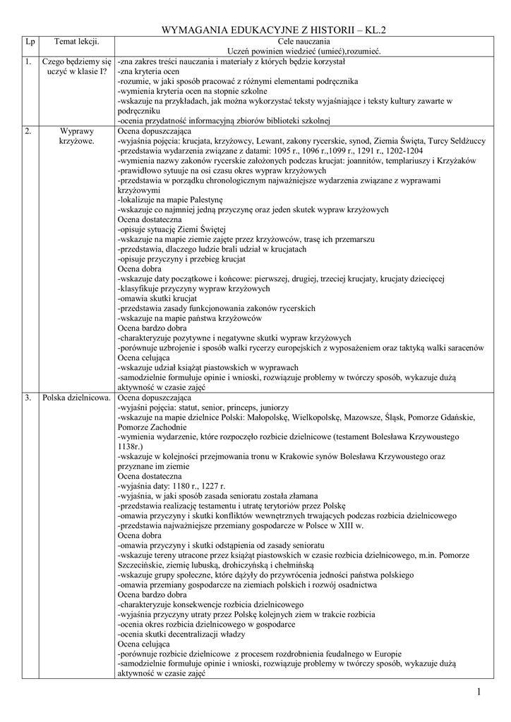 WYMAGANIA EDUKACYJNE Z HISTORII – KL.2 Lp 1. 2. 3. Temat lekcji. Cele nauczania Uczeń powinien wiedzieć (umieć),rozumieć. Czego będziemy się -zna zakres treści nauczania i materiały z których będzie korzystał uczyć w klasie I? -zna kryteria ocen -rozumie, w jaki sposób pracować z różnymi elementami podręcznika -wymienia kryteria ocen na stopnie szkolne -wskazuje na przykładach, jak można wykorzystać teksty wyjaśniające i teksty kultury zawarte w podręczniku -ocenia przydatność informacyjną zbiorów biblioteki szkolnej Wyprawy Ocena dopuszczająca krzyżowe. -wyjaśnia pojęcia: krucjata, krzyżowcy, Lewant, zakony rycerskie, synod, Ziemia Święta, Turcy Seldżuccy -przedstawia wydarzenia związane z datami: 1095 r., 1096 r.,1099 r., 1291 r., 1202-1204 -wymienia nazwy zakonów rycerskie założonych podczas krucjat: joannitów, templariuszy i Krzyżaków -prawidłowo sytuuje na osi czasu okres wypraw krzyżowych -przedstawia w porządku chronologicznym najważniejsze wydarzenia związane z wyprawami krzyżowymi -lokalizuje na mapie Palestynę -wskazuje co najmniej jedną przyczynę oraz jeden skutek wypraw krzyżowych Ocena dostateczna -opisuje sytuację Ziemi Świętej -wskazuje na mapie ziemie zajęte przez krzyżowców, trasę ich przemarszu -przedstawia, dlaczego ludzie brali udział w krucjatach -opisuje przyczyny i przebieg krucjat Ocena dobra -wskazuje daty początkowe i końcowe: pierwszej, drugiej, trzeciej krucjaty, krucjaty dziecięcej -klasyfikuje przyczyny wypraw krzyżowych -omawia skutki krucjat -przedstawia zasady funkcjonowania zakonów rycerskich -wskazuje na mapie państwa krzyżowców Ocena bardzo dobra -charakteryzuje pozytywne i negatywne skutki wypraw krzyżowych -porównuje uzbrojenie i sposób walki rycerzy europejskich z wyposażeniem oraz taktyką walki saracenów Ocena celująca -wskazuje udział książąt piastowskich w wyprawach -samodzielnie formułuje opinie i wnioski, rozwiązuje problemy w twórczy sposób, wykazuje dużą aktywność w czasie zajęć Polska dzielnicowa. Ocena dopuszczająca -wyjaśni pojęcia: statut, senior, princeps, juniorzy -wskazuje na mapie dzielnice Polski: Małopolskę, Wielkopolskę, Mazowsze, Śląsk, Pomorze Gdańskie, Pomorze Zachodnie -wymienia wydarzenie, które rozpoczęło rozbicie dzielnicowe (testament Bolesława Krzywoustego 1138r.) -wskazuje w kolejności przejmowania tronu w Krakowie synów Bolesława Krzywoustego oraz przyznane im ziemie Ocena dostateczna -wyjaśnia daty: 1180 r., 1227 r. -wyjaśnia, w jaki sposób zasada senioratu została złamana -przedstawia realizację testamentu i utratę terytoriów przez Polskę -omawia przyczyny i skutki konfliktów wewnętrznych trwających podczas rozbicia dzielnicowego -przedstawia najważniejsze przemiany gospodarcze w Polsce w XIII w. Ocena dobra -omawia przyczyny i skutki odstąpienia od zasady senioratu -wskazuje tereny utracone przez książąt piastowskich w czasie rozbicia dzielnicowego, m.in. Pomorze Szczecińskie, ziemię lubuską, drohiczyńską i chełmińską -wskazuje grupy społeczne, które dążyły do przywrócenia jedności państwa polskiego -omawia przemiany gospodarcze na ziemiach polskich i rozwój osadnictwa Ocena bardzo dobra -charakteryzuje konsekwencje rozbicia dzielnicowego -wyjaśnia przyczyny utraty przez Polskę kolejnych ziem w trakcie rozbicia -ocenia okres rozbicia dzielnicowego w gospodarce -ocenia skutki decentralizacji władzy Ocena celująca -porównuje rozbicie dzielnicowe z procesem rozdrobnienia feudalnego w Europie -samodzielnie formułuje opinie i wnioski, rozwiązuje problemy w twórczy sposób, wykazuje dużą aktywność w czasie zajęć 1 4. Mongołowie. 5. Sprowadzenie Krzyżaków do Polski. Ocena dopuszczająca -wyjaśnia daty: 1206 r., 1223 r., 1227 r., 1241 r., -przedstawia dokonania postaci: Czyngis-chana, Henryka Pobożnego -wyjaśnia pojęcia: jarłyk, haracz, chan -wskazuje na mapie zasięg terytorialny państwa Mongołów -wskazuje tereny w Europie, które atakowali Tatarzy Ocena dostateczna -opisuje podboje Mongołów -opisuje działalność Złotej Ordy -przedstawia co najmniej jeden skutek najazdu tatarskiego na Polskę Ocena dobra -przedstawia skutki bitwy nad rzeką Kałką -opisuje zasady organizacji państwa mongolskiego -wskazuje skutki najazdów tatarskich na państwa europejskie -szczegółowo omawia znaczenie oraz skutki bitwy pod Legnicą -charakteryzuje przyczyny klęski Polaków pod Legnicą -określa przyczyny sukcesów militarnych Mongołów Ocena bardzo dobra -porównuje taktykę walki Mongołów i rycerstwa europejskiego -charakteryzuje stosunek Europejczyków do Mongołów -wyjaśnia pochodzenie określenia Tatarzy Ocena celująca -samodzielnie formułuje opinie i wnioski, rozwiązuje problemy w twórczy sposób, wykazuje dużą aktywność w czasie zajęć Ocena dopuszczająca -przedstawia wydarzenia związane z datami: 1226 r., 1283 r., 1309 r. -wskazuje na mapie tereny państwa krzyżackiego i jego stolicę -wskazuje plemiona podbite przez Krzyżaków: Prusów i Jaćwingów Ocena dostateczna -omawia rozwój terytorialny państwa zakonnego -opisuje korzyści i zagrożenia wynikające z osiedlenia się Krzyżaków w Prusach -omawia okoliczności zajęcia przez Krzyżaków Pomorza Gdańskiego Ocena dobra -przedstawia genezę powstania zakonu krzyżackiego -wyjaśnia przyczyny sprowadzenia Krzyżaków do Polski -omawia etapy budowy państwa zakonnego -charakteryzuje zamek w Malborku jako przykład średniowiecznej fortyfikacji -wskazuje, jaki wpływ mieli rycerze zakonni na rozwój gospodarczy podbitych ziem polskich -wyjaśnia znaczenie pojęcia komturia Ocena bardzo dobra -ocenia fakt sprowadzenia Krzyżaków do Polski -analizuje przyczyny sukcesów militarnych i gospodarczych państwa krzyżackiego Ocena celująca -samodzielnie formułuje opinie i wnioski, rozwiązuje problemy w twórczy sposób, wykazuje dużą aktywność w czasie zajęć 2 6. 7. Zjednoczenie Ocena