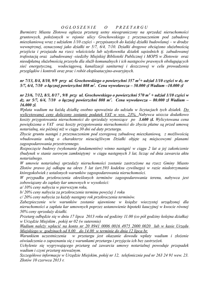 OGŁOSZENIE O PRZETARGU Burmistrz Miasta Złotowa ogłasza przetarg ustny nieograniczony na sprzedaż nieruchomości gruntowych, położonych w rejonie ulicy Grochowskiego z przeznaczeniem pod zabudowę mieszkaniową wraz z udziałem 1/10 części – przypisanych do każdej działki budowlanej – w drodze wewnętrznej, oznaczonej jako działki nr 5/7, 6/4, 7/10. Działki drogowe obciążono służebnością przejścia i przejazdu na rzecz właściciela lub użytkownika działek sąsiednich tj. zabudowanej trafostacją oraz zabudowanej -siedziby Miejskiej Biblioteki Publicznej i MOPS w Złotowie oraz nieodpłatną służebnością przesyłu dla służb komunalnych i ich następców prawnych obsługujących sieć energetyczną, wodociągową, kanalizacji sanitarnej i deszczowej w celu prowadzenia przeglądów i kontroli oraz prac i robót eksploatacyjno-awaryjnych. nr 7/13, 8/4, 8/10, 9/9 przy ul. Grochowskiego o powierzchni 357 m 2+ udział 1/10 części w dz. nr 5/7, 6/4, 7/10 o łącznej powierzchni 808 m2. Cena wywoławcza – 50.000 zł Wadium –10.000 zł nr 23/6, 7/12, 8/3, 8/17 , 9/8 przy ul. Grochowskiego o powierzchni 570 m 2 + udział 1/10 części w dz. nr 5/7, 6/4, 7/10 o łącznej powierzchni 808 m 2. Cena wywoławcza – 80.000 zł Wadium – 16.000 zł. Wpłata wadium na każdą działkę osobno upoważnia do udziału w licytacjach tych działek. Do wylicytowanej ceny doliczony zostanie podatek VAT w wys. 23%. Nabywca uiszcza dodatkowo koszty przygotowania nieruchomości do sprzedaży wynoszące po 3.600 zł. Wylicytowana cena powiększona o VAT oraz koszty przygotowania nieruchomości do zbycia płatne są przed umową notarialną, nie później niż w ciągu 30 dni od daty przetargu. Zbycie gruntu nastąpi z przeznaczeniem pod szeregową zabudowę mieszkaniową, z możliwością wbudowania usług o charakterze nieuciążliwym Działki objęte są miejscowymi planami zagospodarowania przestrzennego. Rozpoczęcie budowy (wykonanie fundamentów) winno nastąpić w ciągu 2 lat a jej zakończenie (budynek w stanie surowym zamkniętym) w ciągu następnych 3 lat, licząc od dnia zawarcia aktu notarialnego. W umowie notarialnej sprzedaży nieruchomości zostanie zastrzeżone na rzecz Gminy Miasto Złotów prawo jej odkupu na okres 5 lat (art.593 kodeksu cywilnego) w razie niedotrzymania któregokolwiek z ustalonych warunków zagospodarowania nieruchomości. W przypadku przekroczenia określonych terminów zagospodarowania terenu, nabywca jest zobowiązany do zapłaty kar umownych w wysokości: a/ 10% ceny nabycia w pierwszym roku, b/ 20% ceny nabycia za przekroczenie terminu powyżej 1 roku c/ 20% ceny nabycia za każdy następny rok przekroczenia terminów. Zabezpieczenie w/w warunków zostanie ujawnione w księdze wieczystej urządzonej dla nieruchomości a zapłata kar umownych poprzez ustanowienie hipoteki kaucyjnej w kwocie równej 50% ceny sprzedaży działki. Przetarg odbędzie się w dniu 17 lipca 2013 roku od godziny 11.00 (co pół godziny kolejna działka) w Urzędzie Miejskim , pokój nr 02 (w suterenie) Wadium należy wpłacić na konto nr 20 8941 0006 0016 4975 2000 0020 lub w kasie Urzędu Miejskiego w godzinach od 8.00 do 14.00 w terminie do dnia 12 lipca br. Warunkiem uczestniczenia w przetargu jest okazanie dowodu wpłaty wadium i złożenie oświadczenia o zapoznaniu się z warunkami przetargu i przyjęciu ich bez zastrzeżeń. Uchylenie się wygrywającego przetarg od zawarcia umowy notarialnej powoduje przepadek wadium i czyni przetarg nieważnym. Szczegółowe informacje w Urzędzie Miejskim, pokój nr 12, telefonicznie pod nr 263 24 91 wew. 23. Złotów 10 czerwca 2013 r.