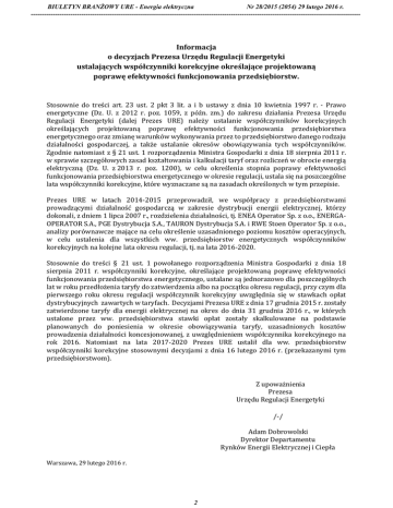 BIULETYN BRANŻOWY URE - Energia elektryczna Nr 28/2015 (2054) 29 lutego 2016 r. ------------------------------------------------------------------------------------------------------------------------------------------------------ Informacja o decyzjach Prezesa Urzędu Regulacji Energetyki ustalających współczynniki korekcyjne określające projektowaną poprawę efektywności funkcjonowania przedsiębiorstw. Stosownie do treści art. 23 ust. 2 pkt 3 lit. a i b ustawy z dnia 10 kwietnia 1997 r. - Prawo energetyczne (Dz. U. z 2012 r. poz. 1059, z późn. zm.) do zakresu działania Prezesa Urzędu Regulacji Energetyki (dalej Prezes URE) należy ustalanie współczynników korekcyjnych określających projektowaną poprawę efektywności funkcjonowania przedsiębiorstwa energetycznego oraz zmianę warunków wykonywania przez to przedsiębiorstwo danego rodzaju działalności gospodarczej, a także ustalanie okresów obowiązywania tych współczynników. Zgodnie natomiast z § 21 ust. 1 rozporządzenia Ministra Gospodarki z dnia 18 sierpnia 2011 r. w sprawie szczegółowych zasad kształtowania i kalkulacji taryf oraz rozliczeń w obrocie energią elektryczną (Dz. U. z 2013 r. poz. 1200), w celu określenia stopnia poprawy efektywności funkcjonowania przedsiębiorstwa energetycznego w okresie regulacji, ustala się na poszczególne lata współczynniki korekcyjne, które wyznaczane są na zasadach określonych w tym przepisie. Prezes URE w latach 2014-2015 przeprowadził, we współpracy z przedsiębiorstwami prowadzącymi działalność gospodarczą w zakresie dystrybucji energii elektrycznej, którzy dokonali, z dniem 1 lipca 2007 r., rozdzielenia działalności, tj. ENEA Operator Sp. z o.o., ENERGAOPERATOR S.A., PGE Dystrybucja S.A., TAURON Dystrybucja S.A. i RWE Stoen Operator Sp. z o.o., analizy porównawcze mające na celu określenie uzasadnionego poziomu kosztów operacyjnych, w celu ustalenia dla wszystkich ww. przedsiębiorstw energetycznych współczynników korekcyjnych na kolejne lata okresu regulacji, tj. na lata 2016-2020. Stosownie do treści § 21 ust. 1 powołanego rozporządzenia Ministra Gospodarki z dnia 18 sierpnia 2011 r. współczynniki korekcyjne, określające projektowaną poprawę efektywności funkcjonowania przedsiębiorstwa energetycznego, ustalane są jednorazowo dla poszczególnych lat w roku przedłożenia taryfy do zatwierdzenia albo na początku okresu regulacji, przy czym dla pierwszego roku okresu regulacji współczynnik korekcyjny uwzględnia się w stawkach opłat dystrybucyjnych zawartych w taryfach. Decyzjami Prezesa URE z dnia 17 grudnia 2015 r. zostały zatwierdzone taryfy dla energii elektrycznej na okres do dnia 31 grudnia 2016 r., w których ustalone przez ww. przedsiębiorstwa stawki opłat zostały skalkulowane na podstawie planowanych do poniesienia w okresie obowiązywania taryfy, uzasadnionych kosztów prowadzenia działalności koncesjonowanej, z uwzględnieniem współczynnika korekcyjnego na rok 2016. Natomiast na lata 2017-2020 Prezes URE ustalił dla ww. przedsiębiorstw współczynniki korekcyjne stosownymi decyzjami z dnia 16 lutego 2016 r. (przekazanymi tym przedsiębiorstwom). Z upoważnienia Prezesa Urzędu Regulacji Energetyki /-/ Adam Dobrowolski Dyrektor Departamentu Rynków Energii Elektrycznej i Ciepła Warszawa, 29 lutego 2016 r. 2