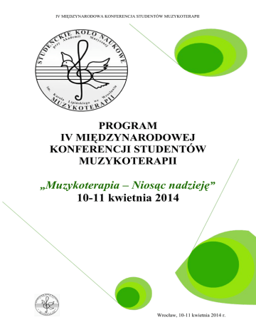 IV MIĘDZYNARODOWA KONFERENCJA STUDENTÓW MUZYKOTERAPII PROGRAM IV MIĘDZYNARODOWEJ KONFERENCJI STUDENTÓW MUZYKOTERAPII „Muzykoterapia – Niosąc nadzieję” 10-11 kwietnia 2014 Wrocław, 10-11 kwietnia 2014 r. IV MIĘDZYNARODOWA KONFERENCJA STUDENTÓW MUZYKOTERAPII PATRONAT HONOROWY Jego Magnificencja Rektor Akademii Muzycznej im. Karola Lipińskiego we Wrocławiu prof. AM dr hab. Krystian Kiełb Akademia Muzyczna im. Karola Lipińskiego we Wrocławiu PATRONAT HONOROWY Prezydent Miasta Wrocławia Rafał Dutkiewicz PATRONAT MEDIALNY NIEZALEŻNA TELEWIZJA TAGEN TV Wrocław, 10-11 kwietnia 2014 r. IV MIĘDZYNARODOWA KONFERENCJA STUDENTÓW MUZYKOTERAPII KOMITET ORGANIZACYJNY Szymon Chrobak (przewodniczący), dr Klaudia Kukiełczyńska - Krawczyk, Anna Skrobol, Katarzyna Gajda, Beata Radzik ORGANIZATORZY STUDENCKIE KOŁO NAUKOWE MUZYKOTERAPII AKADEMIA MUZYCZNA IM. KAROLA LIPIŃSKIEGO WE WROCŁAWIU Adres Komitetu Organizacyjnego STUDENCKIE KOŁO NAUKOWE MUZYKOTERAPII Akademia Muzyczna im. Karola Lipińskiego pl. Jana Pawła II nr 2 50-043 Wrocław Miejsce obrad Akademia Muzyczna im. Karola Lipińskiego Sala Kameralna ( I piętro ) Wrocław, pl. Jana Pawła II nr 2 Wrocław, 10-11 kwietnia 2014 r. IV MIĘDZYNARODOWA KONFERENCJA STUDENTÓW MUZYKOTERAPII 10 kwietnia 2014r. (czwartek) SALA KAMERALNA Akademii Muzycznej im. Karola Lipińskiego we Wrocławiu 9:30 – 10:00 Powitanie gości i uczestników przez Przewodniczącego Studenckiego Koła Naukowego Muzykoterapii - Szymona Chrobaka, oraz Opiekuna Studenckiego Koła Naukowego Muzykoterapii - dr Klaudię Kukiełczyńską - Krawczyk Wystąpienie Prorektor ds. Studenckich i Dydaktyki Akademii Muzycznej im. Karola Lipińskiego we Wrocławiu – prof. Heleny Tomaszek - Plewy Wystąpienie Kierownika Zakładu Muzykoterapii Ogólnej i Stosowanej Akademii Muzycznej im. Karola Lipińskiego we Wrocławiu – dr Pawła Cylulko I panel konferencji Prowadzenie: Anna Skrobol, Dagmara Bulińska 10:00 – 10:25 - Justyna Miłosz-Konopacka, Beata Radzik, Szymon Chrobak Absolwentki Akademii Muzycznej im. Karola Lipińskiego we Wrocławiu, specjalność: muzykoterapia. Student III roku Akademii Muzycznej im. Karola Lipińskiego we Wrocławiu, specjalność: muzykoterapia. Dawno, dawno temu… czyli historia Studenckiego Koła Naukowego Muzykoterapii we Wrocławiu. (referat) Koła Naukowe to wyjątkowe organizacje. Przyświecają im prawdziwie szczytne cele, które zrzeszają pełnych zapału młodych ludzi, będących w stanie realizować naprawdę ambitne projekty i swoim entuzjazmem zarażających innych. Jak zaczęła się historia Studenckiego Koła Naukowego Muzykoterapii, kto ją tworzył, jakie działania podejmowali studenci i czego się nauczyli uczestnicząc w pracach koła naukowego – to pytania, na które odpowiedzi znajdą się w niniejszej prezentacji. Wrocław, 10-11 kwietnia 2014 r. IV MIĘDZYNARODOWA KONFERENCJA STUDENTÓW MUZYKOTERAPII 10:25– 10:50 – Marta Siepsiak Studentka III roku Szkoły Wyższej Psychologii Społecznej w Warszawie, specjalność: Psychologia kliniczna dziecka. Muzykoterapia aktywna w indywidualnej pracy z dzieckiem z niepełnosprawnością intelektualną - studium przypadku. (referat) Improwizacje wokalno-instrumentalne, ruch do muzyki, śpiew - na przykładzie pracy z dzieckiem z Zespołem Downa (prezentacja wideo) zostanie omówione jak aktywności muzyczne mogą stać się narzędziem do osiągnięcia celów terapeutycznych. 10:50 – 11:50 – Anna Skrobol i Natalia Sawrycz Studentka I roku studiów magisterskich Akademii Muzycznej im. Karola Lipińskiego we Wrocławiu, Wydział Kompozycji, Dyrygentury, Teorii Muzyki i Muzykoterapii, specjalność: Muzykoterapia Studentka IV roku studiów magisterskich Uniwersytetu Wrocławskiego, kierunek: Psychologia Moc kreatywności. (warsztat) Kreatywność jest dziś zasobem nieodłącznym do pracy w każdym środowisku. Istnieje wiele sposobów, aby obudzić w sobie tę twórczą aktywność i wzbogacić swoje życie wewnętrzne, psychikę, czy intelekt. Warsztaty będą okazją do dobrej zabawy oraz inspiracją do odkrycia swoich twórczych możliwości. 11:50 - 12:10 Przerwa na kawę i ciastka II panel konferencji Prowadzenie: Dorota Danilewicz, Anna Mierczyńska 12:10 – 12:35 - Alicja Ryczkowska Studentka I roku Studiów Doktoranckich Nauk o Kulturze, Katedra Muzykologii, Uniwersytet Wrocławski, specjalność: psychologia muzyki. Stosunek do muzyki a opinie na temat muzykoterapii pacjentów oddziałów dziennych szpitala psychiatrycznego. (referat) Podczas wystąpienia omówione zostaną wyniki badań sondażowych dotyczących zależności pomiędzy stosunkiem pacjentów do muzyki a opiniami na temat muzykoterapii. Badania te Wrocław, 10-11 kwietnia 2014 r. IV MIĘDZYNARODOWA KONFERENCJA STUDENTÓW MUZYKOTERAPII przeprowadzone zostały przeze mnie pod kierunkiem dr Heleny Cesarz na potrzeby pracy magisterskiej "Stosunek do muzyki a opinie na temat muzykoterapii pacjentów oddziałów dziennych szpitala psychiatrycznego" (Akademia Muzyczna im. K. Lipińskiego, Wrocław, 2013). 12:35 – 13:00 – Natalia Borcz Studentka I roku studiów magisterskich Akademii Muzycznej im. Karola Lipińskiego we Wrocławiu, Wydział Kompozycji, Dyrygentury, Teorii Muzyki i Muzykoterapii, specjalność: Muzykoterapia. Elementy muzykoterapii w pracy pedagogicznej z młodzieżą w okresie adolescencji. (referat) Możliwość wykorzystania technik muzykoterapeutycznych na zajęciach szkolnych, takich jak lekcje muzyki i sztuki, zajęcia wychowawcze, świetlica szkolna, zajęcia prowadzone przez pedagoga szkolnego, dodatkowe zajęcia o charakterze muzycznym i artystycznym (chór, zespoły muzyczne, taneczne). 13:00 – 13:25 – Halina Zwiercan Studentka studiów doktoranckich, Wydział Nauk Pedagogicznych, Dolnośląska Szkoła Wyższa. Wykorzystanie aktywizującej roli piłki w zajęciach muzycznych. (referat) Zaprezentowana tematyka uzasadnia wprowadzenie piłek na lekcje muzyki. Pr
