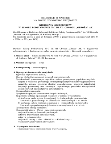 OGŁOSZENIE O NABORZE NA WOLNE STANOWISKO URZĘDNICZE KIEROWNIK GOSPODARCZY W SZKOLE PODSTAWOWEJ Nr 7 IM. VII OBWODU „OBROŻA” AK Opublikowane w Biuletynie Informacji Publicznej Szkoły Podstawowej Nr 7 im. VII Obwodu „Obroża” AK w Legionowie, ul. Królowej Jadwigi 7 Na podstawie ustawy z dnia 21 listopada 2008r. o pracownikach samorządowych (Dz. U z 2008r., nr 223, poz. 1458) Dyrektor Szkoły Podstawowej Nr 7 im. VII Obwodu „Obroża” AK w Legionowie ogłasza otwarty i konkurencyjny nabór na wolne stanowisko - kierownik gospodarczy 1. Miejsce pracy - Szkoła Podstawowa Nr 7 im. VII Obwodu „Obroża” AK w Legionowie, ul. Królowej Jadwigi 7 05-120 Legionowo 2. Wymiar czasu pracy - 1 etat 3. Rodzaj umowy - umowa o pracę 4. Wymagania konieczne dla kandydatów: 1) posiada obywatelstwo polskie, 2) pełna zdolność do czynności prawnych oraz publicznych, 3) niekaralność prawomocnym wyrokiem sądu za przestępstwa popełnione umyślnie, ścigane z oskarżenia publicznego lub umyślne przestępstwa skarbowe; przestępstwa przeciwko mieniu, przeciwko obrotowi gospodarczemu, przeciwko działalności instytucji państwowej oraz samorządu terytorialnego, przeciwko wiarygodności dokumentów lub za przestępstwo karne skarbowe, 4) nieposzlakowana opinia, 5) wyrażenie zgody na przetwarzanie danych osobowych, 6) spełnienie jednego z poniższych warunków w zakresie wykształcenia: a) ukończone studia wyższe i co najmniej 2 – letnia praktyka na stanowisku kierownika gospodarczego w jednostkach samorządowych - w szkole, b) ukończona szkoła średnia i co najmniej 6 – letnia praktyka na stanowisku kierownika gospodarczego w jednostkach samorządowych - w szkole, 7) umiejętność obsługi komputera 8) znajomość ustawy - Prawo zamówień publicznych, znajomość ustawy o finansach publicznych , ustawy o pracownikach samorządowych, ustawy o rachunkowości, znajomość ustawy z dnia 26.06.1974r. – Kodeks Pracy w zakresie wykonywanych obowiązków. 5. Wymagania dodatkowe: 1) komunikatywność oraz umiejętność pracy w zespole, 2) odpowiedzialność, rzetelność, systematyczność, dokładność w działaniu, wysoka kultura osobista, 3) współpraca z instytucjami, jednostkami oświatowymi gminy w zakresie realizacji powierzonych zadań. 6. Wymagane dokumenty: 1) list motywacyjny, 2) kwestionariusz osobowy dla osoby ubiegającej się o zatrudnienie, 3) dokumenty potwierdzające posiadane kwalifikacje (kserokopia świadectw, dyplomów, zaświadczenia o ukończeniu kursów itp.) 4) kserokopie dokumentów potwierdzających doświadczenie zawodowe, 5) oświadczenie o posiadaniu pełnej zdolności do czynności prawnych oraz korzystaniu z pełni praw publicznych, 6) oświadczenie o niekaralności prawomocnym wyrokiem sądu za przestępstwa popełnione umyślnie, przestępstwa przeciwko mieniu, przeciwko obrotowi gospodarczemu, przeciwko działalności instytucji państwowej oraz samorządu terytorialnego, przeciwko wiarygodności dokumentów lub za przestępstwo karne skarbowe, 7) oświadczenie o wyrażeniu zgody na przetwarzanie danych osobowych dla celów rekrutacji. Wszystkie dokumenty zawarte w ofercie muszą być sporządzone w języku polskim w formie umożliwiającej ich odczytanie. Dokumenty aplikacyjne powinny być własnoręcznie podpisane. 7. Główne zadania na stanowisku: 1) współpraca z Zarządca nieruchomości, związana z koordynowaniem zapewnienia sprawności techniczno-eksploatacyjnej budynku i urządzeń terenowych, 2) współpraca i dokonywanie rozliczeń finansowych z Głównym Księgowym, 3) zarządzanie i kontrola pracy pracowników obsługi, podległych bezpośrednio kierownikowi gospodarczemu, 4) ewidencjonowanie wyposażenia i pomocy dydaktycznych w księgach inwentarzowych, 5) zaopatrywanie szkoły w materiały, sprzęt i urządzenia w porozumieniu z Dyrektorem Szkoły i Głównym Księgowym, 6) przygotowywanie dokumentacji przetargowej oraz przeprowadzanie przetargów, 7) prowadzenie kompleksowej dokumentacji związanej z zajmowanym stanowiskiem, 8) wykonywanie innych zadań zleconych przez Dyrektora Szkoły. Szczegółowy wykaz wykonywanych zadań określi zakres czynności. 8. Miejsce i termin składania dokumentów: Dokumenty należy składać osobiście w sekretariacie Szkoły Podstawowej Nr 7 im. VII Obwodu „Obroża” AK w Legionowie, ul. Królowej Jadwigi 7 w terminie do dnia 5 listopada 2014r. W zaklejonych kopertach z dopiskiem: „Nabór na stanowisko kierownika gospodarczego w Szkole Podstawowej Nr 7 im. VII Obwodu „Obroża” AK w Legionowie”. Aplikacje niekompletne lub złożone po terminie nie będą rozpatrywane. Kandydaci, którzy spełnią wymagania konieczne zawarte w ogłoszeniu o naborze, zostaną telefonicznie poinformowani o terminie rozmowy kwalifikacyjnej. Informacja o warunkach pracy na oferowanym stanowisku: Praca w budynku szkoły (budynek dwupiętrowy). Stanowisko związane z pracą przy komputerze. KWESTIONARIUSZ OSOBOWY DLA OSOBY UBIEGAJĄCEJ SIĘ O ZATRUDNIENIE 1. Imię (imiona) i nazwisko ………………………………………………………………….. 2. Imiona rodziców …………………………………………………………………………… 3. Data urodzenia ……………………………………………………………………………... 4. Obywatelstwo ……………………………………………………………………………….. 5. Miejsce zamieszkania (adres do korespondencji) …………………………………………... …………………………………………………………………………………………………... 6. Wykształcenie ………………………………………………………………………………. (nazwa szkoły i rok jej ukończenia) …………………………………………………………………………………………………... ……………………………………………