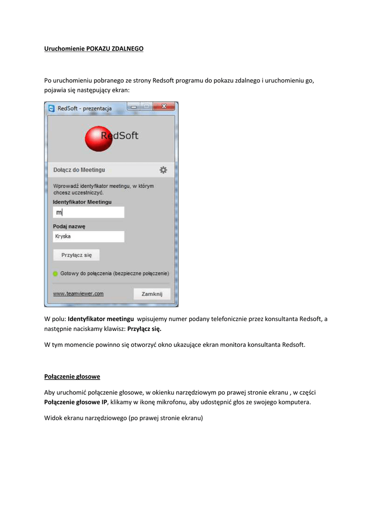 Uruchomienie POKAZU ZDALNEGO Po uruchomieniu pobranego ze strony Redsoft programu do pokazu zdalnego i uruchomieniu go, pojawia się następujący ekran: W polu: Identyfikator meetingu wpisujemy numer podany telefonicznie przez konsultanta Redsoft, a następnie naciskamy klawisz: Przyłącz się. W tym momencie powinno się otworzyć okno ukazujące ekran monitora konsultanta Redsoft. Połączenie głosowe Aby uruchomić połączenie głosowe, w okienku narzędziowym po prawej stronie ekranu , w części Połączenie głosowe IP, klikamy w ikonę mikrofonu, aby udostępnić głos ze swojego komputera. Widok ekranu narzędziowego (po prawej stronie ekranu)