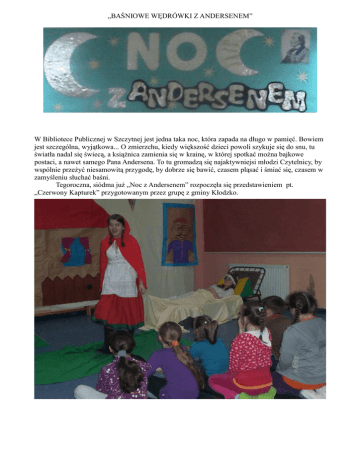 „BAŚNIOWE WĘDRÓWKI Z ANDERSENEM” W Bibliotece Publicznej w Szczytnej jest jedna taka noc, która zapada na długo w pamięć. Bowiem jest szczególna, wyjątkowa... O zmierzchu, kiedy większość dzieci powoli szykuje się do snu, tu światła nadal się świecą, a ksiąŜnica zamienia się w krainę, w której spotkać moŜna bajkowe postaci, a nawet samego Pana Andersena. To tu gromadzą się najaktywniejsi młodzi Czytelnicy, by wspólnie przeŜyć niesamowitą przygodę, by dobrze się bawić, czasem pląsać i śmiać się, czasem w zamyśleniu słuchać baśni. Tegoroczna, siódma juŜ „Noc z Andersenem” rozpoczęła się przedstawieniem pt. „Czerwony Kapturek” przygotowanym przez grupę z gminy Kłodzko. Uczestnicy wędrując leśnymi ścieŜkami, podobnie jak dziewczynka w czerwonym płaszczyku, odkrywali coraz to nowe, tajemnicze zakątki swojej wyobraźni i komnat, nie zabrakło takŜe niespodzianek. Królowa Śniegu, Czarownica i Bzowa Babuleńka zaprosiły Słowiki, Dzikie Łabędzie i Stokrotki do wspólnej zabawy i twórczego spędzenia czasu, oferując mnóstwo ciekawych zadań do wykonania. Zmierzając do celu podróŜy, jakim było spotkanie z chorą babcią, uczestnicy niosąc prace plastyczne oraz literackie dziarsko maszerowali przez las, po czym trafili do chatki, w której mieszka ich ukochana babcia. W podziękowaniu za przygotowane prezenty, a było ich naprawdę sporo, na strudzonych wędrowców czekał słodki poczęstunek. Po dalekiej wędrówce sen powoli morzył kolejnych uczestników. Śpiwory, ciepłe koce, puchowe poduchy i miękkie przytulanki szybko znalazły swoich właścicieli. Najbardziej wytrwałe dzieci zasnęły dopiero około 2.00 w nocy. A rano jeszcze pamiątkowe zdjęcie, kilka słów dotyczących wraŜeń i poŜegnania nadszedł czas.