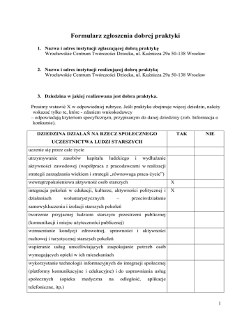 Formularz zgłoszenia dobrej praktyki 1. Nazwa i adres instytucji zgłaszającej dobrą praktykę Wrocławskie Centrum Twórczości Dziecka, ul. Kuźnicza 29a 50-138 Wrocław 2. Nazwa i adres instytucji realizującej dobrą praktykę Wrocławskie Centrum Twórczości Dziecka, ul. Kuźnicza 29a 50-138 Wrocław 3. Dziedzina w jakiej realizowana jest dobra praktyka. Prosimy wstawić X w odpowiedniej rubryce. Jeśli praktyka obejmuje więcej dziedzin, należy wskazać tylko te, które - zdaniem wnioskodawcy – odpowiadają kryteriom specyficznym, przypisanym do danej dziedziny (zob. Informacja o konkursie). DZIEDZINA DZIAŁAŃ NA RZECZ SPOŁECZNEGO TAK NIE UCZESTNICTWA LUDZI STARSZYCH uczenie się przez całe życie utrzymywanie zasobów kapitału ludzkiego i wydłużanie aktywności zawodowej (współpraca z pracodawcami w realizacji strategii zarządzania wiekiem i strategii „równowaga praca-życie”) wewnątrzpokoleniowa aktywność osób starszych X integracja pokoleń w edukacji, kulturze, aktywności politycznej i X działaniach woluntarystycznych – przeciwdziałanie samowykluczeniu i izolacji starszych pokoleń tworzenie przyjaznej ludziom starszym przestrzeni publicznej (komunikacji i miejsc użyteczności publicznej) wzmacnianie kondycji zdrowotnej, sprawności i aktywności ruchowej i turystycznej starszych pokoleń wspieranie usług umożliwiających zaspokajanie potrzeb osób wymagających opieki w ich mieszkaniach wykorzystanie technologii informacyjnych do integracji społecznej (platformy komunikacyjne i edukacyjne) i do usprawniania usług społecznych (opieka medyczna na odległość, aplikacje telefoniczne, itp.) 1 4. Informacje o genezie przedsięwzięcia (inicjatorzy, okoliczności – kontekst, motywy, itp.) 5. Opis przedsięwzięcia wg schematu przewidzianego dla prezentacji w „Złotej Księdze” dane organizacji Wrocławskie Centrum Twórczości Dziecka Ul. Kuźnicza 29a 50-138 Wrocław nazwa, istota, cel przedsięwzięcia Projekt „Sztuka zmienia i łączy pokolenia” dofinansowany ze środków Programu Aktywności Społecznej Osób Starszych Ministerstwa Pracy i Polityki Społecznej oraz Gminy Wrocław (realizowany w dwóch etapach: listopad-grudzień 2012 oraz styczeń-czerwiec 2013). Istotą projektu była organizacja międzypokoleniowych warsztatów teatralnych dla rodzin wielopokoleniowych, osób dorosłych i studentów oraz seniorów z wrocławskich Domów Pomocy Społecznej (Dom Pomocy Społecznej Zgromadzenia Sióstr Franciszkanek Matki Bożej Nieustającej Pomocy oraz Miejskie Centrum Usług Socjalnych). Uczestnicy projektu spotykali się raz w tygodniu, równolegle w trzech grupach, pod opieką instruktorów teatralnych, pracując nad przygotowaniem spektakli, które zostały zaprezentowane podczas uroczystego finału projektu na profesjonalnej scenie teatralnej. Jedna z grup zajmowała się również przygotowaniem kilku etiud filmowych. Cele projektu 1. Stworzenie warunków sprzyjających aktywizacji i samorozwojowi osób starszych w międzypokoleniowym gronie - poprzez stworzenie trzech międzypokoleniowych grup, w których udział mogli wziąć wszyscy chętni seniorzy, w tym z Domów Pomocy Społecznej. Grupy działały artystycznie (teatralnie, filmowo) co stanowiło płaszczyznę porozumienia międzygeneracyjnego, dzięki temu seniorzy mogli zrealizować swoje pasje, odkryć talenty, rozwijać swoje umiejętności. Uczestnicy trzeciego wieku mieli okazję - nierzadko po raz pierwszy - wystąpić na prawdziwej scenie teatralnej czy stworzyć etiudę filmową. 2. Zwiększenie różnorodności spędzania wolnego czasu, wzmocnienie aktywności osób trzeciego wieku i zaangażowanie ich w aktywne życie społeczne - poprzez realizację warsztatów z różnych dziedzin sztuki m.in teatru, filmu, w których uczestnicy pokolenia najstarszego aktywnie brali udział, na takich samych warunkach, jak młodsze pokolenia. 3. Kształtowanie świadomości i nowej kultury relacji międzypokoleniowych, dostrzeżenie podobieństw i różnic międzypokoleniowych, a także korzyści płynących ze współpracy międzypokoleniowej - poprzez wspólne warsztaty artystyczne, w których młodzi ludzie działali na równi z seniorami. W trakcie spotkań młodsze pokolenia czerpały ze skarbnicy wiedzy i doświadczenia, jaką są ludzie starsi. 2 4. Poszerzenie form wsparcia dla rodziny - poprzez realizację warsztatów, w których udział mogły wziąć całe wielopokoleniowe rodziny, a każdy członek działał na równych zasadach, co sprzyjało współpracy. Wspólne warsztaty artystyczne dały rodzinom szansę na spędzanie wolnego czasu razem, a nie tylko w jednym pokoju. Poszczególni członkowie rodzin mieli okazję poznać swoich bliskich w zupełnie nowych sytuacjach. 6. Wyciągnięcie z izolacji mieszkańców DPS - poprzez działania w trzypokoleniowych grupach w dwóch Domach Pomocy Społecznej. Uczestnicy z DPS mają znikomą szansę na udział w działaniach artystycznych poza DPS. Trudności z poruszaniem się, nierzadko konieczność używania wózków inwalidzkich, choroby, sprawiają, że nie mają możliwości udziału w aktywnym życiu artystycznym czy społecznym. DPS jako miejsce odbywania się warsztatów oraz udział uczestników spoza DPS, pozwolił mieszkańcom Domów Pomocy Społecznej na udział w działaniach, które w normalnych warunkach są dla nich nieosiągalne. Zrealizowany materiał filmowy dokumentujący działania projektu może stać się motywacją dla innych organizacji budowania bezinteresownego, serdecznego kontaktu z seniorami, w szczególności z tymi, którzy pozostają w izolacji. uzyskane rezultaty W pierwszym etapie projektu zostały przeprowadzone dwa weekendy warsztatów artystycznych (teatralnych, plastycznych, kulinarnych) w trzech grupach międzypokoleniowych. W ich trakcie uczestnicy mieli okazję poznać nowe techniki i metody pracy artystycznej, rozwinąć swoje zdolności i zainteresowania, poznać ciekawe spo
