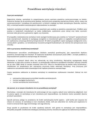 Prawidłowa wentylacja mieszkań. Czym jest wentylacja? Najprościej mówiąc, wentylacja to zorganizowany proces wymiany powietrza zanieczyszczonego na świeże. Powietrze dostaje się do pomieszczenia (pokoje, kuchnia) przez przegrodę zewnętrzną (ściana, okno), nasyca się zanieczyszczeniami i przepływa do pomieszczeń, w których znajdują się klatki wentylacyjne (łazienka, kuchnia, WC), a stamtąd kanałami wentylacyjnymi odprowadzane na zewnątrz. Zadaniem wentylacji jest także zmniejszenie zawartości pary wodnej w powietrzu wewnętrznym. Źródłem pary wodnej w budynkach mieszkalnych są ludzie (oddychanie, wydzielanie przez skórę) oraz także czynności domowe takie jak pranie, gotowanie, kąpiel, czy zmywanie. W przypadku niedostatecznej wentylacji może wystąpić kondensacja pary wodnej na "zimnych" powierzchniach ścian zewnętrznych. Zjawiska te występują szczególnie w mieszkaniach gdzie ze względów oszczędnościowych ich użytkownicy utrzymują obniżoną temperaturach. W takich przypadkach często występuje zawilgocenie ścian, rozwój pleśni i grzybów, a w konsekwencji niszczenie przegród budowlanych, ale również złe samopoczucie oraz choroby. Jakie są przyczyny niewłaściwej wentylacji? Podstawowym warunkiem umożliwiającym działanie wentylacji grawitacyjnej, jest zapewnienie dopływu powietrza zewnętrznego do mieszkań. W większości budynków wznoszonych przed 1990 r. nie było problemu z doprowadzeniem powietrza zewnętrznego do mieszkań. Stosowane w tamtych latach okna nie odznaczały się dużą szczelnością. Najczęściej występowały skargi lokatorów na zbyt duże szczeliny w oknach, co powodowało nadmierne wyziębienie mieszkań. Sytuacja zmieniła się po roku 1990, kiedy to zaczęto stosować okna PCV. Okna te charakteryzują się bardzo dużą szczelnością i niewłaściwa ich eksploatacja jest najczęstszą przyczyną braku właściwej wentylacji. Inną przyczyną jest nadmierne uszczelnienie okien powodujące brak napływu powietrza zewnętrznego. Często spotykane zakłócenia w działaniu wentylacji to niewłaściwe użytkowanie mieszkań. Zaliczyć do nich można: • • • samowolne dokonywanie przeróbek kanałów wentylacyjnych; montaż wyciągów kuchennych; montaż wentylatorów łazienkowych; Jak poznać, że w naszym mieszkaniu nie ma prawidłowej wentylacji? Wychodząc z zewnątrz do mieszkania źle wietrzonego od razu czujemy zaduch oraz nadmierną wilgotność. Jest to pewny sygnał, że wentylacja w tym mieszkaniu jest nieprawidłowa. Jej działanie można sprawdzić dwoma prostymi sposobami. Sposób pierwszy polega na przyłożeniu do kratki wentylacyjnej kartki papieru - jeśli kartka jest zasysana do otworu to oznacza, że wentylacja w tym mieszkaniu działa. Jeśli jest odwrotnie tzn. kartka jest wypierana to może to oznaczać brak ciągu kominowego, lub ciąg wsteczny. Drugi sposób to przyłożenie do kratki zapalonej świeczki. Jeśli gaśnie to wentylacja jest nieprawidłowa. Wszystkie przypadki niewłaściwie działającej wentylacji prosimy niezwłocznie zgłaszać do Administracji Osiedla. Wskazówki dobrego użytkowania mieszkania z urządzeniami gazowymi. 1. Instalowanie lub wymiana urządzeń gazowych przez osobą uprawnioną. 2. Regularne (przynajmniej raz w roku) dokonywanie czynności serwisowych przez autoryzowane zakłady naprawcze. 3. Drzwi łazienkowe winny otwierać się na zewnątrz, a w dolnej ich części winny znajdować się otwory lub kratka wentylacyjna z łączną powierzchnią otworów nie może być mniejsza niż 220cm2. 4. Stosowanie sufitów podwieszanych, zabudowa rur w łazience oraz inne prace nie mogą obniżać kubatury łazienki, która wynosi minimum 8m3. 5. Stały dopływ świeżego powietrza poprzez: a. wietrzenie mieszkania; b. korzystanie z funkcji rozszczelnienia okien; c. nie zasłanianie klatek wentylacyjnych oraz otworów w drzwiach łazienkowych; 6. Przed kąpielą należy dobrze przewietrzyć łazienkę. 7. W czasie kąpieli nie należy używać innych urządzeń gazowych (kuchenka, piekarnik) powoduje to bowiem zmniejszenie ilości tlenu w mieszkaniu. 8. Kąpiel połączona z włączeniem i wyłączeniem piecyka gazowego powinna trwać jak najkrócej. 9. Dogrzewanie mieszkania za pomocą włączonego piekarnika gazowego grozi śmiertelnym zatruciem tlenkiem węgla. Objawy zatrucia: • • • • ból i zawroty głowy; mdłości; osłabienie; wymioty i utrata przytomności; Pierwsza pomoc: • • • natychmiastowe otwarcie okien i drzwi balkonowych w celu doprowadzenia do mieszkania świeżego powietrza; wyłączenie piecyka lub innego urządzenia gazowego; wezwanie pogotowia ratunkowego; Wymagania wynikające z przepisów budowlanych: Zgodnie z art. 62 Prawa Budowlanego Zarządca budynku ma obowiązek raz w roku dokonywać kontroli instalacji gazowych oraz przewodów kominowych. Dlatego prosimy naszych mieszkańców o udostępnianie swoich mieszkań w celu dokonywania okresowej kontroli co pozwoli nam wyeliminować ewentualne usterki i podniesie bezpieczeństwo zamieszkałych budynków.