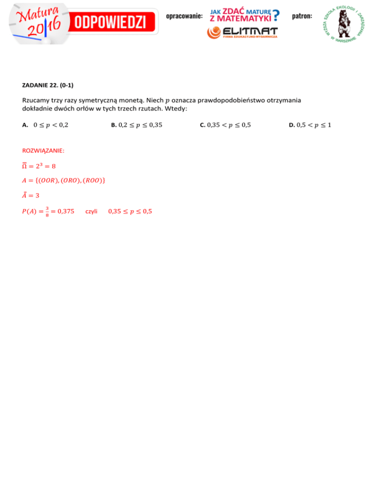 ZADANIE 22. (0-1) Rzucamy trzy razy symetryczną monetą. Niech oznacza prawdopodobieństwo otrzymania dokładnie dwóch orłów w tych trzech rzutach. Wtedy: A. B. ROZWIĄZANIE: czyli C. D.
