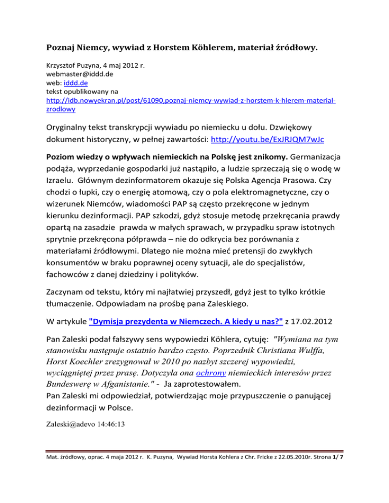 Poznaj Niemcy, wywiad z Horstem Köhlerem, materiał źródłowy. Krzysztof Puzyna, 4 maj 2012 r. [email protected] web: iddd.de tekst opublikowany na http://idb.nowyekran.pl/post/61090,poznaj-niemcy-wywiad-z-horstem-k-hlerem-materialzrodlowy Oryginalny tekst transkrypcji wywiadu po niemiecku u dołu. Dzwiękowy dokument historyczny, w pełnej zawartości: http://youtu.be/ExJRJQM7wJc Poziom wiedzy o wpływach niemieckich na Polskę jest znikomy. Germanizacja podąża, wyprzedanie gospodarki już nastąpiło, a ludzie sprzeczają się o wodę w Izraelu. Głównym dezinformatorem okazuje się Polska Agencja Prasowa. Czy chodzi o łupki, czy o energię atomową, czy o pola elektromagnetyczne, czy o wizerunek Niemców, wiadomości PAP są często przekręcone w jednym kierunku dezinformacji. PAP szkodzi, gdyż stosuje metodę przekręcania prawdy opartą na zasadzie prawda w małych sprawach, w przypadku spraw istotnych sprytnie przekręcona półprawda – nie do odkrycia bez porównania z materiałami źródłowymi. Dlatego nie można mieć pretensji do zwykłych konsumentów w braku poprawnej oceny sytuacji, ale do specjalistów, fachowców z danej dziedziny i polityków. Zaczynam od tekstu, który mi najłatwiej przyszedł, gdyż jest to tylko krótkie tłumaczenie. Odpowiadam na prośbę pana Zaleskiego. W artykule "Dymisja prezydenta w Niemczech. A kiedy u nas?" z 17.02.2012 Pan Zaleski podał fałszywy sens wypowiedzi Köhlera, cytuję: "Wymiana na tym stanowisku następuje ostatnio bardzo często. Poprzednik Christiana Wulffa, Horst Koechler zrezygnował w 2010 po nazbyt szczerej wypowiedzi, wyciągniętej przez prasę. Dotyczyła ona ochrony niemieckich interesów przez Bundeswerę w Afganistanie." - Ja zaprotestowałem. Pan Zaleski mi odpowiedział, potwierdzając moje przypuszczenie o panującej dezinformacji w Polsce. Zaleski@adevo 14:46:13 Mat. źródłowy, oprac. 4 maja 2012 r. K. Puzyna, Wywiad Horsta Kohlera z Chr. Fricke z 22.05.2010r. Strona 1/ 7 "Jiziś Maria, to co on wg Ciebie powiedział, bo dalej nie wiem. O tym, że coś takiego powiedział wiem od dawna, była afera, słyszałem o niej. Nie pamietam skąd wiem, była to w mediach wersja obowiazująca. Co nie musi znaczyć, że prawdziwa." Odpowiadam więc, tłumacząc istotne fragmenty z nagrania oryginalnego wywiadu byłego prezydenta Niemiec Horsta Köhlera z dziennikarzem Christopher Ricke w dniu 22 maja 2010 roku. Rozmowa odbyła się w samolocie w drodze powrotnej z Chin, po postoju w Afganistanie, w Masar-I-Sharif i była wyemitowana tego samego dnia przez Deutschlandradio Kultur. Decydującą o przyczynach dymisji Köhlera treść, przetłumaczyłem. Dla porządku historycznego podaję u dołu cały oryginalny tekst wywiadu. Jest to pierwsza lekcja z Niemiec: Gdy zostaną zdradzone prawdziwe tajemnice panującej kasty, to następuje zdecydowana reakcja. Wystarczy jedna mała tajemnica – w wypadku Horsta Köhlera chodziło o tajemnicę poliszynela znaną właściwie wszystkim rdzennym Niemcom. W przypadku jego następcy prezydenta Niemiec Christiana Wulffa była to dla niego sprawa oczywista, on po prostu nie pomyślał, że zdradza tajemnicę. Prezydent Christian Wulff popełnił w ogóle dużo błędów: brał jak żebrak wszystko co mu dawano za darmo: obcą żonę, obiady, bilety lotnicze, komórki, darowizny, bezzwrotne pożyczki od przyjaciół na budowę domu w wysokości 500.000 Euro, darmowe wczasy, 20-30 tyś. Euro - czyli na jego poziomie politycznym - "peanuts"1. Podczas prób zacierania śladów popełniał dalsze błędy, a mass media je upubliczniały. Wszystkie te błędy by mu jednak wybaczono - był przecież lojalnym współpracownikiem Kanclerza Niemiec Angeli Merkel. Niestety w wypowiedzi do dziennikarzy zdradził mimowolnie specjalną tajemnicę panującej sekty. Otóż na pytanie czy nie czuje się uprzywilejowany, jeśli dostaje kredyt budowlany w banku na 0,7 procenta, gdy normalni śmiertelnicy muszą płacić 5, 1 Tak mówił Josef Ackermann szef Deutsche Bank o wysokości łapówki 60 mln. DM, które dostał za zgodę na przejęcie koncernu Mannesmann-D2 przez Vodafone. Vodafone porozdawał w roku 2000 łapówki w wysokości 112 mln D-Mark. Mat. źródłowy, oprac. 4 maja 2012 r. K. Puzyna, Wywiad Horsta Kohlera z Chr. Fricke z 22.05.2010r. Strona 2/ 7 10 a nawet 22 procent odpowiedział, że dla ludzi z elity do której siebie jako prezydent też zalicza, jest to normalne. Znajomi na moim poziomie, bogaci ludzie dostają kredyty nawet na jeszcze lepszych warunkach np. o stopie procentowej 0,1 procenta, czyli niżej niż pożycza bankom pieniądze bank centralny.. Jego poprzednik prezydent Horst Köhler musiał ustąpić ze stanowiska, gdyż upublicznił militarną doktrynę niemiecką, która dla wszystkich rdzennych Niemców była właściwie tajemnicą poliszynela. Cytaty decydujących wypowiedzi z wywiadu2 "I według mnie jest tak rzeczywiście: My tam walczymy dla naszego bezpieczeństwa w Niemczech, my walczymy w przymierzu z Aliantami, z innymi narodami na podstawie mandatu Zjednoczonych Narodów, rezolucji Organizacji Narodów Zjednoczonych. Wszystko to znaczy: my mamy odpowiedzialność. I ja uważam, że jest w porządku, gdy nad tym się w Niemczech ciągle dyskutuje, a także stawia się pod znakiem zapytania. 2 " Und aus meiner Einschätzung ist es wirklich so: Wir kämpfen dort auch für unsere Sicherheit in Deutschland, wir kämpfen dort im Bündnis mit Alliierten, mit anderen Nationen auf der Basis eines Mandats der Vereinten Nationen, einer Resolution der Vereinten Nationen. Alles das heißt, wir haben Verantwortung. Und ich finde es in Ordnung, wenn in Deutschland darüber immer wieder auch skeptisch mit Fragezeichen diskutiert wird. Meine Einschätzung ist aber, dass insgesamt wir auf dem Wege sind, doch auch in der Breite der Gesellschaft zu verstehen, dass ein Land unserer Größe mit dieser Außenhandelsorientierung und damit auch Außenhandelsabhängigkeit au