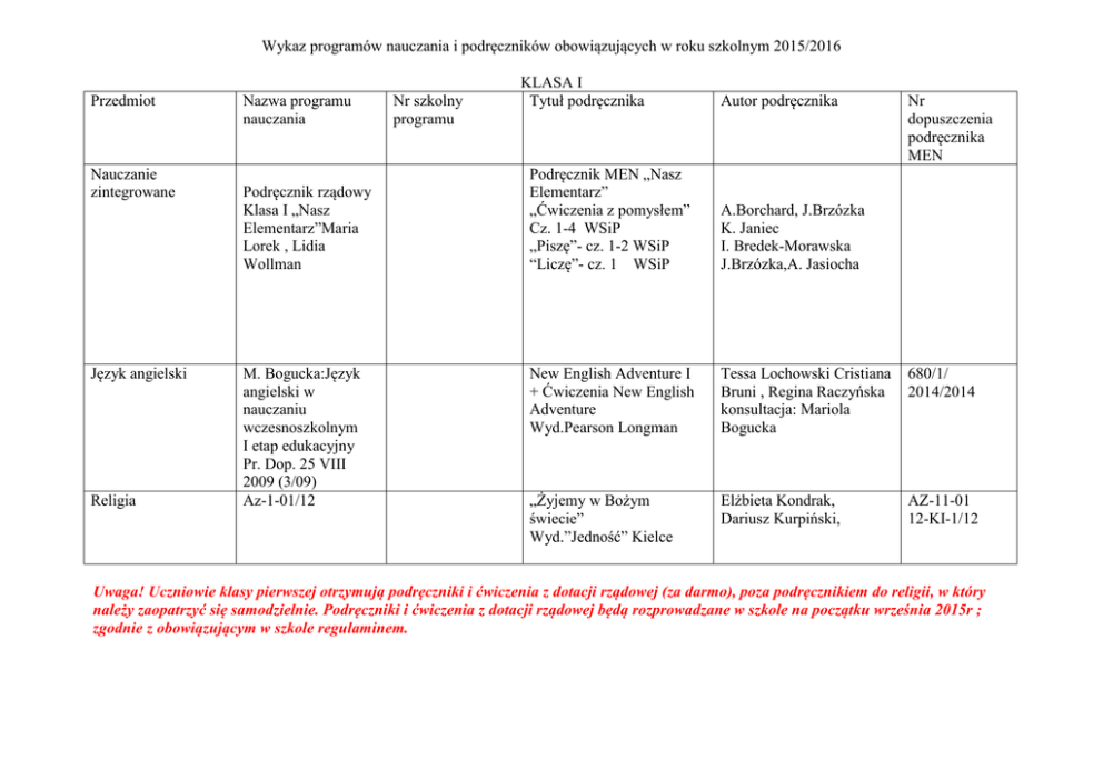 Wykaz programów nauczania i podręczników obowiązujących w roku szkolnym 2015/2016 Przedmiot Nauczanie zintegrowane Język angielski Religia Nazwa programu nauczania Podręcznik rządowy Klasa I „Nasz Elementarz”Maria Lorek , Lidia Wollman M. Bogucka:Język angielski w nauczaniu wczesnoszkolnym I etap edukacyjny Pr. Dop. 25 VIII 2009 (3/09) Az-1-01/12 Nr szkolny programu KLASA I Tytuł podręcznika Autor podręcznika Nr dopuszczenia podręcznika MEN Podręcznik MEN „Nasz Elementarz” „Ćwiczenia z pomysłem” Cz. 1-4 WSiP „Piszę”- cz. 1-2 WSiP “Liczę”- cz. 1 WSiP A.Borchard, J.Brzózka K. Janiec I. Bredek-Morawska J.Brzózka,A. Jasiocha New English Adventure I + Ćwiczenia New English Adventure Wyd.Pearson Longman Tessa Lochowski Cristiana Bruni , Regina Raczyńska konsultacja: Mariola Bogucka 680/1/ 2014/2014 „Żyjemy w Bożym świecie” Wyd.”Jedność” Kielce Elżbieta Kondrak, Dariusz Kurpiński, AZ-11-01 12-KI-1/12 Uwaga! Uczniowie klasy pierwszej otrzymują podręczniki i ćwiczenia z dotacji rządowej (za darmo), poza podręcznikiem do religii, w który należy zaopatrzyć się samodzielnie. Podręczniki i ćwiczenia z dotacji rządowej będą rozprowadzane w szkole na początku września 2015r ; zgodnie z obowiązującym w szkole regulaminem. Wykaz programów nauczania i podręczników obowiązujących w roku szkolnym 2015/2016 Przedmiot Nazwa programu nauczania Nauczanie zintegrowane Podręcznik rządowy Klasa II „Nasza szkoła” Maria Lorek, Monika Zatorska Język angielski Religia M. Bogucka: Język angielski w nauczaniu wczesnoszkolnym I etap edukacyjny kl IIII pr.dop. 25 VIII 2009(3/09) AZ- 1-01/12 Nr szkolny programu KLASA II Tytuł podręcznika Podręcznik rządowy MEN”Nasza szkoła” „ Ćwiczenia z pomysłem”cz.1-4 WSiP „Matematyka”cz.1-4 WSiP „Piszę” cz.1 WSiP „Liczę” cz.1 WSiP English Adventure II +ćwiczenia Wyd. Pearson Longman Idziemy do Jezusa Wyd. „Jedność”Kielce Autor podręcznika J.Filipowicz, K.Izbińska K.Harmak J.Brzózka, A. Jasiocha M.Krajewska B.Kozyra Vir Lambert Anne Worrall; Konsultacje: Mariola Bogucka Praca zbiorowa: dr D. Kurpiński, J. Snopek Nr dopuszczenia podręcznika MEN 680/2/2015 AZ-12-01/12KI-3/12 Uwaga! Uczniowie klasy drugiej otrzymują podręczniki i ćwiczenia z dotacji rządowej (za darmo), poza podręcznikiem do religii, w który należy zaopatrzyć się samodzielnie. Podręczniki i ćwiczenia z dotacji rządowej będą rozprowadzane w szkole na początku września 2015r ; zgodnie z obowiązującym w szkole regulaminem. Wykaz programów nauczania i podręczników obowiązujących w roku szkolnym 2015/2016 Przedmiot Nazwa programu nauczania Nauczanie zintegrowane Język angielski Religia Zajęcia komputerowe M. Bogucka: Język angielski w nauczaniu wczesnoszkolnym ,I etap edukacyjny klIII pr.dop.25 VIII 2009 (3/09) AZ- 1-01/12 Nr szkolny programu KLASA III Tytuł podręcznika Autor podręcznika Nasze Razem w SzkoleEdukacja Wczesnoszkolna w kl. 3.Podręcznik (WSiP) J.Brzózka,K. Glinka, K. Harmak, K. Izbińska,A. Jasiocha, T.Panek Ćwiczenia cz. 1-5 Wyd. WSiP K.Glinka,K.Harmak K.Izbińska Anne Worrall; Konsultacje: Mariola Bogucka English Adventure III (podręcznik z ćwiczeniami) Wyd. Pearson Longman „Jezus jest z nami” Wyd. „Jedność” Kielce Galeria możliwości. Zajęcia komputerowe. Podręcznik z ćwiczeniami . Edukacja wczesnoszkolna klasa 3 Wyd.WSiP Praca zbiorowa ks dr J. Czerkawski, E. Kondrak A. Kulesza Nr dopuszczenia podręcznika MEN 484/5/2014 484/6/2014 67/4/2010/z1 AZ-13-01/12KI-4/13 518/3/2014 Wykaz programów nauczania i podręczników obowiązujących w roku szkolnym 2015/2016 Przedmiot Nazwa programu nauczania Język polski „Czytać, myśleć, uczestniczy program naucz. jęz. polskiego Dla kl IV- VI – Marlena Derlukiewicz Język angielski Opinia merytoryczna Dr hab. Grzegorz Śpiewak Program nauczania języka angielskiego dla II etapu nauczania. Ewa Piotrowska, Tomasz Sztyber Historia „Wczoraj i dziś. Program nauczania ogólnego historii i społeczeństwa w klasie IV-VI. Tomasz Maćkowski Opinia merytoryczna Nr szkolny programu KLASA IV Tytuł podręcznika Autor podręcznika Słowa na start. Podręcznik do kształcenia literackiego i M. Derlukiewicz kulturowego dla kl 4 Wyd. Nowa Era D.Chwastniewska Słowa na start D.Rożek, Podręcznik do kształcenia A. Gorzałczańska-Mróz językowego cz.1i 2 dla kl. 4 Wyd. Nowa Era New Hot Spot1 kl. IV+ Colin Granger Wyd. MacMillan Ćwiczenia Katherina Stannett Nr dopuszczenia podręcznika MEN 338/1/2011/ 2 015 338/2/2011/ 2015 690/1/2014/ 2015 Wyd. MacMillan Wczoraj i dziś. Podręcznik do historii i społeczeństwa Wyd. Nowa Era Grzegorz Wojciechowski 443/1/2012/ 2015 Mgr Dariusz Judek Plastyka Technika Muzyka Matematyka Przyroda „ Do Dzieła”. Program nauczania plastyki w szkole podstawowej. Autor Jadwiga Lukas, Krystyna Onak Opinia merytoryczna mgr Ewa Sudnik „Jak to działa” Autor Lech Łabecki Program nauczania ogólnego muzyki w klasachProgram nauczania ogólnego muzyki w klasach IV- VI szkoły podstawowej.”I gra muzyka”Autor Monika Gromek Grażyna Kilbach „Program nauczania matematyki w klasach 4-6 szkoły podstawowej . „Matematyka wokół nas”Autor Helena Lewicka Marianna Kowalczyk „Tajemnice przyrody” Program nauczania przyrody w klasach 4-6 szkoły podstawowej. Autor Jolanta Golanko „ Do dzieła” Wyd. Nowa Era Jadwiga Lukas Krystyna Onak 326/1/2011/ 326/2011/2015 „Jak to działa” Wyd Nowa Era Lech Łabecki Marta Łabecka 295/2010/2014 Matematyka wokół naspodręcznik oraz ćwicz. 1 i 2 część Wyd.WSiP Helena Lewicka Marianna Kowalczyk Nr aprobaty 275/1/2010/ 2014 Tajemnice przyrodypodręcznik kl IV. Zeszyt ćwiczeń kl.4 cz.1i 2 Tajemnice przyrody Wyd. Nowa Era Maria Marko-Worłowska Feliks Szlajfer Joanna Stawarz,J.Golanko,U. Moździerz 399/1/2011/ 2014 Bez podręcznika Religia Az-2-02/1 Wychowanie fizyczne „Wychowanie fizyczne dla klas IVVI Alicja Romanowska „
