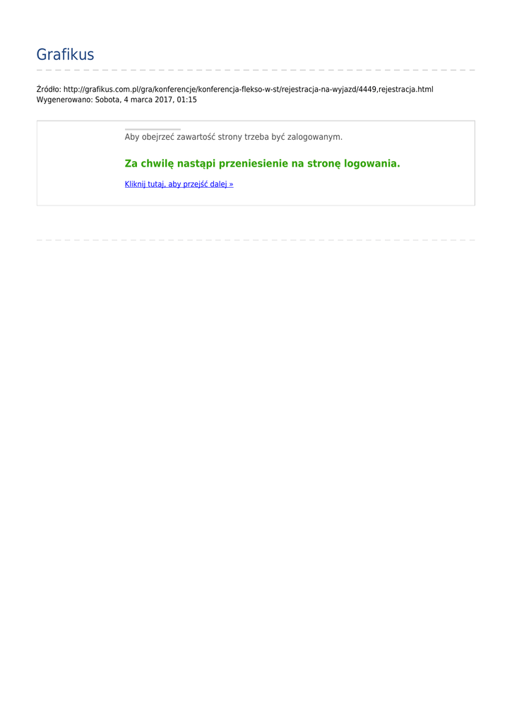 Grafikus Źródło: http://grafikus.com.pl/gra/konferencje/konferencja-flekso-w-st/rejestracja-na-wyjazd/4449,rejestracja.html Wygenerowano: Sobota, 4 marca 2017, 01:15 Aby obejrzeć zawartość strony trzeba być zalogowanym. Za chwilę nastąpi przeniesienie na stronę logowania. Kliknij tutaj, aby przejść dalej »