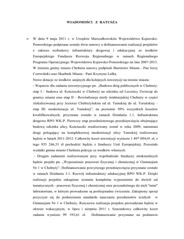 WIADOMOŚCI Z RATUSZA • W dniu 9 maja 2011 r. w Urzędzie Marszałkowskim Województwa KujawskoPomorskiego podpisane zostały dwie umowy o dofinansowanie realizacji projektów z zakresu rozbudowy infrastruktury drogowej i edukacyjnej ze środków Europejskiego Funduszu Rozwoju Regionalnego w ramach Regionalnego Programu Operacyjnego Województwa Kujawsko-Pomorskiego na lata 2007-2013. W imieniu gminy miasto ChełmŜa umowy podpisali Burmistrz Miasta - Pan Jerzy Czerwiński oraz Skarbnik Miasta - Pani Krystyna Lulka. Nowe dotacje ze środków unijnych dla kolejnych inwestycji na terenie miasta: - Wsparcie dla zadania inwestycyjnego pn. „Budowa dróg publicznych w ChełmŜy: etap I – budowa ul. Kościuszki w ChełmŜy na odcinku od Lecznicy Zwierząt do granicy miasta oraz etap II – Rewitalizacja strefy śródmiejskiej ChełmŜy w części zlokalizowanej przy Jeziorze ChełmŜyńskim od ul. Tumskiej do ul. Toruńskiej – etap III: modernizacja ul. Tumskiej”, na poziomie 50% wszystkich kosztów kwalifikowalnych, przyznane zostało w ramach Działania 1.1. Infrastruktura drogowa RPO WK-P. Pierwszy etap przedmiotowego przedsięwzięcia obejmujący budowę odcinka ulicy Kościuszki zrealizowany został w roku 2009, natomiast drugi polegający na kompleksowej modernizacji ulicy Tumskiej realizowany będzie w latach 2011-2012. Całkowity koszt inwestycji wyniesie 1 897 094,01 zł, z tego 935 246,33 zł pochodzić będzie z funduszy Unii Europejskiej. Pozostałe wydatki gmina miasto ChełmŜa pokryje ze środków własnych. - Drugim zadaniem realizowanym przy współudziale funduszy strukturalnych będzie projekt pn. „WyposaŜenie pracowni fizycznej i chemicznej w Gimnazjum Nr 1 w ChełmŜy”. Dofinansowanie powyŜszego przedsięwzięcia przyznane zostało w ramach Działania 3.1. Rozwój infrastruktury edukacyjnej RPO WK-P. Dzięki realizacji projektu zakupione zostanie kompletne wyposaŜenie do dwóch sal tematycznych - pracowni fizycznej i chemicznej oraz przynaleŜnego do nich ''mini" laboratorium, w którym prowadzone są profesjonalne ćwiczenia. Zakupiony sprzęt przyczyni się do podniesienia standardu nauczania przedmiotów ścisłych w Gimnazjum Nr 1 w ChełmŜy. Rzeczowa realizacja projektu prowadzona będzie w okresie wakacyjnym, w lipcu i sierpniu 2011 r. Szacunkowy całkowity koszt zadania wyniesie 99 193,61 zł. Dofinansowanie przyznane na podstawie 2 powyŜszej umowy kształtuje się na poziomie 65% wszystkich wydatków kwalifikowalnych i wyniesie 64 475,84 zł. Informacje na temat postępu w realizacji zadań będą na bieŜąco zamieszczane na stronie internetowej Urzędu Miasta ChełmŜy: www.chelmza.pl w zakładce Projekty Europejskie Regionalny Program Operacyjny Województwa Kujawsko – Pomorskiego. • Wraz z zakończeniem zimowej aury wykonawca robót budowlanych związanych z rewitalizacją strefy śródmiejskiej ChełmŜy w części zlokalizowanej przy Jeziorze ChełmŜyńskim przystąpił do realizacji kolejnych etapów inwestycji. Na rok 2011 zaplanowana została najwaŜniejsza część przedmiotowego projektu, obejmująca kompleksową modernizację ulicy Bulwar 1000-lecia. W pierwszej kolejności przewiduje się umocnienie brzegu Jeziora ChełmŜyńskiego znajdującego się po obu stronach Klubu Sportowo-Turystycznego „Włókniarz”. Następnie po uprzednim wykonaniu kanalizacji deszczowej oraz zastąpieniu istniejącego oświetlenia stylowymi lampami, całkowicie wymieniona zostanie nawierzchnia Bulwaru. Ostatni etap prowadzonego przedsięwzięcia stanowić będzie przygotowanie przy Bulwarze terenu pod lokalizację skate parku. PowyŜsze zadanie obejmuje zarówno wykonanie nawierzchni wraz z odwodnieniem, jak równieŜ odpowiednie oświetlenie tego terenu. Zwieńczeniem prowadzonych prac będzie budowa pochylni, umoŜliwiającej dojście do Bulwaru osobom niepełnosprawnym od strony ulicy Sądowej. Na koniec zamontowane zostaną siedziska amfiteatru oraz elementy małej architektury, takie jak ławki czy kosze na śmieci. Strefa przyjeziorna monitorowana będzie za pomocą dwóch kamer monitoringu wizyjnego, zainstalowanych obok amfiteatru oraz przy Bulwarze na wysokości ul. Browarnej. Zgodnie z przyjętym harmonogramem wszystkie wymienione powyŜej zadania zrealizowane zostaną do końca listopada 2011 roku. Obecnie wykonawca prowadzi prace dotyczące budowy murków terenowych w okolicy amfiteatru oraz roboty związane z umocnieniem brzegów Jeziora ChełmŜyńskiego. 3 ciąg pieszy przy amfiteatrze roboty budowlane przy umacnianiu brzegu Jeziora ChełmŜyńskiego 4 • W miesiącu kwietniu br. wszedł w Ŝycie miejscowy plan zagospodarowania przestrzennego miasta ChełmŜy dla terenu połoŜonego pomiędzy ulicą Rybaki, Górną, wschodnią granicą administracyjną miasta oraz brzegiem Jeziora ChełmŜyńskiego. Na obecną chwilę juŜ prawie 70 % miasta objęte jest miejscowymi planami zagospodarowania przestrzennego. Jest to bardzo wysoki wskaźnik w stosunku do innych gmin w Polsce. Obszarami miasta nie posiadającymi miejscowych planów jest teren firmy Nordzucker Polska S.A. przy ulicy Bydgoskiej oraz obszar Jeziora ChełmŜyńskiego. Miejscowe plany jako akty prawa miejscowego umoŜliwiają lokalizację inwestycji celu publicznego oraz przeznaczenie terenu pod rozwój budownictwa, w szczególności mieszkaniowego oraz usługowego. Po przerwie zimowej oraz wiosennych roztopach roboty budowlane wykonywane w ramach projektu pn. „Budowa i modernizacja kanalizacji sanitarnej i deszczowej miasta ChełmŜy” ruszyły „pełną parą”. Aktualnie prowadzone są prace związane z wykonaniem kanalizacji sanitarnej i kanalizacji deszczowej w następujących ulicach: Chełmińskie Przedmieście, Polna, Trakt, Konopnickiej, Kochanowskiego, M. Reja, a zakończono roboty m.in. w ul. Reymonta i ul. Prusa. Na odcinkach dróg, na których prace ziemne zostały ukończone, wykonywane są działania związane z odtworzeniem nawierzchni ulic do stanu spr