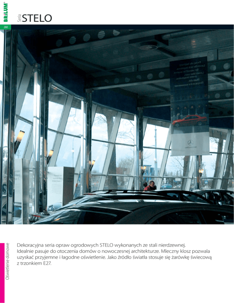 Seria STELO Oświetlenie domowe 280 Dekoracyjna seria opraw ogrodowych STELO wykonanych ze stali nierdzewnej. Idealnie pasuje do otoczenia domów o nowoczesnej architekturze. Mleczny klosz pozwala uzyskać przyjemne i łagodne oświetlenie. Jako źródło światła stosuje się żarówkę świecową z trzonkiem E27. 2. Oświetlenie domowe • zewnętrzne 281 2.1. Oprawy ogrodowe Nr art. 2421 Nr art. 2422 Nr art. 2423 Nr art. 2424 STELO 38A STELO 38B Rodzaj materiału: obudowa – stal nierdzewna klosz/dyfuzor – poliwęglan max. IP 44 E27 40W Wykończenie Cena netto PLN STELO 38A LO-ST38A0-72 stal nierdzewna 118,90 2.5mm2 Oprawa ogrodowa, ścienna Model Indeks Wykończenie Cena netto PLN STELO 38B LO-ST38B0-72 stal nierdzewna 154,90 Oprawa ogrodowa, ścienna Model Indeks Wykończenie Cena netto PLN STELO 40A LO-ST40A0-72 stal nierdzewna 100,90 STELO 40B 0,67kg E27 Indeks STELO 40A 0,46kg ~230V Model STELO 38B 0,97kg Oprawa ogrodowa, ścienna Oprawa ogrodowa, ścienna Model Indeks Wykończenie Cena netto PLN STELO 40B LO-ST40B0-72 stal nierdzewna 138,10 STELO 40A STELO 40B Oświetlenie domowe STELO 38A 0,72kg 2. Oświetlenie domowe • zewnętrzne 282 2.1. Oprawy ogrodowe 0,67kg STELO 45A 1,01kg STELO 45B STELO 45A 1,13kg STELO 65B Oświetlenie domowe STELO 65A Wykończenie Cena netto PLN LO-ST45A0-72 stal nierdzewna 118,90 LO-ST45B0-72 stal nierdzewna 150,10 Model Indeks 2425 STELO 45A 2426 STELO 45B STELO 65A, STELO 65B Nr art. Oprawa ogrodowa, stojąca STELO 45B Rodzaj materiału: obudowa – stal nierdzewna klosz/dyfuzor – poliwęglan max. IP 44 E27 40W 2.5mm2 Cena netto PLN Model Indeks Wykończenie 2427 STELO 65A LO-ST65A0-72 stal nierdzewna 138,10 2428 STELO 65B LO-ST65B0-72 stal nierdzewna 166,90 STELO 65B STELO 45A E27 Oprawa ogrodowa, stojąca STELO 45B 0,89kg STELO 65A ~230V STELO 45A, STELO 45B Nr art. STELO 65A STELO 65B 2. Oświetlenie domowe • zewnętrzne 283 2.1. Oprawy ogrodowe 1,43kg STELO 110A Nr art. 2429 1,67kg Rodzaj materiału: obudowa – stal nierdzewna klosz/dyfuzor – poliwęglan IP 44 E27 40W Wykończenie Cena netto PLN STELO 110A LO-ST110A-72 stal nierdzewna 174,10 Oprawa ogrodowa, stojąca Model Indeks Wykończenie Cena netto PLN STELO 110B LO-ST110B-72 stal nierdzewna 203,00 STELO 110A max. E27 Indeks Oświetlenie domowe 2430 ~230V Model STELO 110B Nr art. Oprawa ogrodowa, stojąca 2.5mm2 STELO 110B