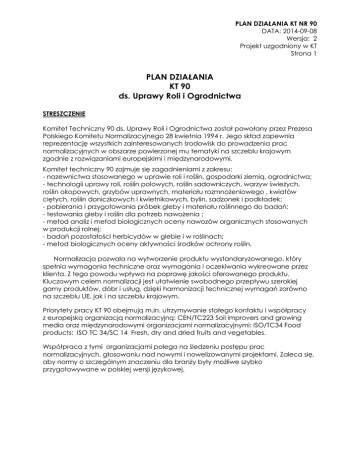 PLAN DZIAŁANIA KT NR 90 DATA: 2014-09-08 Wersja: 2 Projekt uzgodniony w KT Strona 1 PLAN DZIAŁANIA KT 90 ds. Uprawy Roli i Ogrodnictwa STRESZCZENIE Komitet Techniczny 90 ds. Uprawy Roli i Ogrodnictwa został powołany przez Prezesa Polskiego Komitetu Normalizacyjnego 28 kwietnia 1994 r. Jego skład zapewnia reprezentację wszystkich zainteresowanych środowisk do prowadzenia prac normalizacyjnych w obszarze powierzonej mu tematyki na szczeblu krajowym zgodnie z rozwiązaniami europejskimi i międzynarodowymi. Komitet techniczny 90 zajmuje się zagadnieniami z zakresu: - nazewnictwa stosowanego w uprawie roli i roślin, gospodarki ziemią, ogrodnictwa; - technologii uprawy roli, roślin polowych, roślin sadowniczych, warzyw świeżych, roślin okopowych, grzybów uprawnych, materiału rozmnożeniowego , kwiatów ciętych, roślin doniczkowych i kwietnikowych, bylin, sadzonek i podkładek; - pobierania i przygotowania próbek gleby i materiału roślinnego do badań; - testowania gleby i roślin dla potrzeb nawożenia ; - metod analiz i metod biologicznych oceny nawozów organicznych stosowanych w produkcji rolnej; - badań pozostałości herbicydów w glebie i w roślinach; - metod biologicznych oceny aktywności środków ochrony roślin. Normalizacja pozwala na wytworzenie produktu wystandaryzowanego, który spełnia wymagania techniczne oraz wymagania i oczekiwania wykreowane przez klienta. Z tego powodu wpływa na poprawę jakości oferowanego produktu. Kluczowym celem normalizacji jest ułatwienie swobodnego przepływu szerokiej gamy produktów, dóbr i usług, dzięki harmonizacji technicznej wymagań zarówno na szczeblu UE, jak i na szczeblu krajowym. Priorytety pracy KT 90 obejmują m.in. utrzymywanie stałego kontaktu i współpracy z europejską organizacją normalizacyjną: CEN/TC223 Soil improvers and growing media oraz międzynarodowymi organizacjami normalizacyjnymi: ISO/TC34 Food products; ISO TC 34/SC 14 Fresh, dry and dried fruits and vegetables. Współpraca z tymi organizacjami polega na śledzeniu postępu prac normalizacyjnych, głosowaniu nad nowymi i nowelizowanymi projektami. Zaleca się, aby normy o szczególnym znaczeniu dla branży były możliwe szybko przygotowywane w polskiej wersji językowej. PLAN DZIAŁANIA KT NR 90 DATA: 2014-09-08 Wersja: 2 Projekt uzgodniony w KT Strona 2 1. ŚRODOWISKO BIZNESOWE Na działalność gospodarczą objętą zakresem KT znaczący wpływ mają następujące uwarunkowania polityczne, gospodarcze, techniczne, prawne, społeczne i/lub aspekty regionalne/międzynarodowe: Produkcja owoców i warzyw w Unii Europejskiej jest regulowana przez systemy rynku świeżych owoców i warzyw oraz rynku przetworów owocowo–warzywnych. Obecne regulacje rynku świeżych owoców i warzyw określają: 1. Rozporządzenie Parlamentu Europejskiego i Rady (UE) nr 1308/2013 z dnia 17 grudnia 2013 roku ustanawiające wspólną organizację rynków produktów rolnych oraz uchylające rozporządzenia Rady (EWG) nr 922/72, (EWG) nr 234/79, (WE) nr 1037/2001 i (WE) nr 1234/2007 (Dz. Urz. UE L 347 z 20.12.2013, str. 671—854 z późn. zm.), 2. Rozporządzenie wykonawcze Komisji (UE) nr 543/2011 z dnia 7 czerwca 2011 roku ustanawiające szczegółowe zasady stosowania rozporządzenia Rady (WE) nr 1234/2007 w odniesieniu do sektora owoców i warzyw oraz sektora przetworów owoców i warzyw (Dz. Urz. UE L 157 z 15.6.2011, str. 1, z późn. zm.), Ww. akty prawne określają m.in.: • Wspólne wymagania jakościowe – ustanowiono 10 Szczegółowych norm handlowych dla wybranych gatunków świeżych owoców i warzyw (ustanawiających klasy jakości) oraz Ogólną normę handlową dla pozostałych gatunków. Normy handlowe obowiązują na wszystkich etapach obrotu świeżymi owocami i warzywami, obejmujących przede wszystkim: prezentowanie, wystawianie na sprzedaż oraz sprzedaż. Wymagania te nie dotyczą jedynie owoców i warzyw sprzedawanych konsumentom bezpośrednio w gospodarstwie oraz produktów przeznaczonych do przetwórstwa. • Mechanizmy interwencji – polegają na wypłacaniu rekompensat z tytułu wycofania owoców i warzyw z rynku. Działania te prowadzone są przez upoważnione do tego tzw. grupy producenckie. Z rynku mogą być wycofane produkty, które spełniają określone wymagania jakościowe (minimum II klasa). • Organizacje producentów – za ich pomocą kierowana jest główna pomoc Unii Europejskiej dla producentów owoców i warzyw. • Zasady handlu z krajami trzecimi - wszystkie związane z tym działania prowadzą do ochrony rynku wewnętrznego Unii Europejskiej. PLAN DZIAŁANIA KT NR 90 DATA: 2014-09-08 Wersja: 2 Projekt uzgodniony w KT Strona 3 • System kontroli na szczeblu krajowym i UE – obejmuje wymóg prowadzenia kontroli, zbierania informacji i prowadzenia statystki, które służą do podejmowania przez UE decyzji dotyczących rynku ogrodniczego. Regulacja rynku owoców i warzyw w Polsce W Polsce są przepisy, które regulują rynek świeżych owoców i warzyw, dostosowując go do rozwiązań funkcjonujących w Unii Europejskiej. Są to ustawa z dnia 19 grudnia 2003 r. o organizacji rynków owoców i warzyw, rynku chmielu, rynku suszu paszowego oraz rynków lnu i konopi uprawianych na włókno (Dz. U. z 2011 roku Nr 145, poz. 868, z późn. zm.), oraz ustawa o grupach producentów rolnych i ich związkach z 15 września 2000 r. 2. OCZEKIWANE KORZYŚCI Z REALIZACJI PRAC KT Kluczowe korzyści, które zostały już osiągnięte i wynikają z pracy KT 90: Poprawa jakości produktów na rynku; Redukcja barier w handlu; Jednolitość terminologii stosowanej. 3. CZŁONKOSTWO W KT I STRUKTURA KT Każdy podmiot krajowy zainteresowany daną tematyką ma prawo zgłosić chęć uczestnictwa w KT i po spełnieniu wymogów proceduralnych (procedura Z2-P3 w powiązaniu z Z2-P1) stać się członkiem KT. Każdy członek KT realizuje zadania KT poprzez swoich reprezentantów. Aktualny skład KT jest podany na stronie www.pkn.pl,