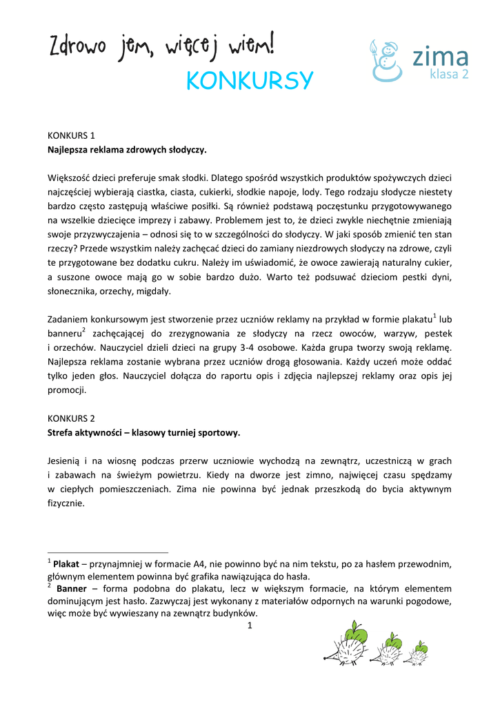 KONKURSY KONKURS 1 Najlepsza reklama zdrowych słodyczy. Większość dzieci preferuje smak słodki. Dlatego spośród wszystkich produktów spożywczych dzieci najczęściej wybierają ciastka, ciasta, cukierki, słodkie napoje, lody. Tego rodzaju słodycze niestety bardzo często zastępują właściwe posiłki. Są również podstawą poczęstunku przygotowywanego na wszelkie dziecięce imprezy i zabawy. Problemem jest to, że dzieci zwykle niechętnie zmieniają swoje przyzwyczajenia – odnosi się to w szczególności do słodyczy. W jaki sposób zmienić ten stan rzeczy? Przede wszystkim należy zachęcać dzieci do zamiany niezdrowych słodyczy na zdrowe, czyli te przygotowane bez dodatku cukru. Należy im uświadomić, że owoce zawierają naturalny cukier, a suszone owoce mają go w sobie bardzo dużo. Warto też podsuwać dzieciom pestki dyni, słonecznika, orzechy, migdały. Zadaniem konkursowym jest stworzenie przez uczniów reklamy na przykład w formie plakatu 1 lub banneru2 zachęcającej do zrezygnowania ze słodyczy na rzecz owoców, warzyw, pestek i orzechów. Nauczyciel dzieli dzieci na grupy 3-4 osobowe. Każda grupa tworzy swoją reklamę. Najlepsza reklama zostanie wybrana przez uczniów drogą głosowania. Każdy uczeń może oddać tylko jeden głos. Nauczyciel dołącza do raportu opis i zdjęcia najlepszej reklamy oraz opis jej promocji. KONKURS 2 Strefa aktywności – klasowy turniej sportowy. Jesienią i na wiosnę podczas przerw uczniowie wychodzą na zewnątrz, uczestniczą w grach i zabawach na świeżym powietrzu. Kiedy na dworze jest zimno, najwięcej czasu spędzamy w ciepłych pomieszczeniach. Zima nie powinna być jednak przeszkodą do bycia aktywnym fizycznie. 1 Plakat – przynajmniej w formacie A4, nie powinno być na nim tekstu, po za hasłem przewodnim, głównym elementem powinna być grafika nawiązująca do hasła. 2 Banner – forma podobna do plakatu, lecz w większym formacie, na którym elementem dominującym jest hasło. Zazwyczaj jest wykonany z materiałów odpornych na warunki pogodowe, więc może być wywieszany na zewnątrz budynków. 1 Nauczyciel dzieli dzieci na grupy 3-4 osobowe. Każda grupa proponuje zabawę lub grę, która będzie jedną z konkurencji w klasowym turnieju. Kolejnym krokiem jest zorganizowanie klasowego turnieju sportowego na przykład podczas zajęć z w-fu. Zabawy dokumentujemy zdjęciami i dołączamy je do raportu. Uczniowie powinni również opisać swoje pomysły na zabawy i umieścić je w szkolnej gablocie, tak aby każdy uczeń ze szkoły mógł z nich skorzystać nawet po zakończeniu turnieju. KONKURS 3 Najciekawsza gazetka ścienna „Jak czytać etykiety?”. Korzystając z wiadomości przekazanych przez nauczyciela w czasie lekcji oraz własnych twórczych pomysłów, dzieci w grupach 3–4 osobowych mają opracować gazetkę ścienną. Gazetka powinna mieć ładną grafikę oraz zawierać ciekawe mini artykuły na temat etykiet. Zadaniem uczniów jest wymyślenie hasła (lub haseł) zachęcającego do czytania etykiet produktów podczas zakupów. Dzieci mogą korzystać z pomocy rodziców, jeśli praca będzie wykonywana w domu lub z pomocy nauczyciela, jeżeli będą przygotowywać gazetkę w czasie lekcji. Hasła zamieszczone w gazetce mogą być przedstawione w formie rebusów. Drogą głosowania odbywa się wybór najlepszej gazetki. Każdy uczeń może oddać tylko jeden głos. W przypadku remisu należy przeprowadzić dodatkowe głosowanie. Nauczyciel ogłasza, która gazetka otrzymała najwięcej głosów. Gazetki powinny być wyeksponowane na korytarzu szkolnym, aby odbiorcami przedstawionych w nich haseł i pomysłów mogły być również inne dzieci. Gazetka, która otrzymała w wyniku głosowania dzieci najwyższą notę, powinna wisieć najdłużej (nawet do końca roku). Nauczyciel wykonuje zdjęcie najciekawszej jego zdaniem gazetki i przysyła na konkurs. Pozostałe gazetki należy także sfotografować i dołączyć do raportu. KONKURS 4 Przedstawienie „Na straganie”. Karnawał to okres zabaw. Warto w tym czasie zorganizować przedstawienie teatralne. Przedmiotem konkursu jest przygotowanie przez zespół klasowy przedstawienia „Na Straganie”. Podczas przedstawienia będzie okazja zaprezentowania swojej wiedzy o walorach zdrowotnych warzyw i owoców w formie zabawy. Dzieci powinny być poprzebierane za warzywa i owoce. Opis przygotowań (podział ról, przygotowanie strojów i scenografii, próby) oraz przedstawienia, a także dokumentację zdjęciową należy dołączyć do raportu. 2 MATERIAŁY POMOCNICZE KONKURS – PRZEDSTAWIENIE „NA STRAGANIE” 1. Ilustracja straganu. KONKURS – STREFA AKTYWNOŚCI: TURNIEJ SPORTOWY KLAS I-III 2. Dyplom dla uczestników turnieju 3 DYPLOM dla ………………………………….. za zajęcie ……….. miejsca w turnieju klasowym „Aktywnie po zdrowie” 4