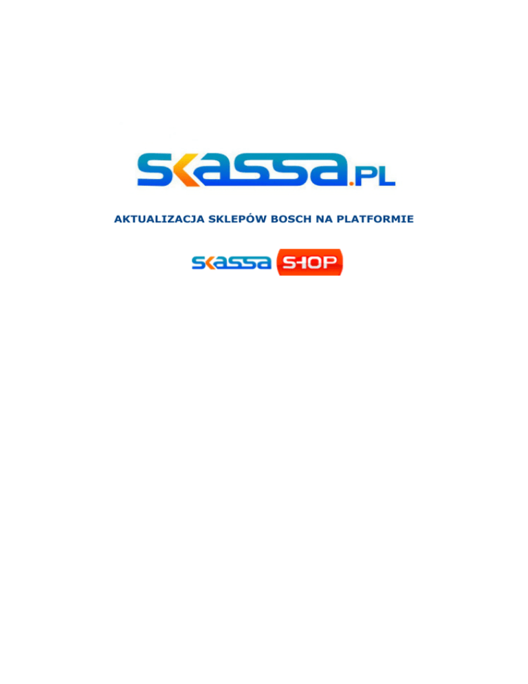 AKTUALIZACJA SKLEPÓW BOSCH NA PLATFORMIE 1. Ważne informacje wstępne Każdy sklep Bosch działający w oparciu o system SkassaSHOP jest wyposażony w funkcję aktualizacji produktów. Źródłem danych do aktualizacji jest System Obsługi Klientów Bosch (SOKB) w firmie Skassa. Sklepy klientów pobierają dane z systemu SOKB i nie są bezpośrednio połączone z główną bazą firmy Bosch. Oznacza to, że po wejściu w życie nowych cenników sklepy nie posiadają automatycznie dostępu do nowych danych. Aktualizacja bazy SOKB, a później również sklepów klientów jest wykonywana dopiero po wydaniu odpowiedniego zlecenia przez firmę Bosch (średnio raz na kwartał). Firma Skassa nie odpowiada za aktualność oferty ani częstotliwość aktualizacji SOKB Każdorazowo po zaktualizowaniu SOKB firma Skassa wykonuje automatyczną aktualizację sklepów klientów. W późniejszym okresie administratorzy poszczególnych sklepów mogą ręcznie uruchomić aktualizację w dowolnym momencie. 2. Zakres aktualizacji Zarówno aktualizacja automatyczna jak i aktualizacja ręczna dotyczą tych samych elementów. Regularne aktualizacje obejmują zazwyczaj dane produktów oraz kategorii, a sporadycznie mogą być również aktualizowane banery główne i strony informacyjne. Aktualizacja obejmuje: - dane produktów: nazwy, opisy, przydział do kategorii, atrybuty, produkty powiązane, akcesoria oraz cen sugerowane - dane kategorii – nazwy, strukturę drzewa Aktualizacja w żaden sposób nie zmienia cen sprzedaży produktów. Ceny sprzedaży należy ustawić samodzielnie Dokładna instrukcja aktualizacji cen na podstawie cen sugerowanych znajduje się w punkcie 4. Tylko po jej wykonaniu ceny dla klientów sklepu zostaną zmienione. Wszystkie produkty i kategorie wprowadzone ręcznie przez administratorów pozostają bez zmian nawet jeśli mają numery katalogowe zgodne z numerami oryginalnych produktów Bosch. SkassaSHOP rozpoznaje produkty na podstawie własnych oznaczeń i wewnętrznych identyfikatorów więc nie ma możliwości aby ręcznie wprowadzona oferta została zmieniona przez aktualizację. 3. Aktualizacja automatyczna Aktualizacja automatyczna odbywa się tuż po wgraniu najnowszej wersji bazy produktów bez uprzedniego powiadomienia administratorów sklepów. Każdy administrator może natomiast ustawić w konfiguracji sklepu powiadomienie o zakończeniu aktualizacji. W tym celu należy wejść w konfigurację: System->konfiguracja->[ustawienia] i w tabeli (na drugiej stronie) zmienić wartość parametru powiadamiaj_mailowo_o_aktualizacjach na 1. Aktualizacja poszczególnych sklepów może przebiegać w różnym czasie więc to, że na niektórych sklepach pojawia się wcześniej, a na innych później jest normalne. Niemniej firma Skassa dokłada starań aby każdorazowo wszystkie sklepy były zaktualizowane w jednym dniu. 4. Aktualizacja ręczna/na żądanie Oprócz aktualizacji automatycznych administratorzy sklepów mają do dyspozycji narzędzie do aktualizacji na żądanie. Wykonanie ręcznej aktualizacji jest zasadne tylko w wypadku pominięcia sklepu przy aktualizacjach automatycznych (np. gdy sklep był w tym czasie wyłączony). W innych sytuacjach aktualizacja nie spowoduje żadnych zmian gdyż system SOKB jest aktualizowany okresowo, a po jego zmianie wszystkie sklepy są automatycznie aktualizowane. Aby wykonać aktualizację sklepu należy wejść w System->konfiguracja>[Aktualizuj produkty i kategorie Bosch]. Naciśnięcie przycisku od razu powoduje włączenie aktualizacji i blokuje działanie panelu. Aktualizacja produktów może trwać od 5min do 15min zależnie od pory dnia, obciążenia serwera i innych czynników. Nie wolno przerywać działania aktualizacji, zamykać okna przeglądarki ani zakładki. Jeśli aktualizacja trwa nieprzerwanie dłużej niż 30min należy skontaktować się z firmą Skassa w celu sprawdzenia/naprawy aktualizacji. Poza aktualizacją produktów i kategorii można aktualizować inne elementy jak aktualności, banery i ilości w opakowaniach zbiorczych. W przypadku tych dodatkowych aktualizacji czas trwania jest dużo krótszy i powinien zająć kilka-kilkanaście sekund. W przypadku gdy po uruchomieniu aktualizacji pojawia się komunikat o niedostępności aktualizacji należy spróbować ponownie po pewnym czasie. Taki komunikat jest wynikiem czasowego zablokowania dostępu przez SOKB w związku z pracami w bazie produktów SOKB i chroni użytkownika przed pobraniem niewłaściwej lub niepełnej aktualizacji. Ilości w opakowaniach zbiorczych – opcja pozwala zaktualizować ilości produktów w opakowaniach, która jest równoznaczna z polem „Minimalna ilość zakupu” i wymusza zakup całego opakowania np. „Wiertła do metalu HSS-G, DIN 338 10 x 87 x 133 mm” 0 260 859 5077 można kupić tylko 10szt (lub wielokrotność). Wymagany format danych to plik CSV rozdzielony średnikami (można zapisać z arkusza kalkulacyjnego). Pierwsza kolumna to 10-cyfrowy numer katalogowy, a druga to wspomniana ilość. Aktualizację ilości w opakowaniach zbiorczych można wykonać własnoręcznie w dowolnym momencie. Te dane nie są nadpisywane przez systemową aktualizację produktów. Rys.1 Menu aktualizacji Bosch Rys.2 Blokada ekranu podczas aktualizacji Bosch 5. Aktualizacja cen sprzedaży Żadna forma aktualizacji nie zmienia cen sprzedaży na sklepie. Aktualizowane są jedynie ceny sugerowane. Aby dostosować ceny na sklepie do cen sugerowanych administrator powinien skorzystać z operacji grupowych listy produktów. Operacje grupowe są dostępne w formie pola wyboru pod listą produktów (rysunek poniżej). Rys. 3. Dostęp do operacji grupowych (podświetlona funkcja przywracania cen sugerowanych) Przed użyciem opcji Przywróć cenę sugerowaną należy się upewnić, że w tabeli powyżej znajdują się tylko produkty, które mają zostać zaktualizowane. Czyli, że została wybrana kategoria lub zastosowany filtr/wyszukiwanie. Aby 