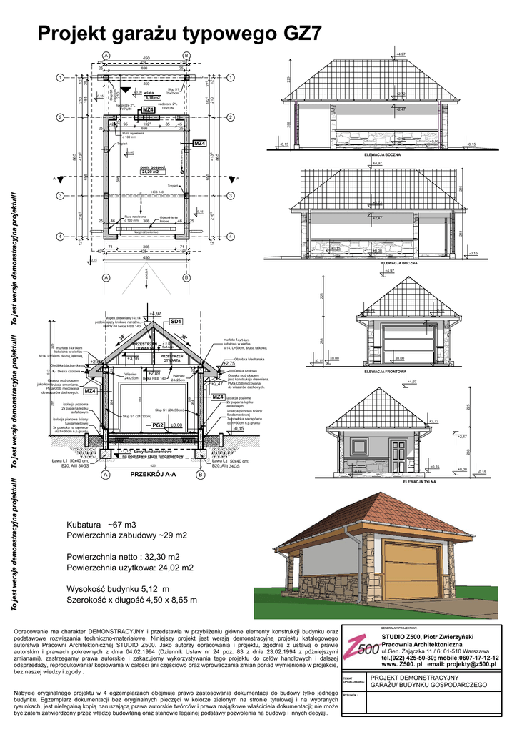 Projekt garażu typowego GZ7 125 25 210 210 185 ± 0,00 nadproże 2*L TYPU N Słup S1 25x25cm wiata 8,18 m2 +2,72 1825 210 Słup S1 25x25cm 450 - 0,15 1 275 125 125 25 1 +4,97 B 450 425 400 nadproże 2*L TYPU N MZ4 225 A 125 25 +2,47 425 1325 400 95 25 85 288 2 25 2 45 25 Rura wywiewna o 100 mm +0,00 4135 -0,15 +4,97 605 655 pom. gospod. 24,20 m2 A spadek 1% 225 3 2165 25 46 Rura nawiewna o 100 mm 308 Odwodnienie 46 liniowe 25 2165 +2,72 - 0,15 +2,47 288 Nadprożowieniec 308 425 125 125 125 4 71 71 125 +0,15 ±0,00 -0,15 450 - 0,15 ELEWACJA BOCZNA +4,97 spadek B 225 A +2,89 Belka HEB 140 Obróbka blacharska +2,75 Wieniec 24x25cm +2,47 izolacja pozioma 2x papa na lepiku asfaltowym MZ4 289 264 289 MZ4 Słup S1 (24x30cm) Słup S1 (24x30cm) izolacja pionowa ściany fundamentowej 3x powłoka na rapówce do h=30cm n.p.gruntu PG2 ±0,00 MZ1 -0,15 ±0,00 ±0,00 Deska czołowa Opaska pod okapem jako konstrukcja drewniana. Płyta OSB mocowana do wiazarów dachowych. -0,15 ELEWACJA FRONTOWA +4,97 izolacja pozioma 2x papa na lepiku asfaltowym izolacja pionowa ściany fundamentowej 3x powłoka na rapówce do h=30cm n.p.gruntu 225 25 Wieniec 24x25cm 264 Opaska pod okapem jako konstrukcja drewniana. Płyta OSB mocowana do wiazarów dachowych. murłata 14x14cm kotwiona w wieńcu M14, L=50cm, śrubą fajkową 2 x jętki 5x14cm 25 225 512 Deska czołowa ' PRZESTRZEŃ OTWARTA +3,56 +2,89 +2,47 38 PRZESTRZEŃ OTWARTA Obróbka blacharska +2,72 SD1 ' 38 murłata 14x14cm kotwiona w wieńcu M14, L=50cm, śrubą fajkową +2,72 +4,97 288 słupek drewniany14x14 podpierający krokwie narożne, oparty na belce HEB 140 +2,72 -0,15 +2,47 MZ1 288 -1,15 Ławy fundamentowe na podstawie rzutu fundamentów Ława Ł1 50x40 cm; B20; AIII 34GS Ława Ł1 50x40 cm; B20; AIII 34GS 425 A To jest wersja demonstracyjna projektu!!! HEB 140 4 287 To jest wersja demonstracyjna projektu!!! To jest wersja demonstracyjna projektu!!! Trzpień 3 -0,15 ELEWACJA BOCZNA 865 went. d=15cm 4135 ± 0,00 655 865 A +0,15 MZ4 Trzpień PRZEKRÓJ A-A B +0,15 -0,15 +0,00 -0,15 ELEWACJA TYLNA Kubatura ~67 m3 Powierzchnia zabudowy ~29 m2 Powierzchnia netto : 32,30 m2 Powierzchnia użytkowa: 24,02 m2 Wysokość budynku 5,12 m Szerokość x długość 4,50 x 8,65 m GENERALNY PROJEKTANT: Opracowanie ma charakter DEMONSTRACYJNY i przedstawia w przybliżeniu główne elementy konstrukcji budynku oraz podstawowe rozwiązania techniczno-materiałowe. Niniejszy projekt jest wersją demonstracyjną projektu katalogowego autorstwa Pracowni Architektonicznej STUDIO Z500. Jako autorzy opracowania i projektu, zgodnie z ustawą o prawie autorskim i prawach pokrewnych z dnia 04.02.1994 (Dziennik Ustaw nr 24 poz. 83 z dnia 23.02.1994 z późniejszymi zmianami), zastrzegamy prawa autorskie i zakazujemy wykorzystywania tego projektu do celów handlowych i dalszej odsprzedaży, reprodukowania/ kopiowania w całości ani częściowo oraz wprowadzania zmian ponad wymienione w projekcie, bez naszej wiedzy i zgody . STUDIO Z500, Piotr Zwierzyński Pracownia Architektoniczna ul.Gen. Zajączka 11 / 6; 01-510 Warszawa tel.(022) 425-50-30; mobile:0607-17-12-12 www. Z500. pl email: [email protected] TEMAT OPRACOWANIA: Nabycie oryginalnego projektu w 4 egzemplarzach obejmuje prawo zastosowania dokumentacji do budowy tylko jednego budynku. Egzemplarz dokumentacji bez oryginalnych pieczęci w kolorze zielonym na stronie tytułowej i na wybranych rysunkach, jest nielegalną kopią naruszającą prawa autorskie twórców i prawa majątkowe właściciela dokumentacji; nie może być zatem zatwierdzony przez władzę budowlaną oraz stanowić legalnej podstawy pozwolenia na budowę i innych decyzji. RYSUNEK : PROJEKT DEMONSTRACYJNY GARAŻU/ BUDYNKU GOSPODARCZEGO