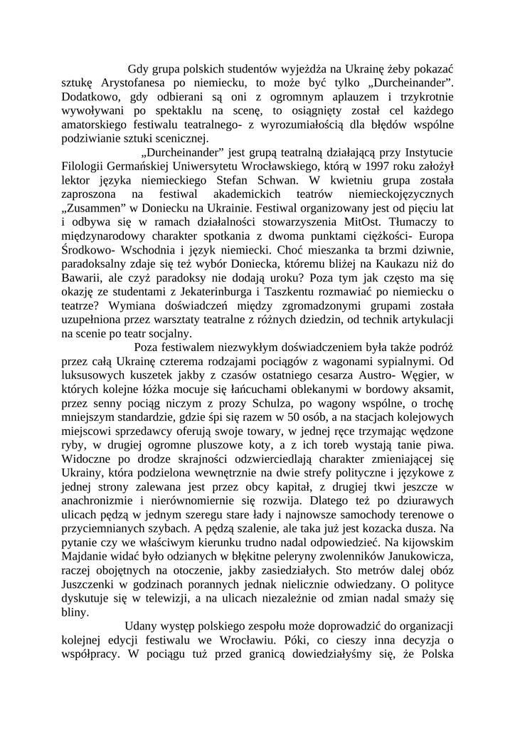 Gdy grupa polskich studentów wyjeżdża na Ukrainę żeby pokazać sztukę Arystofanesa po niemiecku, to może być tylko „Durcheinander”. Dodatkowo, gdy odbierani są oni z ogromnym aplauzem i trzykrotnie wywoływani po spektaklu na scenę, to osiągnięty został cel każdego amatorskiego festiwalu teatralnego- z wyrozumiałością dla błędów wspólne podziwianie sztuki scenicznej. „Durcheinander” jest grupą teatralną działającą przy Instytucie Filologii Germańskiej Uniwersytetu Wrocławskiego, którą w 1997 roku założył lektor języka niemieckiego Stefan Schwan. W kwietniu grupa została zaproszona na festiwal akademickich teatrów niemieckojęzycznych „Zusammen” w Doniecku na Ukrainie. Festiwal organizowany jest od pięciu lat i odbywa się w ramach działalności stowarzyszenia MitOst. Tłumaczy to międzynarodowy charakter spotkania z dwoma punktami ciężkości- Europa Środkowo- Wschodnia i język niemiecki. Choć mieszanka ta brzmi dziwnie, paradoksalny zdaje się też wybór Doniecka, któremu bliżej na Kaukazu niż do Bawarii, ale czyż paradoksy nie dodają uroku? Poza tym jak często ma się okazję ze studentami z Jekaterinburga i Taszkentu rozmawiać po niemiecku o teatrze? Wymiana doświadczeń między zgromadzonymi grupami została uzupełniona przez warsztaty teatralne z różnych dziedzin, od technik artykulacji na scenie po teatr socjalny. Poza festiwalem niezwykłym doświadczeniem była także podróż przez całą Ukrainę czterema rodzajami pociągów z wagonami sypialnymi. Od luksusowych kuszetek jakby z czasów ostatniego cesarza Austro- Węgier, w których kolejne łóżka mocuje się łańcuchami oblekanymi w bordowy aksamit, przez senny pociąg niczym z prozy Schulza, po wagony wspólne, o trochę mniejszym standardzie, gdzie śpi się razem w 50 osób, a na stacjach kolejowych miejscowi sprzedawcy oferują swoje towary, w jednej ręce trzymając wędzone ryby, w drugiej ogromne pluszowe koty, a z ich toreb wystają tanie piwa. Widoczne po drodze skrajności odzwierciedlają charakter zmieniającej się Ukrainy, która podzielona wewnętrznie na dwie strefy polityczne i językowe z jednej strony zalewana jest przez obcy kapitał, z drugiej tkwi jeszcze w anachronizmie i nierównomiernie się rozwija. Dlatego też po dziurawych ulicach pędzą w jednym szeregu stare łady i najnowsze samochody terenowe o przyciemnianych szybach. A pędzą szalenie, ale taka już jest kozacka dusza. Na pytanie czy we właściwym kierunku trudno nadal odpowiedzieć. Na kijowskim Majdanie widać było odzianych w błękitne peleryny zwolenników Janukowicza, raczej obojętnych na otoczenie, jakby zasiedziałych. Sto metrów dalej obóz Juszczenki w godzinach porannych jednak nielicznie odwiedzany. O polityce dyskutuje się w telewizji, a na ulicach niezależnie od zmian nadal smaży się bliny. Udany występ polskiego zespołu może doprowadzić do organizacji kolejnej edycji festiwalu we Wrocławiu. Póki, co cieszy inna decyzja o współpracy. W pociągu tuż przed granicą dowiedziałyśmy się, że Polska wspólnie z Ukrainą będzie organizować Mistrzostwa Europy w piłce nożnej. Dla nas z „Durcheinander” jest już po pierwszym gwizdku. Małgorzata Ćwikła