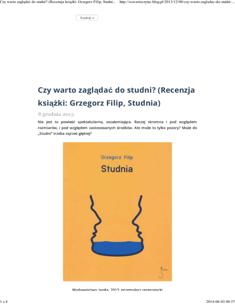 Czy warto zaglądać do studni? (Recenzja książki: Grzegorz Filip, Studni... http://cowartoczytac.blog.pl/2013/12/08/czy-warto-zagladac-do-studni-... 1z4 Czy warto zaglądać do studni? (Recenzja książki: Grzegorz Filip, Studnia) Nie jest to powieść spektakularna, oszałamiająca. Raczej skromna i pod względem rozmiarów, i pod względem zastosowanych środków. Ale może to tylko pozory? Może do „Studni” trzeba zajrzeć głębiej? Wydawnictwo: JanKa, 2013, egzemplarz recenzencki 2014-06-03 08:57 Czy warto zaglądać do studni? (Recenzja książki: Grzegorz Filip, Studni... http://cowartoczytac.blog.pl/2013/12/08/czy-warto-zagladac-do-studni-... 2z4 Grzegorz Filip opowiada o ojcu i córce, o ich pogubionym po śmierci żony/matki życiu. Akcja rozpoczyna się na lotnisku. Janusz czeka na przylot Grażyny, której nie widział dziesięć lat: „Tyle się tu dzieje, zupełnie inaczej niż tamtego dnia, gdy żegnał Grażynę przed odlotem do Anglii. Było to niedługo po śmierci Anny. Potrzebował córki jak nigdy przedtem, szukał jej towarzystwa, wieczornych powrotów oczekiwał z niecierpliwością, a ona wyjeżdżała! Z tego samego pewnie powodu, dla którego chciałby ją zatrzymać. Przywiązana była do matki, nie do niego, on w domu zadowalał się rolą z tła. Rządziły kobiety, to one codziennym dreptaniem nakręcały życie rodzinne. Został sam, obie opuściły go prawie równocześnie. Śmierć Anny i wyjazd córki zlewały się w pamięci w jedną dotkliwą ranę.” s.10 Dlaczego Grażyna wyjechała? Pyta ją oto w samolocie starszy syn, Julek. „Dlaczego wyjechała? Jak ma to dzieciom wytłumaczyć? Trudno patrzeć na ojca nieudacznika. Powie im to? Dopóki żyła mama, dom tętnił życiem. Nie znał ciszy, tej nieznośnej martwoty, która ogarnęła mieszkanie po jej śmierci. Wtedy ojciec się pogubił. Odszedł z uniwersytetu, żeby zmienić środowisko. Tak twierdził. Codziennie wysiadywał na cmentarzu. W niej szukał oparcia, a ona nie widziała się w takiej roli. Miała dość.” s. 20 Trudny do czytania temat, przynajmniej dla mnie. Ale w sumie to nie on dominuje w książce. Ogólnie „Studnia” to powieść o sensie życia rozpisana na kilka głosów, co jest jej największą zaletą, bo w dynamiczny sposób pokazuje odmienne postawy i punkty widzenia, nie tylko ojca i córki, ale również otaczających ich ludzi w różnym wieku. Przyjazd Grażyny staje się pretekstem do podsumowań, patrzenia wstecz i prób zmiany czegoś na lepsze. „Na poboczu” głównego wątku pojawia się wiele interesujących kwestii. Janusz rozmyśla np. o życiu na prowincji w rodzinnym mieście (jest to Lublin, choć ta nazwa nie pada), o polityce, która dzieli ludzi, o kulturze masowej i roli uniwersytetu we współczesnym świecie. Jest też mowa o pisaniu. Tajemnicza postać zwana Garbarkiem (bo z wyglądu przypomina Jana Garbarka, norweskiego saksofonistę) doradza nieszczęśliwemu bohaterowi pisanie pamiętnika (którego fragmenty może przeczytać czytelnik). Tytułowa „studnia” jest bardzo ważnym i symbolicznym elementem książki, pojawiającym się wprost lub pośrednio dość często. Całe szczęście jej rola nie została przez autora określona dosłownie, sami możemy nadać jej znaczenie podczas lektury lub po niej. Czy warto zaglądać do studni? Czy warto przyglądać się przeszłości, temu, co było i sobie oraz temu, co jest? Moim zdaniem na pewno warto przeczytać „Studnię” Grzegorza Filipa i stanąć oko w oko z tymi pytaniami. Ocena: 5/6 2014-06-03 08:57 Czy warto zaglądać do studni? (Recenzja książki: Grzegorz Filip, Studni... http://cowartoczytac.blog.pl/2013/12/08/czy-warto-zagladac-do-studni-... 3z4 P OW I ĄZA NE W P I SY : 1. Słońce w pochmurny dzień (Recenzja książki: Monika Szwaja, Anioł w kapeluszu) 2. Arcydzieło? (Recenzja książki: Charlotte Brontë, Villette) 3. Mrok, samotność, wyobcowanie (Recenzja książki: Johan Theorin, Święty Psychol) 4. Przyglądanie się wierszom z bliska (Recenzja książki: Waldemar Smaszcz, Serce nie do pary. O księdzu Janie Twardowskim i jego wierszach) 5. Rok Tuwima – 2013 (Recenzja: Mariusz Urbanek, Tuwim. Wylękniony bluźnierca) Lubię to! 0 KATEGORIE: Powieści polskie TAGI: 6 Komentarze Napisz komentarz → ~Dofi 8 grudnia 2013 o 18:01 Lubię, kiedy takie trudne tematy są pokazane z kilku stron… Beata Kobierowska 8 grudnia 2013 o 18:35 To sztuka ukazać trudny temat tak, żeby chciało się o nim czytać. Grzegorzowi Filipowi się udało Nie umiem tego ubrać w słowa, ale „Studnia” jest taka „inna” od polskiej prozy współczesnej. ~monweg 10 grudnia 2013 o 11:36 Nie znam autora, lecz po tym co przeczytałam u Ciebie warto się „zaznajomić” z jego twórczością 2014-06-03 08:57