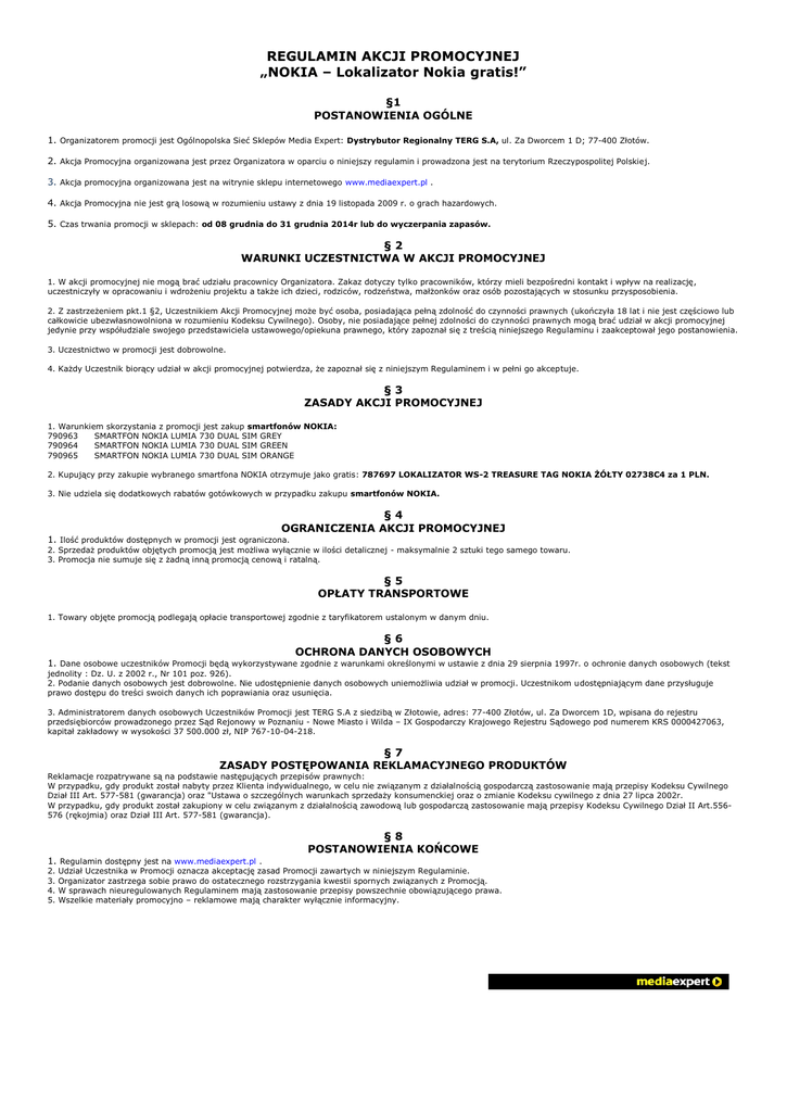 REGULAMIN AKCJI PROMOCYJNEJ „NOKIA – Lokalizator Nokia gratis!” §1 POSTANOWIENIA OGÓLNE 1. Organizatorem promocji jest Ogólnopolska Sieć Sklepów Media Expert: Dystrybutor Regionalny TERG S.A, ul. Za Dworcem 1 D; 77-400 Złotów. 2. Akcja Promocyjna organizowana jest przez Organizatora w oparciu o niniejszy regulamin i prowadzona jest na terytorium Rzeczypospolitej Polskiej. 3. Akcja promocyjna organizowana jest na witrynie sklepu internetowego www.mediaexpert.pl . 4. Akcja Promocyjna nie jest grą losową w rozumieniu ustawy z dnia 19 listopada 2009 r. o grach hazardowych. 5. Czas trwania promocji w sklepach: od 08 grudnia do 31 grudnia 2014r lub do wyczerpania zapasów. §2 WARUNKI UCZESTNICTWA W AKCJI PROMOCYJNEJ 1. W akcji promocyjnej nie mogą brać udziału pracownicy Organizatora. Zakaz dotyczy tylko pracowników, którzy mieli bezpośredni kontakt i wpływ na realizację, uczestniczyły w opracowaniu i wdrożeniu projektu a także ich dzieci, rodziców, rodzeństwa, małżonków oraz osób pozostających w stosunku przysposobienia. 2. Z zastrzeżeniem pkt.1 §2, Uczestnikiem Akcji Promocyjnej może być osoba, posiadająca pełną zdolność do czynności prawnych (ukończyła 18 lat i nie jest częściowo lub całkowicie ubezwłasnowolniona w rozumieniu Kodeksu Cywilnego). Osoby, nie posiadające pełnej zdolności do czynności prawnych mogą brać udział w akcji promocyjnej jedynie przy współudziale swojego przedstawiciela ustawowego/opiekuna prawnego, który zapoznał się z treścią niniejszego Regulaminu i zaakceptował jego postanowienia. 3. Uczestnictwo w promocji jest dobrowolne. 4. Każdy Uczestnik biorący udział w akcji promocyjnej potwierdza, że zapoznał się z niniejszym Regulaminem i w pełni go akceptuje. §3 ZASADY AKCJI PROMOCYJNEJ 1. Warunkiem skorzystania z promocji jest zakup smartfonów NOKIA: 790963 SMARTFON NOKIA LUMIA 730 DUAL SIM GREY 790964 SMARTFON NOKIA LUMIA 730 DUAL SIM GREEN 790965 SMARTFON NOKIA LUMIA 730 DUAL SIM ORANGE 2. Kupujący przy zakupie wybranego smartfona NOKIA otrzymuje jako gratis: 787697 LOKALIZATOR WS-2 TREASURE TAG NOKIA ŻÓŁTY 02738C4 za 1 PLN. 3. Nie udziela się dodatkowych rabatów gotówkowych w przypadku zakupu smartfonów NOKIA. §4 OGRANICZENIA AKCJI PROMOCYJNEJ 1. Ilość produktów dostępnych w promocji jest ograniczona. 2. Sprzedaż produktów objętych promocją jest możliwa wyłącznie w ilości detalicznej - maksymalnie 2 sztuki tego samego towaru. 3. Promocja nie sumuje się z żadną inną promocją cenową i ratalną. §5 OPŁATY TRANSPORTOWE 1. Towary objęte promocją podlegają opłacie transportowej zgodnie z taryfikatorem ustalonym w danym dniu. §6 OCHRONA DANYCH OSOBOWYCH 1. Dane osobowe uczestników Promocji będą wykorzystywane zgodnie z warunkami określonymi w ustawie z dnia 29 sierpnia 1997r. o ochronie danych osobowych (tekst jednolity : Dz. U. z 2002 r., Nr 101 poz. 926). 2. Podanie danych osobowych jest dobrowolne. Nie udostępnienie danych osobowych uniemożliwia udział w promocji. Uczestnikom udostępniającym dane przysługuje prawo dostępu do treści swoich danych ich poprawiania oraz usunięcia. 3. Administratorem danych osobowych Uczestników Promocji jest TERG S.A z siedzibą w Złotowie, adres: 77-400 Złotów, ul. Za Dworcem 1D, wpisana do rejestru przedsiębiorców prowadzonego przez Sąd Rejonowy w Poznaniu - Nowe Miasto i Wilda – IX Gospodarczy Krajowego Rejestru Sądowego pod numerem KRS 0000427063, kapitał zakładowy w wysokości 37 500.000 zł, NIP 767-10-04-218. §7 ZASADY POSTĘPOWANIA REKLAMACYJNEGO PRODUKTÓW Reklamacje rozpatrywane są na podstawie następujących przepisów prawnych: W przypadku, gdy produkt został nabyty przez Klienta indywidualnego, w celu nie związanym z działalnością gospodarczą zastosowanie mają przepisy Kodeksu Cywilnego Dział III Art. 577-581 (gwarancja) oraz "Ustawa o szczególnych warunkach sprzedaży konsumenckiej oraz o zmianie Kodeksu cywilnego z dnia 27 lipca 2002r. W przypadku, gdy produkt został zakupiony w celu związanym z działalnością zawodową lub gospodarczą zastosowanie mają przepisy Kodeksu Cywilnego Dział II Art.556576 (rękojmia) oraz Dział III Art. 577-581 (gwarancja). 1. Regulamin dostępny jest na www.mediaexpert.pl . 2. 3. 4. 5. §8 POSTANOWIENIA KOŃCOWE Udział Uczestnika w Promocji oznacza akceptację zasad Promocji zawartych w niniejszym Regulaminie. Organizator zastrzega sobie prawo do ostatecznego rozstrzygania kwestii spornych związanych z Promocją. W sprawach nieuregulowanych Regulaminem mają zastosowanie przepisy powszechnie obowiązującego prawa. Wszelkie materiały promocyjno – reklamowe mają charakter wyłącznie informacyjny.